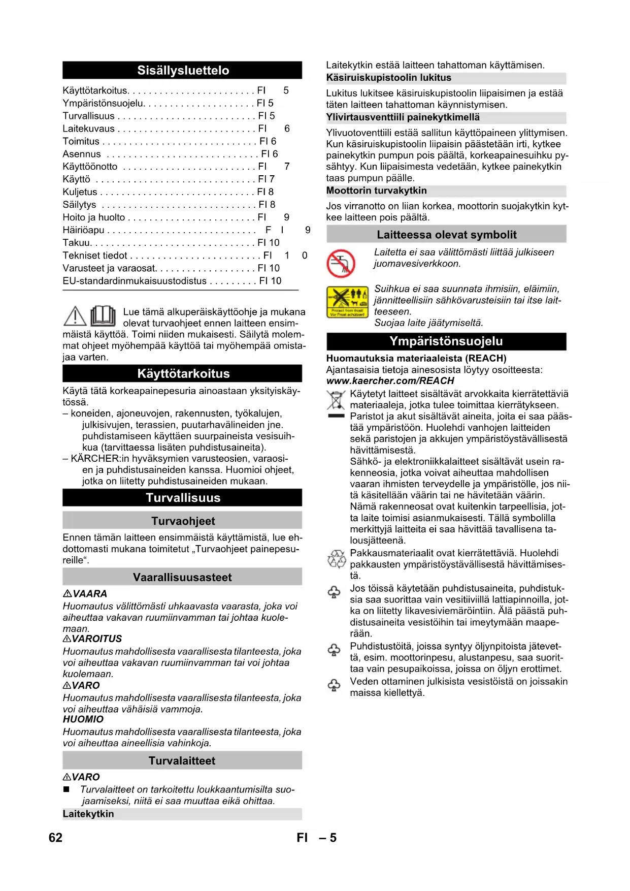 92 dB(A) Tekniska ändringar förbehålls. Tillbehör och reservdelar Försäkran om EU-överensstämmelse Produkt: Högtryckstvätt Typ: 1.324-xxx Tillämpliga EU-direktiv 2000/14/EG 2014/30/EU 2006/42/EG (+2009/127/EG) 2011/65/EU Tillämpade harmoniserade normer EN 50581 EN 55014–1: 2006+A1: 2009+A2: 2011 EN 55014–2: 1997+A1: 2001+A2: 2008 EN 60335–1 EN 60335–2–79 EN 61000–3–2: 2014 EN 61000–3–3: 2013 EN 62233: 2008 Tillämpad metod för överensstämmelsevärdering 2000/14/EG: Bilaga V Ljudeffektsnivå dB(A) Upmätt: 89 Garanterad: 92 Winnenden, 2016/01/01 CEO Head of Approbation 61SV– 5 Lue tämä alkuperäiskäyttöohje ja mukana olevat turvaohjeet ennen laitteen ensim- mäistä käyttöä. Toimi niiden mukaisesti. Säilytä molem- mat ohjeet myöhempää käyttöä tai myöhempää omista- jaa varten. Käytä tätä korkeapainepesuria ainoastaan yksityiskäy- tössä. – koneiden, ajoneuvojen, rakennusten, työkalujen, julkisivujen, terassien, puutarhavälineiden jne. puhdistamiseen käyttäen suurpaineista vesisuih- kua (tarvittaessa lisäten puhdistusaineita). – KÄRCHER:in hyväksymien varusteosien, varaosi- en ja puhdistusaineiden kanssa. Huomioi ohjeet, jotka on liitetty puhdistusaineiden mukaan. Ennen tämän laitteen ensimmäistä käyttämistä, lue eh- dottomasti mukana toimitetut „Turvaohjeet painepesu- reille“. VAARA Huomautus välittömästi uhkaavasta vaarasta, joka voi aiheuttaa vakavan ruumiinvamman tai johtaa kuole- maan. 몇 VAROITUS Huomautus mahdollisesta vaarallisesta tilanteesta, joka voi aiheuttaa vakavan ruumiinvamman tai voi johtaa kuolemaan. 몇 VARO Huomautus mahdollisesta vaarallisesta tilanteesta, joka voi aiheuttaa vähäisiä vammoja. HUOMIO Huomautus mahdollisesta vaarallisesta tilanteesta, joka voi aiheuttaa aineellisia vahinkoja. 몇 VARO Turvalaitteet on tarkoitettu loukkaantumisilta suo- jaamiseksi, niitä ei saa muuttaa eikä ohittaa. Laitekytkin estää laitteen tahattoman käyttämisen. Lukitus lukitsee käsiruiskupistoolin liipaisimen ja estää täten laitteen tahattoman käynnistymisen. Ylivuotoventtiili estää sallitun käyttöpaineen ylittymisen. Kun käsiruiskupistoolin liipaisin päästetään irti, kytkee painekytkin pumpun pois päältä, korkeapainesuihku py- sähtyy. Kun liipaisimesta vedetään, kytkee painekytkin taas pumpun päälle. Jos virranotto on liian korkea, moottorin suojakytkin kyt- kee laitteen pois päältä. Huomautuksia materiaaleista (REACH) Ajantasaisia tietoja ainesosista löytyy osoitteesta: www.kaercher.com/REACH Sisällysluettelo Käyttötarkoitus. . . . . . . . . . . . . . . . . . . . . . . . FI5 Ympäristönsuojelu. . . . . . . . . . . . . . . . . . . . . FI 5 Turvallisuus . . . . . . . . . . . . . . . . . . . . . . . . . . FI 5 Laitekuvaus . . . . . . . . . . . . . . . . . . . . . . . . . . FI6 Toimitus . . . . . . . . . . . . . . . . . . . . . . . . . . . . . FI 6 Asennus . . . . . . . . . . . . . . . . . . . . . . . . . . . . FI 6 Käyttöönotto . . . . . . . . . . . . . . . . . . . . . . . . . FI7 Käyttö . . . . . . . . . . . . . . . . . . . . . . . . . . . . . . FI 7 Kuljetus . . . . . . . . . . . . . . . . . . . . . . . . . . . . . FI 8 Säilytys . . . . . . . . . . . . . . . . . . . . . . . . . . . . . FI 8 Hoito ja huolto . . . . . . . . . . . . . . . . . . . . . . . . FI9 Häiriöapu . . . . . . . . . . . . . . . . . . . . . . . . . . . .FI 9 Takuu. . . . . . . . . . . . . . . . . . . . . . . . . . . . . . . FI 10 Tekniset tiedot . . . . . . . . . . . . . . . . . . . . . . . . FI10 Varusteet ja varaosat. . . . . . . . . . . . . . . . . . . FI 10 EU-standardinmukaisuustodistus . . . . . . . . . FI 10 Käyttötarkoitus Turvallisuus Turvaohjeet Vaarallisuusasteet Turvalaitteet Laitekytkin Käsiruiskupistoolin lukitus Ylivirtausventtiili painekytkimellä Moottorin turvakytkin Laitteessa olevat symbolit Laitetta ei saa välittömästi liittää julkiseen juomavesiverkkoon. Suihkua ei saa suunnata ihmisiin, eläimiin, jännitteellisiin sähkövarusteisiin tai itse lait- teeseen. Suojaa laite jäätymiseltä. Ympäristönsuojelu Käytetyt laitteet sisältävät arvokkaita kierrätettäviä materiaaleja, jotka tulee toimittaa kierrätykseen. Paristot ja akut sisältävät aineita, joita ei saa pääs- tää ympäristöön. Huolehdi vanhojen laitteiden sekä paristojen ja akkujen ympäristöystävällisestä hävittämisestä. Sähkö- ja elektroniikkalaitteet sisältävät usein ra- kenneosia, jotka voivat aiheuttaa mahdollisen vaaran ihmisten terveydelle ja ympäristölle, jos nii- tä käsitellään väärin tai ne hävitetään väärin. Nämä rakenneosat ovat kuitenkin tarpeellisia, jot- ta laite toimisi asianmukaisesti. Tällä symbolilla merkittyjä laitteita ei saa hävittää tavallisena ta- lousjätteenä. Pakkausmateriaalit ovat kierrätettäviä. Huolehdi pakkausten ympäristöystävällisestä hävittämises- tä. Jos töissä käytetään puhdistusaineita, puhdistuk- sia saa suorittaa vain vesitiiviillä lattiapinnoilla, jot- ka on liitetty likavesiviemäröintiin. Älä päästä puh- distusaineita vesistöihin tai imeytymään maape- rään. Puhdistustöitä, joissa syntyy öljynpitoista jätevet- tä, esim. moottorinpesu, alustanpesu, saa suorit- taa vain pesupaikoissa, joissa on öljyn erottimet. Veden ottaminen julkisista vesistöistä on joissakin maissa kiellettyä. 62 FI– 6 Tässä käyttöohjeessa kuvataan maksimivarustus. Mal- lien varustetaso vaihtelee, katso kuvaus laatikon kyljes- tä. Kuvat, katso avattavalla kansisivu 4 1 Tulovesiliitäntä 2 Suodattimella varustettu vesiliitäntä 3 Korkeapaineletku 4 Letkujohde 5 Säilytyspaikka ruiskuputkille 6 Käsiruiskupistoolin säilytyspaikka / parkkipaikka 7 Liitäntä Plug 'n' Clean -puhdistusaineelle 8 Kantokahva 9 Kuljetuskahva, ulosvedettävä 10 Letkunpidin 11 Korkeapaineliitäntä 12 Laitekytkin „0/OFF“ / „I/ON“ 13 Verkkojohto, jossa on verkkopistoke 14 Varustelaatikko 15 Verkon kiinnityskouk