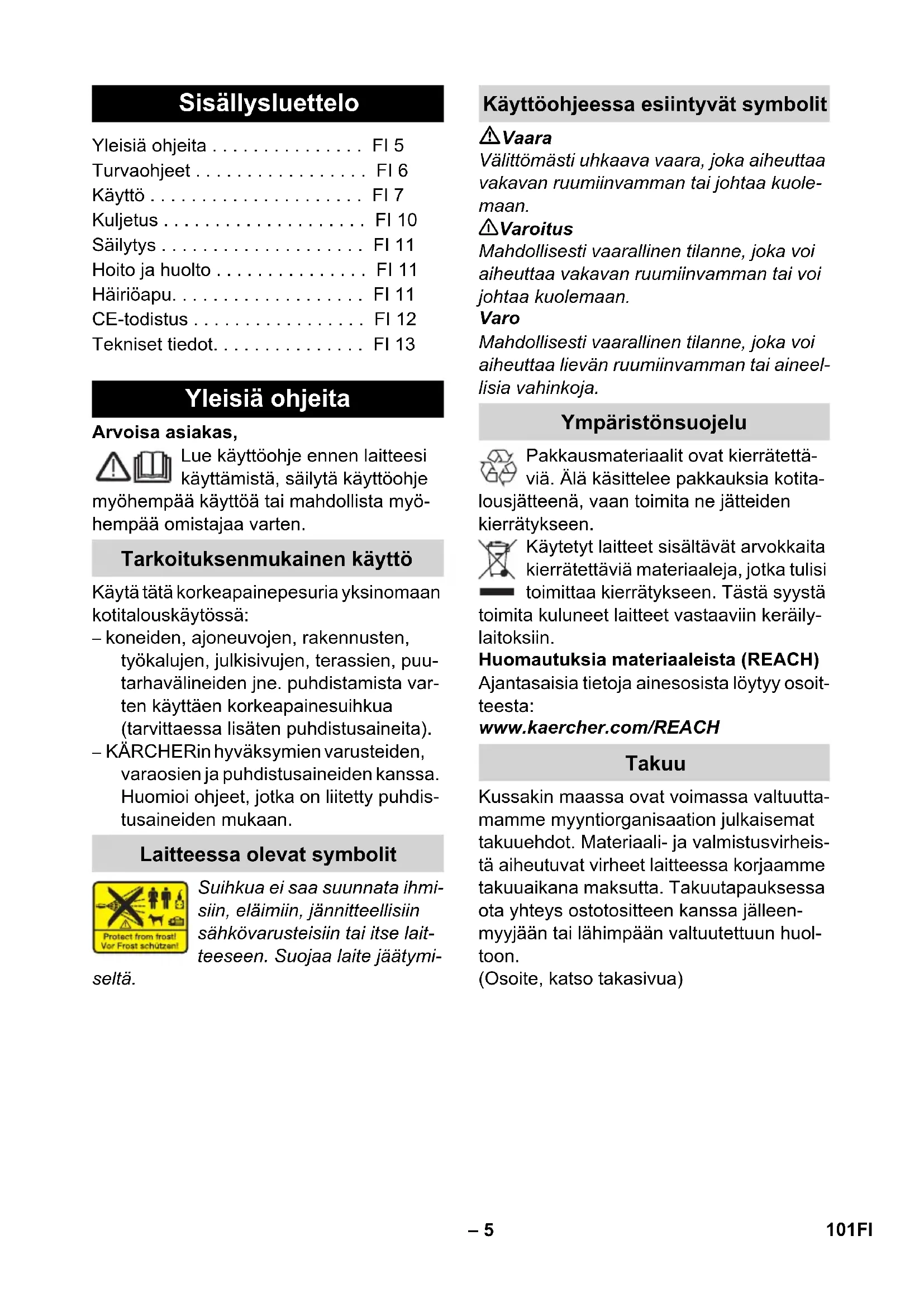 dB(A) 972 100 SVSuomi – 5 Arvoisa asiakas, Lue käyttöohje ennen laitteesi käyttämistä, säilytä käyttöohje myöhempää käyttöä tai mahdollista myö- hempää omistajaa varten. Käytä tätä korkeapainepesuria yksinomaan kotitalouskäytössä: – koneiden, ajoneuvojen, rakennusten, työkalujen, julkisivujen, terassien, puu- tarhavälineiden jne. puhdistamista var- ten käyttäen korkeapainesuihkua (tarvittaessa lisäten puhdistusaineita). – KÄRCHERin hyväksymien varusteiden, varaosien ja puhdistusaineiden kanssa. Huomioi ohjeet, jotka on liitetty puhdis- tusaineiden mukaan. Suihkua ei saa suunnata ihmi- siin, eläimiin, jännitteellisiin sähkövarusteisiin tai itse lait- teeseen. Suojaa laite jäätymi- seltä. Vaara Välittömästi uhkaava vaara, joka aiheuttaa vakavan ruumiinvamman tai johtaa kuole- maan. 몇 Varoitus Mahdollisesti vaarallinen tilanne, joka voi aiheuttaa vakavan ruumiinvamman tai voi johtaa kuolemaan. Varo Mahdollisesti vaarallinen tilanne, joka voi aiheuttaa lievän ruumiinvamman tai aineel- lisia vahinkoja. Pakkausmateriaalit ovat kierrätettä- viä. Älä käsittelee pakkauksia kotita- lousjätteenä, vaan toimita ne jätteiden kierrätykseen. Käytetyt laitteet sisältävät arvokkaita kierrätettäviä materiaaleja, jotka tulisi toimittaa kierrätykseen. Tästä syystä toimita kuluneet laitteet vastaaviin keräily- laitoksiin. Huomautuksia materiaaleista (REACH) Ajantasaisia tietoja ainesosista löytyy osoit- teesta: www.kaercher.com/REACH Kussakin maassa ovat voimassa valtuutta- mamme myyntiorganisaation julkaisemat takuuehdot. Materiaali- ja valmistusvirheis- tä aiheutuvat virheet laitteessa korjaamme takuuaikana maksutta. Takuutapauksessa ota yhteys ostotositteen kanssa jälleen- myyjään tai lähimpään valtuutettuun huol- toon. (Osoite, katso takasivua) Sisällysluettelo Yleisiä ohjeita . . . . . . . . . . . . . . . FI 5 Turvaohjeet . . . . . . . . . . . . . . . . . FI 6 Käyttö . . . . . . . . . . . . . . . . . . . . . FI 7 Kuljetus . . . . . . . . . . . . . . . . . . . . FI 10 Säilytys . . . . . . . . . . . . . . . . . . . . FI 11 Hoito ja huolto . . . . . . . . . . . . . . . FI 11 Häiriöapu. . . . . . . . . . . . . . . . . . . FI 11 CE-todistus . . . . . . . . . . . . . . . . . FI 12 Tekniset tiedot. . . . . . . . . . . . . . . FI 13 Yleisiä ohjeita Tarkoituksenmukainen käyttö Laitteessa olevat symbolit Käyttöohjeessa esiintyvät symbolit Ympäristönsuojelu Takuu 101FI– 6 Vaara Älä koskaan tartu märillä käsillä virta- pistokkeeseen. Älä ota laitetta käyttöön, jos verkkojohto tai laitteen tärkeät osat, esim. korkea- paineletku, suihkupistooli (-kahva) tai turvalaitteet ovat vaurioituneet. Tarkasta aina ennen käyttöä, että säh- kökaapeli ja verkkopistoke ovat ehjät. Anna valtuutetun huollon/sähköalan ammattilaisen välittömästi vaihtaa vau- rioitunut sähkökaapeli. Tarkasta korkeapaineletkun kunto aina ennen käyttöä. Vaihda vaurioitunut kor- keapaineletku välittömästi. Käyttö räjähdysalttiilla alueilla on kiellet- ty. Käytettäessä laitetta vaara-alueilla (esim. huoltoasemilla) on noudatettava vastaavia turvallisuusmääräyksiä. Epäasianmukaisesti käytettyinä kor- keapainesuihkut voivat olla vaarallisia. Suihkua ei saa suunnata ihmisiin, eläi- miin, aktiivisiin sähkövarusteisiin tai itse laitteeseen. Älä suuntaa korkeapainesuihkua mui- hin ihmisiin tai itseesi vaatteiden tai kenkien puhdistamiseksi. Älä ruiskuta esineitä, jotka sisältävät terveydelle haitallisia aineita (esim. as- besti). Korkeapainesuihku voi vaurioittaa ajo- neuvon renkaita/renkaiden venttiilejä, jolloin ne saattavat puhjeta. Ensimmäi- nen merkki siitä on renkaan värin muut- tuminen. Vaurioituneet ajoneuvon renkaat/ renkaiden venttiilit ovat hen- genvaarallisia. Pidä puhdistuksessa vä- hintään 30 cm suihkutusetäisyys! Räjähdysvaara! Älä suihkuta mitään palavia nesteitä. Älä koskaan ime liuotinpitoisia nesteitä tai laimentamattomia happoja tai liuotti- mia! Niihin kuuluvat esim. bensiini, vä- rinohennusaineet tai polttoöljy. Ruiskutussumu on erittäin herkästi syt- tyvää, helposti räjähtävää ja myrkyllistä. Älä käytä asetonia, laimentamattomia happoja eikä liuottimia, koska ne syö- vyttävät laitteessa käytettyjä materiaa- leja. 몇 Varoitus Verkkojohdon ja jatkojohdon liittimen on oltava vesitiiviitä, eivätkä ne saa maata vedessä. Tarkoitukseen sopimattomat jatkojoh- dot voivat olla vaarallisia. Käytä ulkona vain tarkoitukseen hyväksyttyjä ja vas- taavasti merkittyjä jatkojohtoja, joissa on riittävä johdon poikkileikkaus.