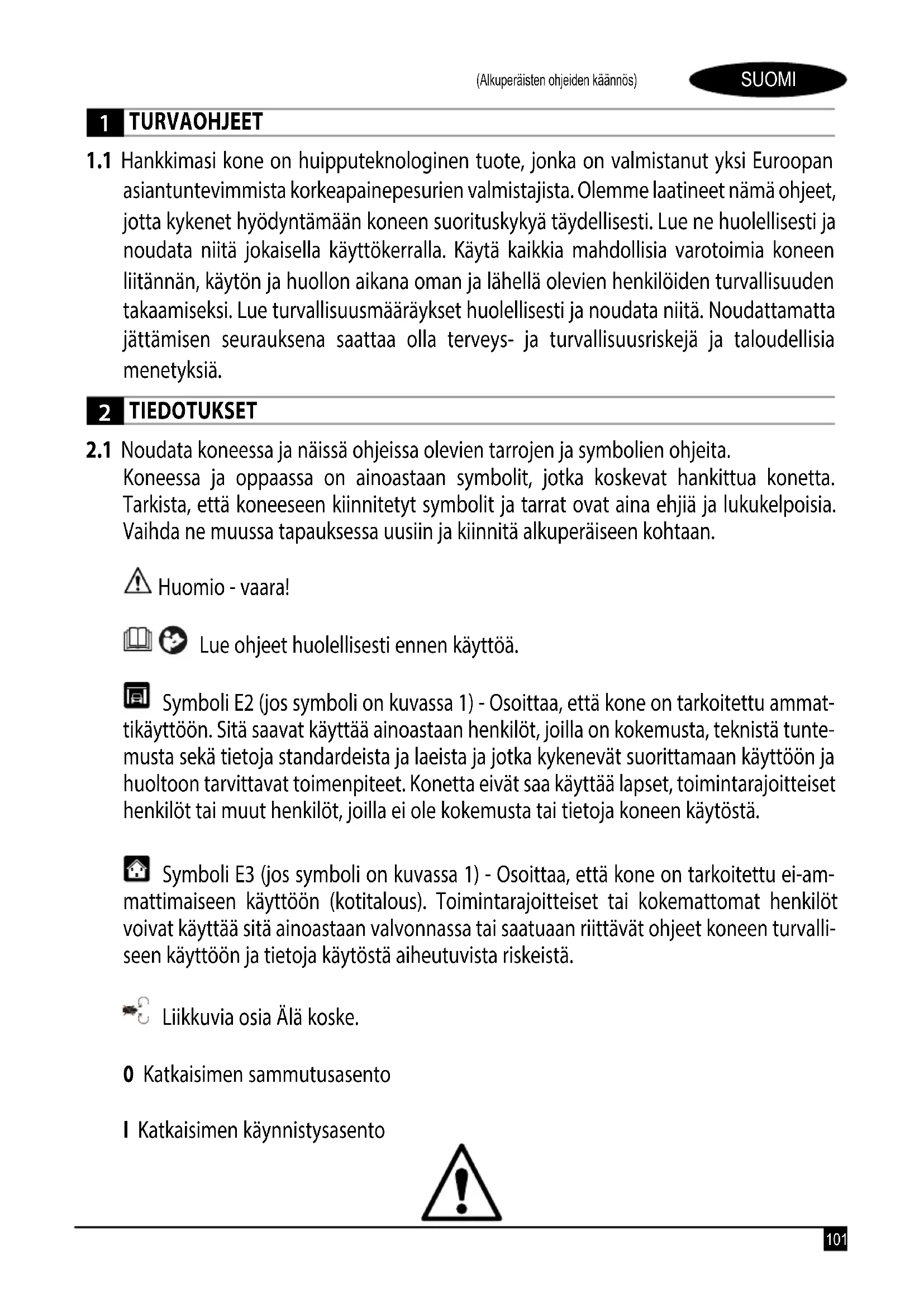 Koneessa ja oppaassa on ainoastaan symbolit, jotka koskevat hankittua konetta. Tarkista, että koneeseen kiinnitetyt symbolit ja tarrat ovat aina ehjiä ja lukukelpoisia. Vaihda ne muussa tapauksessa uusiin ja kiinnitä alkuperäiseen kohtaan. Huomio - vaara! Lue ohjeet huolellisesti ennen käyttöä. Symboli E2 (jos symboli on kuvassa 1) - Osoittaa, että kone on tarkoitettu ammat- tikäyttöön. Sitä saavat käyttää ainoastaan henkilöt, joilla on kokemusta, teknistä tunte- musta sekä tietoja standardeista ja laeista ja jotka kykenevät suorittamaan käyttöön ja huoltoon tarvittavat toimenpiteet. Konetta eivät saa käyttää lapset, toimintarajoitteiset henkilöt tai muut henkilöt, joilla ei ole kokemusta tai tietoja koneen käytöstä. Symboli E3 (jos symboli on kuvassa 1) - Osoittaa, että kone on tarkoitettu ei-am- mattimaiseen käyttöön (kotitalous). Toimintarajoitteiset tai kokemattomat henkilöt voivat käyttää sitä ainoastaan valvonnassa tai saatuaan riittävät ohjeet koneen turvalli