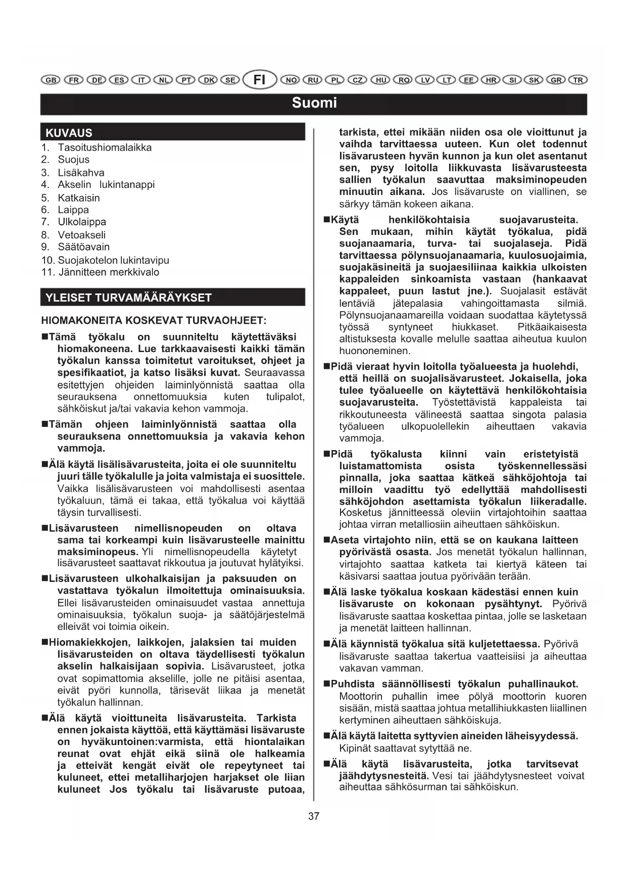 HIOMAKONEITA KOSKEVAT TURVAOHJEET: Tämä työkalu on suunniteltu käytettäväksi hiomakoneena. Lue tarkkaavaisesti kaikki tämän työkalun kanssa toimitetut varoitukset, ohjeet ja spesifikaatiot, ja katso lisäksi kuvat. Seuraavassa esitettyjen ohjeiden laiminlyönnistä saattaa olla seurauksena onnettomuuksia kuten tulipalot, sähköiskut ja/tai vakavia kehon vammoja. Tämän ohjeen laiminlyönnistä saattaa olla seurauksena onnettomuuksia ja vakavia kehon vammoja. Älä käytä lisälisävarusteita, joita ei ole suunniteltu juuri tälle työkalulle ja joita valmistaja ei suosittele. Vaikka lisälisävarusteen voi mahdollisesti asentaa työkaluun, tämä ei takaa, että työkalua voi käyttää täysin turvallisesti. Lisävarusteen nimellisnopeuden on oltava sama tai korkeampi kuin lisävarusteelle mainittu maksiminopeus. Yli nimellisnopeudella käytetyt lisävarusteet saattavat rikkoutua ja joutuvat hylätyiksi. Lisävarusteen ulkohalkaisijan ja paksuuden on vastattava työkalun ilmoitettuja ominaisuuksia. Ellei lisävarusteiden ominaisuudet vastaa annettuja ominaisuuksia, työkalun suoja- ja säätöjärjestelmä elleivät voi toimia oikein. Hiomakiekkojen, laikkojen, jalaksien tai muiden lisävarusteiden on oltava täydellisesti työkalun akselin halkaisijaan sopivia. Lisävarusteet, jotka ovat sopimattomia akselille, jolle ne pitäisi asentaa, eivät pyöri kunnolla, tärisevät liikaa ja menetät työkalun hallinnan. Älä käytä vioittuneita lisävarusteita. Tarkista ennen jokaista käyttöä, että käyttämäsi lisävaruste on hyväkuntoinen:varmista, että hiontalaikan reunat ovat ehjät eikä siinä ole halkeamia ja etteivät kengät eivät ole repeytyneet tai kuluneet, ettei metalliharjojen harjakset ole liian kuluneet Jos työkalu tai lisävaruste putoaa, tarkista, ettei mikään niiden osa ole vioittunut ja vaihda tarvittaessa uuteen. Kun olet todennut lisävarusteen hyvän kunnon ja kun olet asentanut sen, pysy loitolla liikkuvasta lisävarusteesta sallien työkalun saavuttaa maksiminopeuden minuutin aikana. Jos lisävaruste on viallinen, se särkyy tämän kokeen aikana. Käytä henkilökohtaisia suojavarusteita. Sen mukaan, mihin käytät työkalua, pidä suojanaamaria, turva- tai suojalaseja. Pidä tarvittaessa pölynsuojanaamaria, kuulosuojaimia, suojakäsineitä ja suojaesiliinaa kaikkia ulkoisten kappaleiden sinkoamista vastaan (hankaavat kappaleet, puun lastut jne.). Suojalasit estävät lentäviä jätepalasia vahingoittamasta silmiä. Pölynsuojanaamareilla voidaan suodattaa käytetyssä työssä syntyneet hiukkaset. Pitkäaikaisesta altistuksesta kovalle melulle saattaa aiheutua kuulon huononeminen. Pidä vieraat hyvin loitolla työalueesta ja huolehdi, että heillä on suojalisävarusteet. Jokaisella, joka tulee työalueelle on käytettävä henkilökohtaisia suojavarusteita. Työstettävistä kappaleista tai rikkoutuneesta välineestä saattaa singota palasia työalueen ulkopuolellekin aiheuttaen vakavia vammoja. Pidä työkalusta kiinni vain eristetyistä luistamattomista osista työskennellessäsi pinnalla, joka saattaa kätkeä sähköjohtoja tai milloin vaadittu työ edellyttää mahdollisesti sähköjohdon asettamista työkalun liikeradalle. Kosketus jännitteessä oleviin virtajohtoihin saattaa johtaa virran metalliosiin aiheuttaen sähköiskun. Aseta virtajohto niin, että se on kaukana laitteen pyörivästä osasta. Jos menetät työkalun hallinnan, virtajohto saattaa katketa tai kiertyä käteen tai käsivarsi saattaa joutua pyörivään terään. Älä laske työkalua koskaan kädestäsi ennen kuin lisävaruste on kokonaan pysähtynyt. Pyörivä lisävaruste saattaa koskettaa pintaa, jolle se lasketaan ja menetät laitteen hallinnan. Älä käynnistä työkalua sitä kuljetettaessa. Pyörivä lisävaruste saattaa takertua vaatteisiisi ja aiheuttaa vakavan vamman. Puhdista säännöllisesti työkalun puhallinaukot. Moottorin puhallin imee pölyä moottorin kuoren sisään, mistä saattaa johtua metallihiukkasten liiallinen kertyminen aiheuttaen sähköiskuja. Älä käytä laitetta syttyvien aineiden läheisyydessä. Kipinät saattavat sytyttää ne. Älä käytä lisävarusteita, jotka tarvitsevat jäähdytysnesteitä. Vesi tai jäähdytysnesteet voivat aiheuttaa sähkösurman tai sähköiskun.38 Suomi