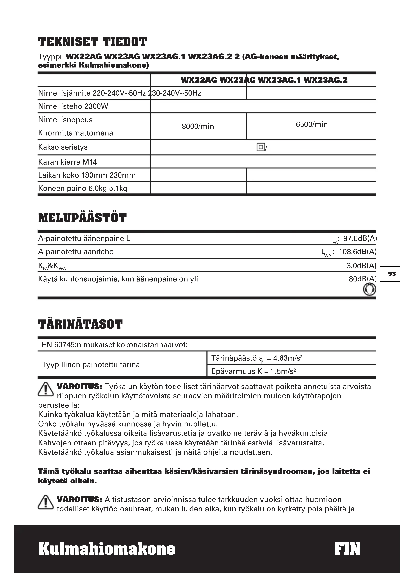 Epävarmuus K = 1.5m/s² VAROITUS: Työkalun käytön todelliset tärinäarvot saattavat poiketa annetuista arvoista riippuen työkalun käyttötavoista seuraavien määritelmien muiden käyttötapojen perusteella: Kuinka työkalua käytetään ja mitä materiaaleja lahataan. Onko työkalu hyvässä kunnossa ja hyvin huollettu. Käytetäänkö työkalussa oikeita lisävarustetia ja ovatko ne teräviä ja hyväkuntoisia. Kahvojen otteen pitävyys, jos työkalussa käytetään tärinää estäviä lisävarusteita. Käytetäänkö työkalua asianmukaisesti ja näitä ohjeita noudattaen. Tämä työkalu saattaa aiheuttaa käsien/käsivarsien tärinäsyndrooman, jos laitetta ei käytetä oikein. VAROITUS: Altistustason arvioinnissa tulee tarkkuuden vuoksi ottaa huomioon todelliset käyttöolosuhteet, mukan lukien aika, kun työkalu on kytketty pois päältä jaKulmahiomakone FIN