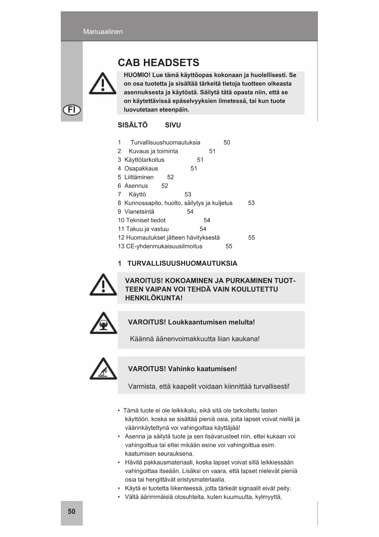Manuaalinen HUOMIO! Lue tämä käyttöopas kokonaan ja huolellisesti. Se on osa tuotetta ja sisältää tärkeitä tietoja tuotteen oikeasta asennuksesta ja käytöstä. Säilytä tätä opasta niin, että se on käytettävissä epäselvyyksien ilmetessä, tai kun tuote luovutetaan eteenpäin. CAB HEADSETS