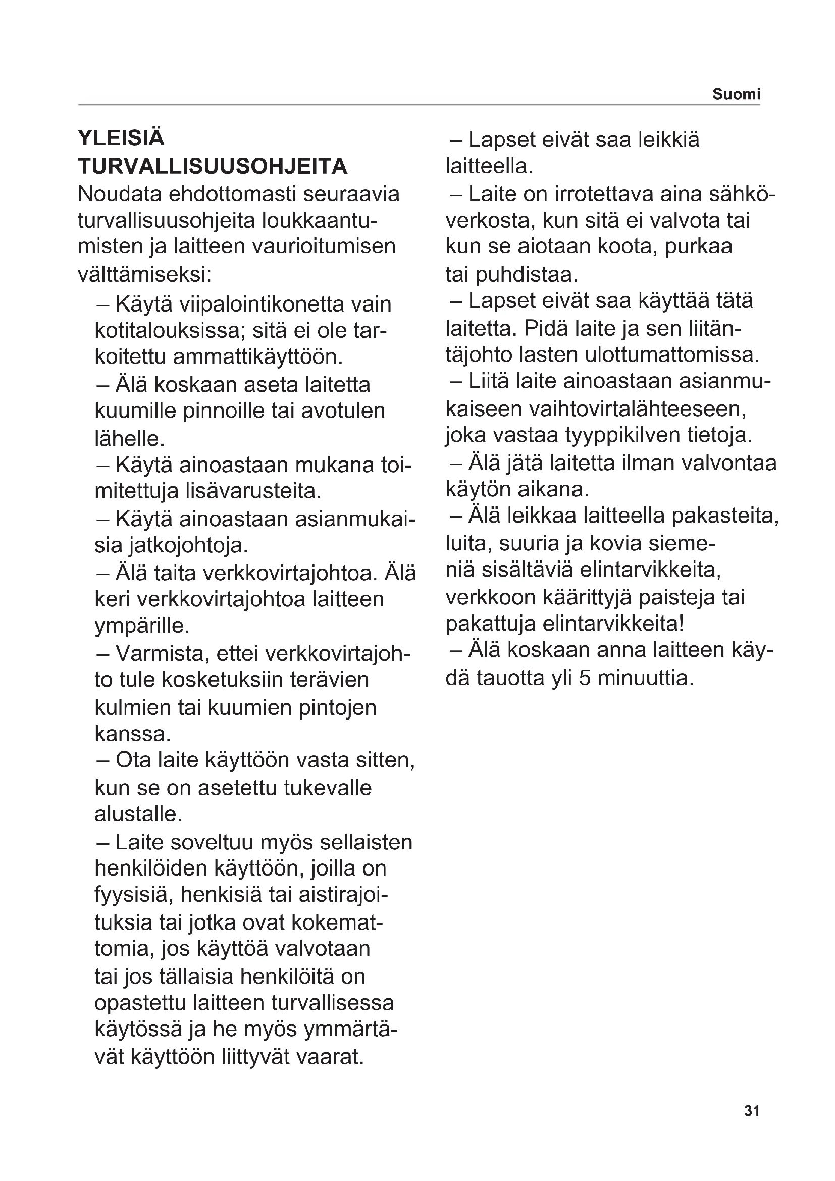 Viipalointikone on tarkoitettu tavanomaisten elintarvikkeiden leikkaamiseen. Viipalointikone soveltuu elintarvikkeiden käsittelyyn. Käyttötarkoituksesta poikkeava käyttö tai väärä käyttötapa voi aiheuttaa vakavan loukkaantu- misen tai laitteen vaurioitumisen. Tällöin kaikki takuu- ja vastuuvel- voitteet raukeavat.