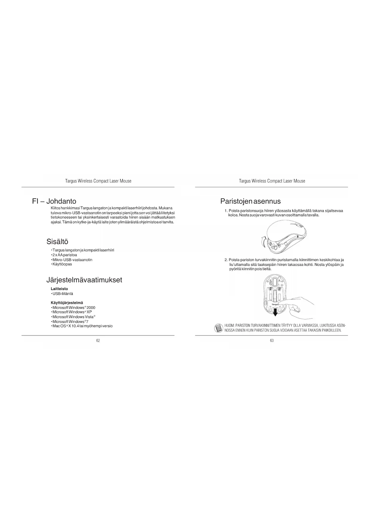 FI – Johdanto Kiitos hankkimasi Targus langaton ja kompakti laserhiiri johdosta. Mukana tuleva mikro-USB-vastaanotin on tarpeeksi pieni jotta sen voi jättää liitetyksi tietokoneeseen tai yksinkertaisesti varastoida hiiren sisään matkustuksen ajaksi. Tämä on kytke-ja-käytä laite joten ylimääräistä ohjelmistoa ei tarvita. Järjestelmävaatimukset Laitteisto