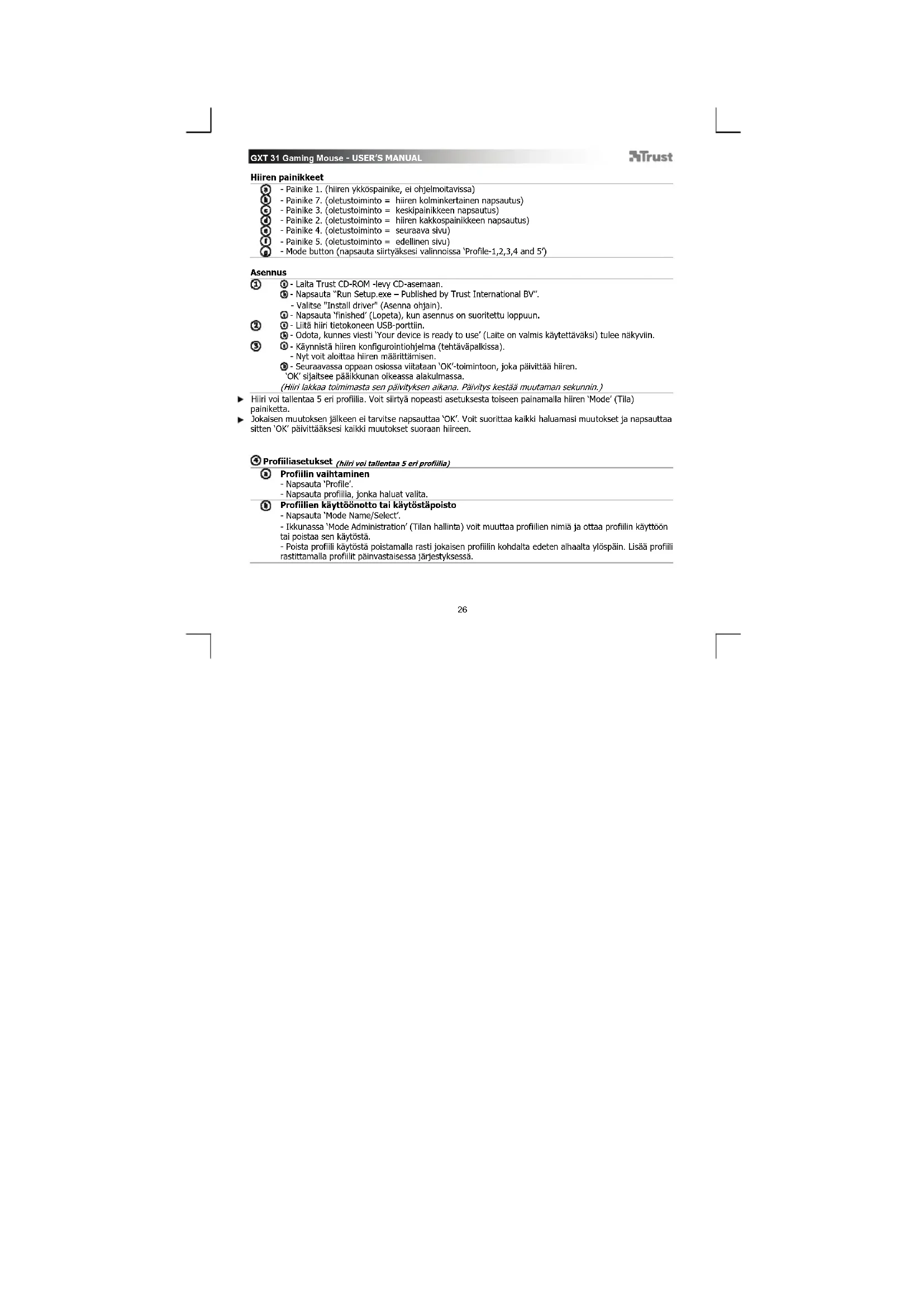 - Laita Trust CD-ROM -levy CD-asemaan. - Napsauta “Run Setup.exe – Published by Trust International BV”. - Valitse "Install driver" (Asenna ohjain). - Napsauta ‘finished’ (Lopeta), kun asennus on suoritettu loppuun. - Liitä hiiri tietokoneen USB-porttiin. - Odota, kunnes viesti ‘Your device is ready to use’ (Laite on valmis käytettäväksi) tulee näkyviin. - Käynnistä hiiren konfigurointiohjelma (tehtäväpalkissa). - Nyt voit aloittaa hiiren määrittämisen. - Seuraavassa oppaan osiossa viitataan ‘OK’-toimintoon, joka päivittää hiiren. ‘OK’ sijaitsee pääikkunan oikeassa alakulmassa. (Hiiri lakkaa toimimasta sen päivityksen aikana. Päivitys kestää muutaman sekunnin.) Hiiri voi tallentaa 5 eri profiilia. Voit siirtyä nopeasti asetuksesta toiseen painamalla hiiren ‘Mode’ (Tila) painiketta. Jokaisen muutoksen jälkeen ei tarvitse napsauttaa ‘OK’. Voit suorittaa kaikki haluamasi muutokset ja napsauttaa sitten ‘OK’ päivittääksesi kaikki muutokset suoraan hiireen.