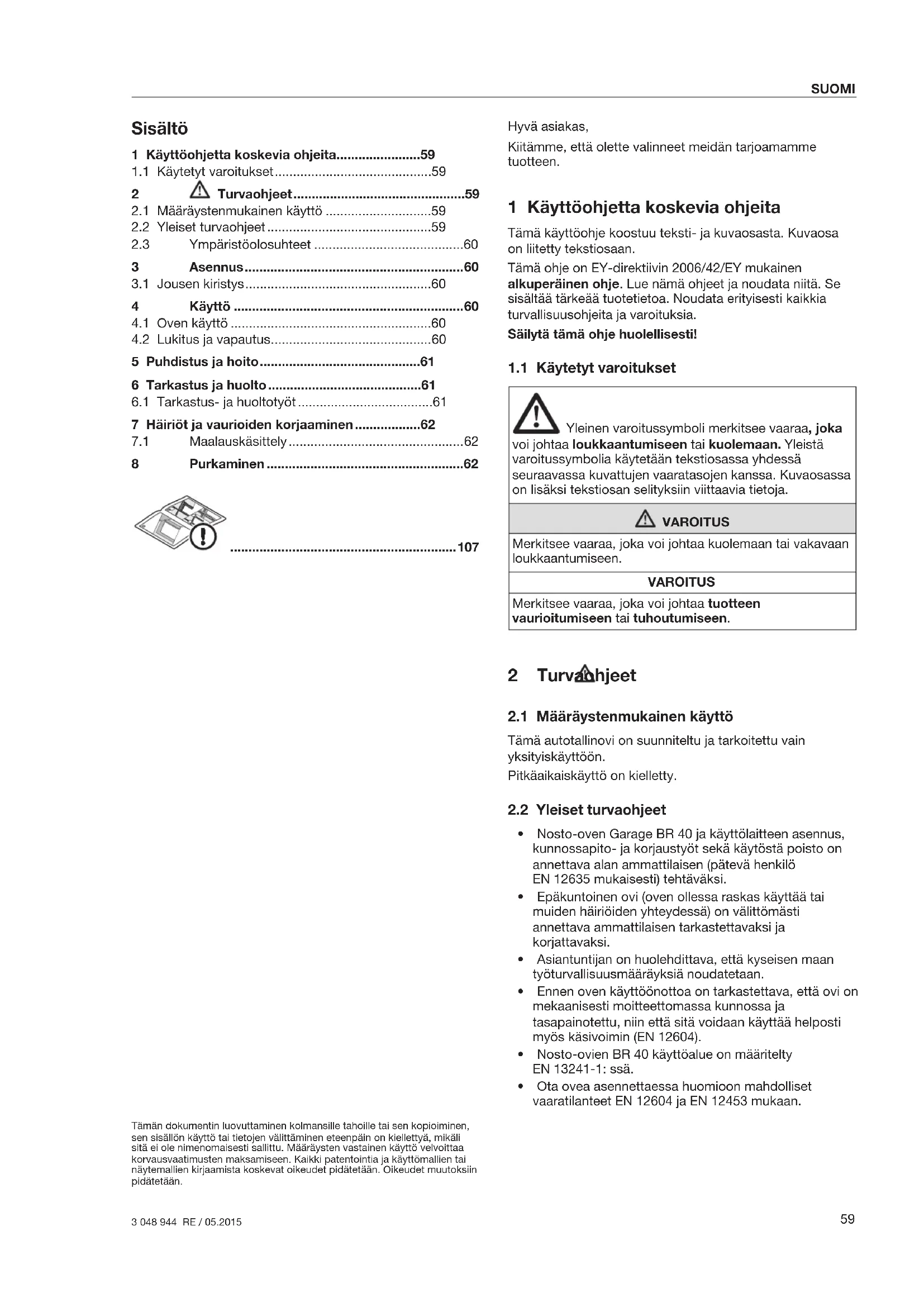 - Ota ovea asennettaessa huomioon mahdolliset vaaratilanteet EN12604 ja EN12453 mukaan. 1 Käyttöohjetta koskevia ohjeita .......................59