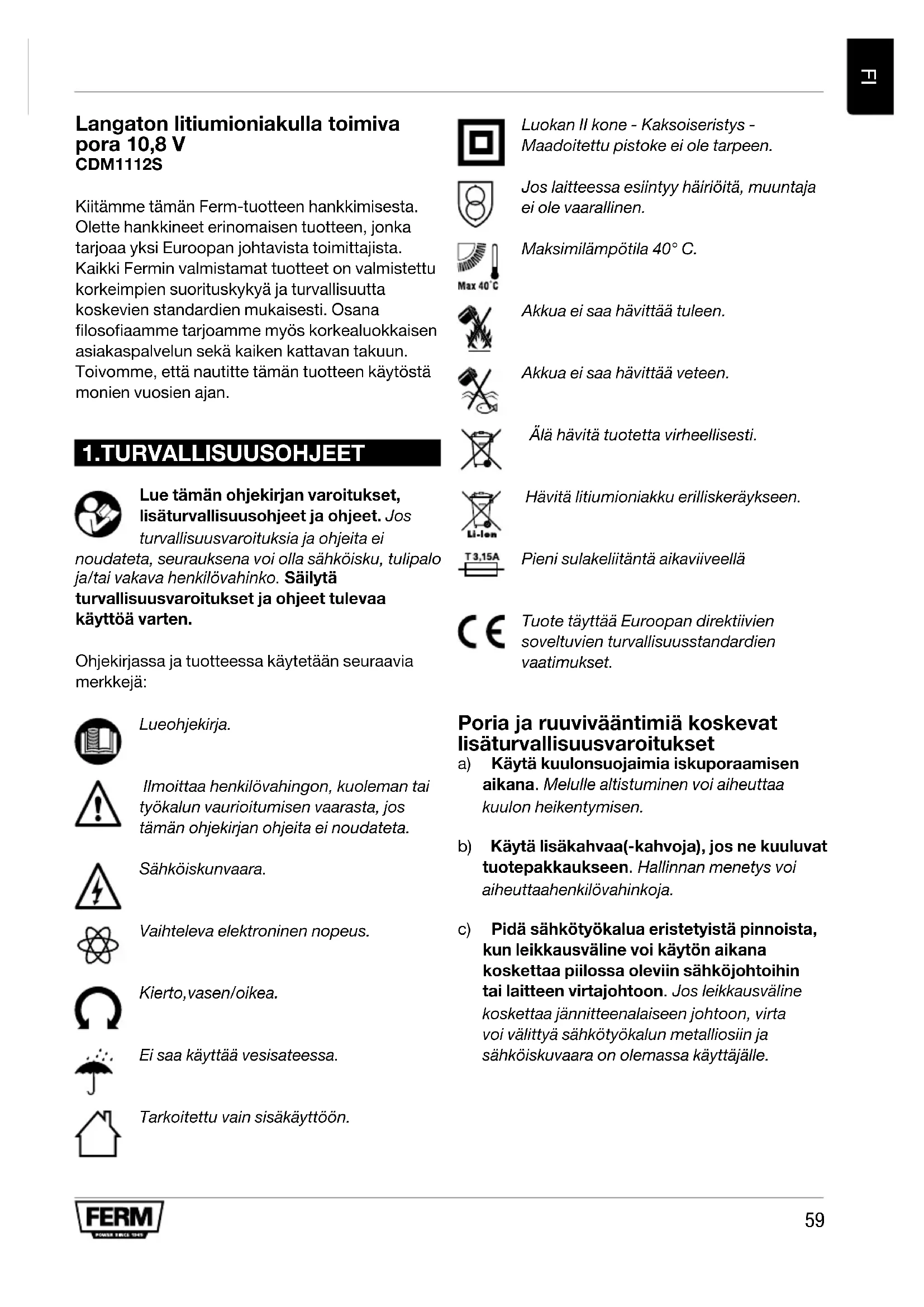 Langaton litiumioniakulla toimiva pora 10,8 V CDM1112S Kiitämme tämän Ferm-tuotteen hankkimisesta. Olette hankkineet erinomaisen tuotteen, jonka tarjoaa yksi Euroopan johtavista toimittajista. Kaikki Fermin valmistamat tuotteet on valmistettu korkeimpien suorituskykyä ja turvallisuutta koskevien standardien mukaisesti. Osana filosofiaamme tarjoamme myös korkealuokkaisen asiakaspalvelun sekä kaiken kattavan takuun. Toivomme, että nautitte tämän tuotteen käytöstä monien vuosien ajan.