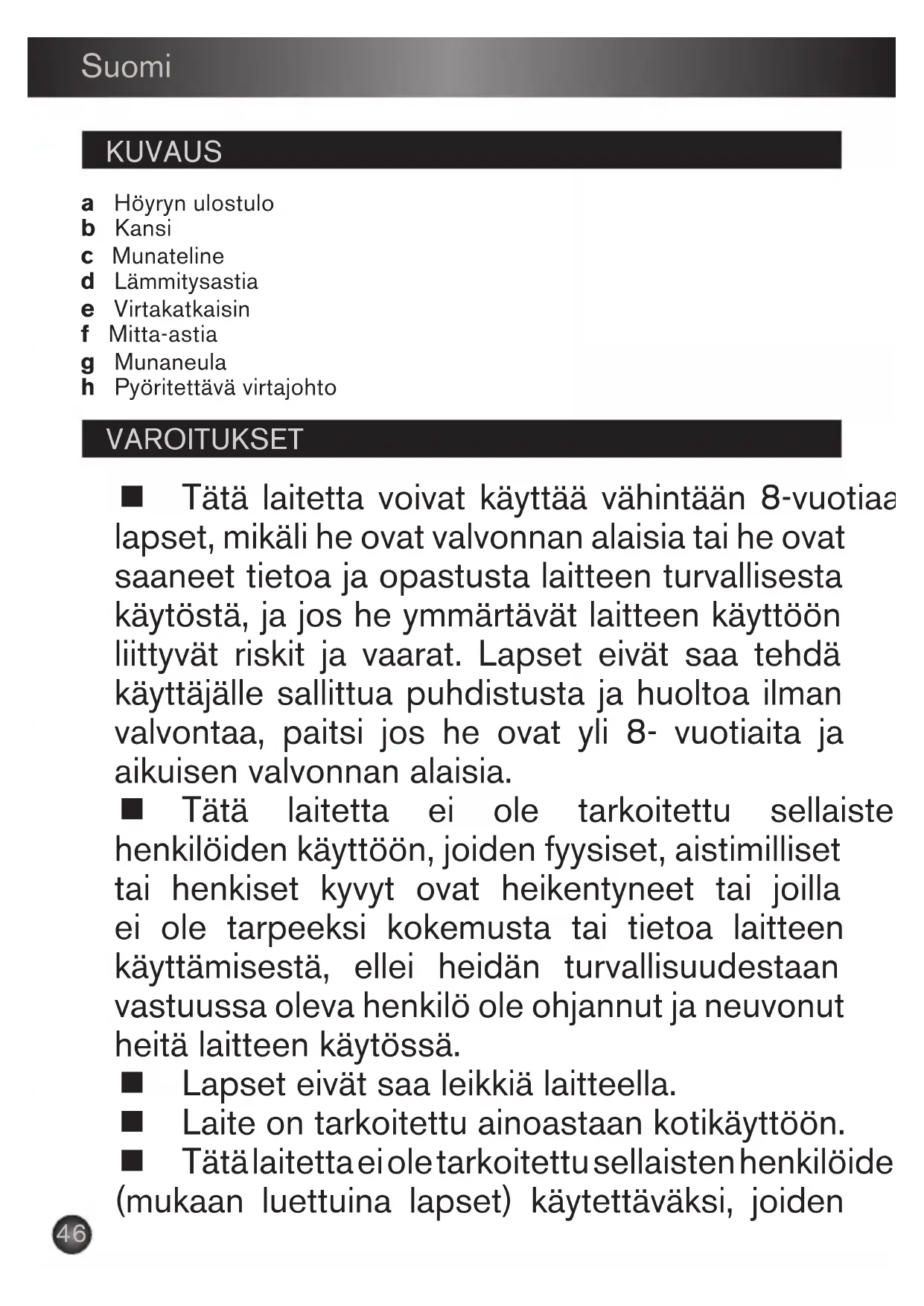 MYKT EGG HARDKOKTE EGG Apparatet fylles med kaldt vann i forhold til ønsket koketid. Målebegeret brukes for nødvendig mengde vann (1 til 2) Sett eggeholderen nedi apparatet (plasser eggeholderen på rett måte – 3). Snu målebegeret opp ned og sett det på en flate. Ta hvert egg og stikk et hull med eggestikkeren slik at de ikke sprekker under koking. (4). Sett eggene jevnt i eggeholderen. (5). Pass på å plassere dem slik at stikkhullet vender opp. (Hvis du koker mindre enn 7 egg, skal eggene plasseres i utkanten av eggeholderen). Sett lokket på apparatet. (6) Rull strømledningen helt ut og koble til apparatet. Vri startknappen til høyre til posisjon " ". (7) Lyset tennes og apparatet er i gang. (7) Under koking vil damp komme ut av det lille hullet på toppen av apparatet, dette er helt normalt. (8) SLUTTEN AV KOKINGEN: Når vannet har fordampet, vil et lydsignal høres. Dette angir slutten av koketiden. Vri bryteren tilbake til posisjon O. (9) Hendene må aldri holdes over dette hullet under koking. Apparatet skal aldri nedsenkes i vann. Unngå væting av apparatet, kontrollen og ledningen45 Norsk HOLDE HARDKOKTE EGG VARME: Du kan holde hardkokte egg varme ved å sette eggeholderen i apparatet uten vann og sette på lokket igjen. Vri knotten til midten av -innstillingen. Lyset tennes, apparatet er i gang og holder eggene varme. (13) RENGJØRING OG VEDLIKEHOLD: Apparatet må kobles fra og kjøle seg ned før rengjøring eller vedlikehold. Lokket og eggholderen vaskes i vann med oppvaskmiddel. Utsiden og strømledningen kan vaskes med en fuktig klut. La det tørke. Dette bør gjøres regelmessig, fortrinnsvis etter hver bruk. AVKALKING Apparatet må avkalkes fra tid til annen, fortrinnsvis en gang i måneden, oftere ved hyppig bruk og meget ofte hvis vannet inneholder mye kalk. For avkalking av apparatet, bruk: – 20 g eddik i et målebeger eller kopp med vann – Hell væsken i apparatet. – Varm blandingen i 10 minutter uten lokk. – Stopp apparatet, koble fra og tøm ut væsken. – Rengjør kokebollen med en fuktig svamp. – Tørk apparatet. – Vent til apparatet har kjølt seg helt ned før det settes til oppbevaring. Lyset slukkes og apparatet stopper. Eggene er klare. Ta lokket av med en grytevott, apparatet er fremdeles varmt og damp slipper ut når lokket åpnes. (10) Ta eggeholderen i håndtaket (med en grytevott om nødvendig). (11) Ta eggeholderen ut av apparatet og hold den under kaldt, rennende vann for å kjøle ned eggene. (12) BESKYTT MILJØET! Apparatet inneholder en mengde verdifulle materialer som kan resirkuleres. Lever apparatet til et egnet innsamlingspunkt eller til en forhandler for videre behandling.46 Suomi KUVAUS VAROITUKSET a Höyryn ulostulo b Kansi c Munateline d Lämmitysastia e Virtakatkaisin f Mitta-astia g Munaneula h Pyöritettävä virtajohto Tätä laitetta voivat käyttää vähintään 8-vuotiaat lapset, mikäli he ovat valvonnan alaisia tai he ovat saaneet tietoa ja opastusta laitteen turvallisesta käytöstä, ja jos he ymmärtävät laitteen käyttöön liittyvät riskit ja vaarat. Lapset eivät saa tehdä käyttäjälle sallittua puhdistusta ja huoltoa ilman valvontaa, paitsi jos he ovat yli 8- vuotiaita ja aikuisen valvonnan alaisia. Tätä laitetta ei ole tarkoitettu sellaisten henkilöiden käyttöön, joiden fyysiset, aistimilliset tai henkiset kyvyt ovat heikentyneet tai joilla ei ole tarpeeksi kokemusta tai tietoa laitteen käyttämisestä, ellei heidän turvallisuudestaan vastuussa oleva henkilö ole ohjannut ja neuvonut heitä laitteen käytössä. Lapset eivät saa leikkiä laitteella. Laite on tarkoitettu ainoastaan kotikäyttöön. Tätä laitetta ei ole tarkoitettu sellaisten henkilöiden (mukaan luettuina lapset) käytettäväksi, joiden47 Suomi fyysinen, aistillinen tai älyllinen kapasiteetti on rajoittunut, eikä myöskään sellaisten henkilöiden käyttöön, joilla ei ole tarvittavia tietoja tai kokemusta, elleivät he ole saaneet heidän turvallisuudestaan vastaavan henkilön käyttöä koskevaa ohjausta. Lapsia on pidettävä silmällä, jotta he eivät leiki laitteella. Laitetta ei ole tarkoitettu käytettäväksi seuraavissa tapauksissa, joita takuu ei kata: – henkilökunnan käyttöön tarkoitetut keittiötilat liikkeissä, toimistoissa ja muissa ammatillisissa ympäristöissä, – maatiloilla, – hotellien, motellien tai muiden majoitustyyppien asiakkaiden käytössä, – Bed & Break fast -ty yppisissä majoituskohteissa. Virtajohtoa ei voi vaihtaa. Jos johto on viallinen, laite olisi syytä hävittää. Varo vahingoittamasta kantta. Varoitus: lämpenevän osan pinta on lämmin vielä käytön jälkeenkin. Varoitus: laitteen väärinkäyttö voi johtaa loukkaantumisiin. Puhdista elintarvikkeiden kanssa kosketuksissa olevat lisävarusteet ja osat astianpesuaineella sekä kostealla liinalla tai sienellä. Huuhtele kostean liinan tai sienen avulla ja kuivaa ne lopuksi kuivalla liinalla.48 Suomi Turvallisuutesi vuoksi tämä laite on voimassa olevien normien ja säädösten mukainen (alijännitedirektiivi, elektromagneettinen yhteensopivuus, ruokien kanssa kosketuksissa olevat materiaalit, ympäristödirektiivi...) Lue käyttöohjeet huolellisesti ja säilytä niitä käden ulottuvilla, kuten myös kaikkia eri käyttöohjeen versioita sekä laitteen mukana toimitettujen lisätarvikkeiden käyttöohjeita. Älä koskaan käytä laitetta valvomatta. Älä koskaan kytke päälle laitetta kun et käytä sitä.