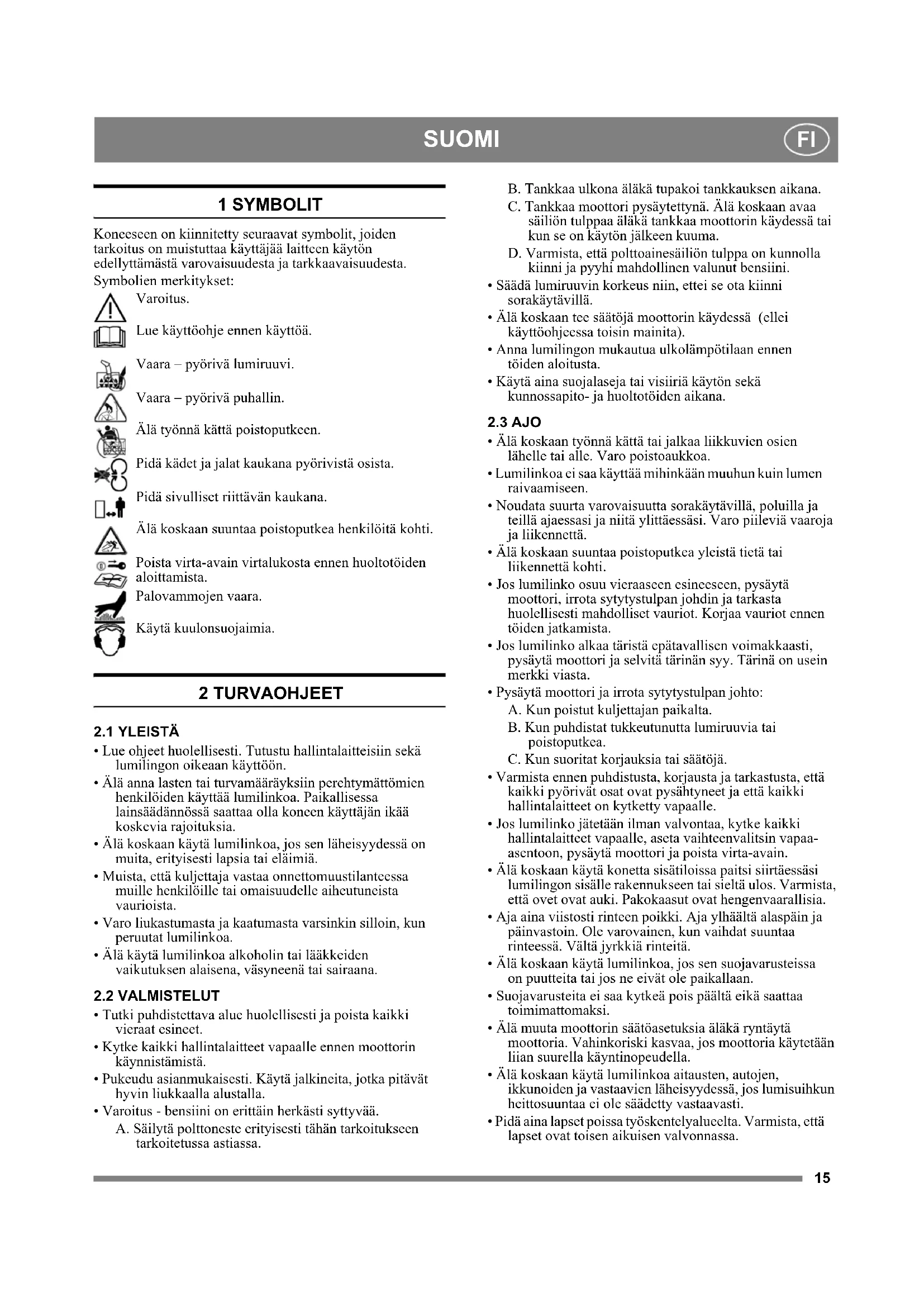 1 SYMBOLIT Koneeseen on kiinnitetty seuraavat symbolit, joiden tarkoitus on muistuttaa käyttäjää laitteen käytön edellyttämästä varovaisuudesta ja tarkkaavaisuudesta. Symbolien merkitykset: Varoitus. Lue käyttöohje ennen käyttöä. Vaara – pyörivä lumiruuvi. Vaara – pyörivä puhallin. Älä työnnä kättä poistoputkeen. Pidä kädet ja jalat kaukana pyörivistä osista. Pidä sivulliset riittävän kaukana. Älä koskaan suuntaa poistoputkea henkilöitä kohti. Poista virta-avain virtalukosta ennen huoltotöiden aloittamista. Palovammojen vaara. Käytä kuulonsuojaimia. 2 TURVAOHJEET