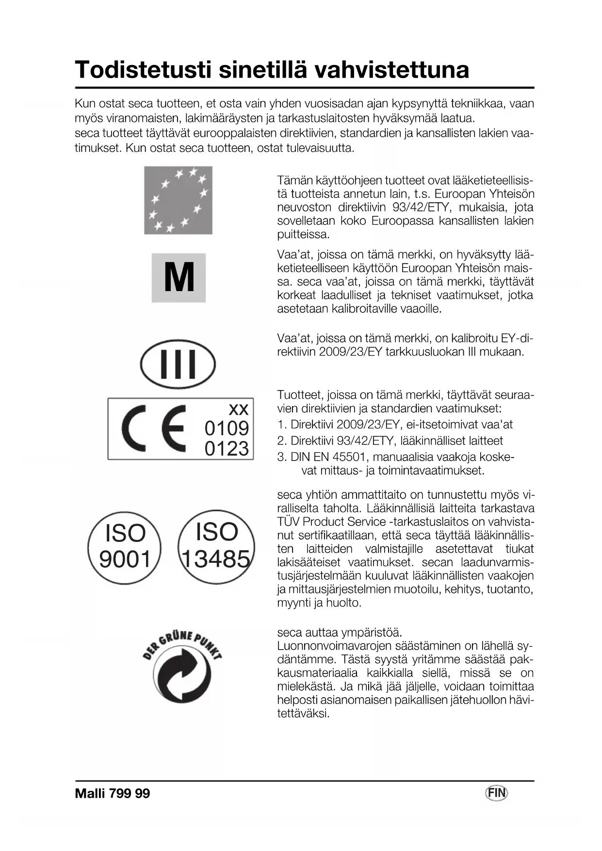 Vaa'at, joissa on tämä merkki, on hyväksytty lääketieteelliseen käyttöön Euroopan Yhteisön maissa. seca vaa'at, joissa on tämä merkki, täyttävät korkeat laadulliset ja tekniset vaatimukset, jotka asetetaan kalibroitaville vaaoille.