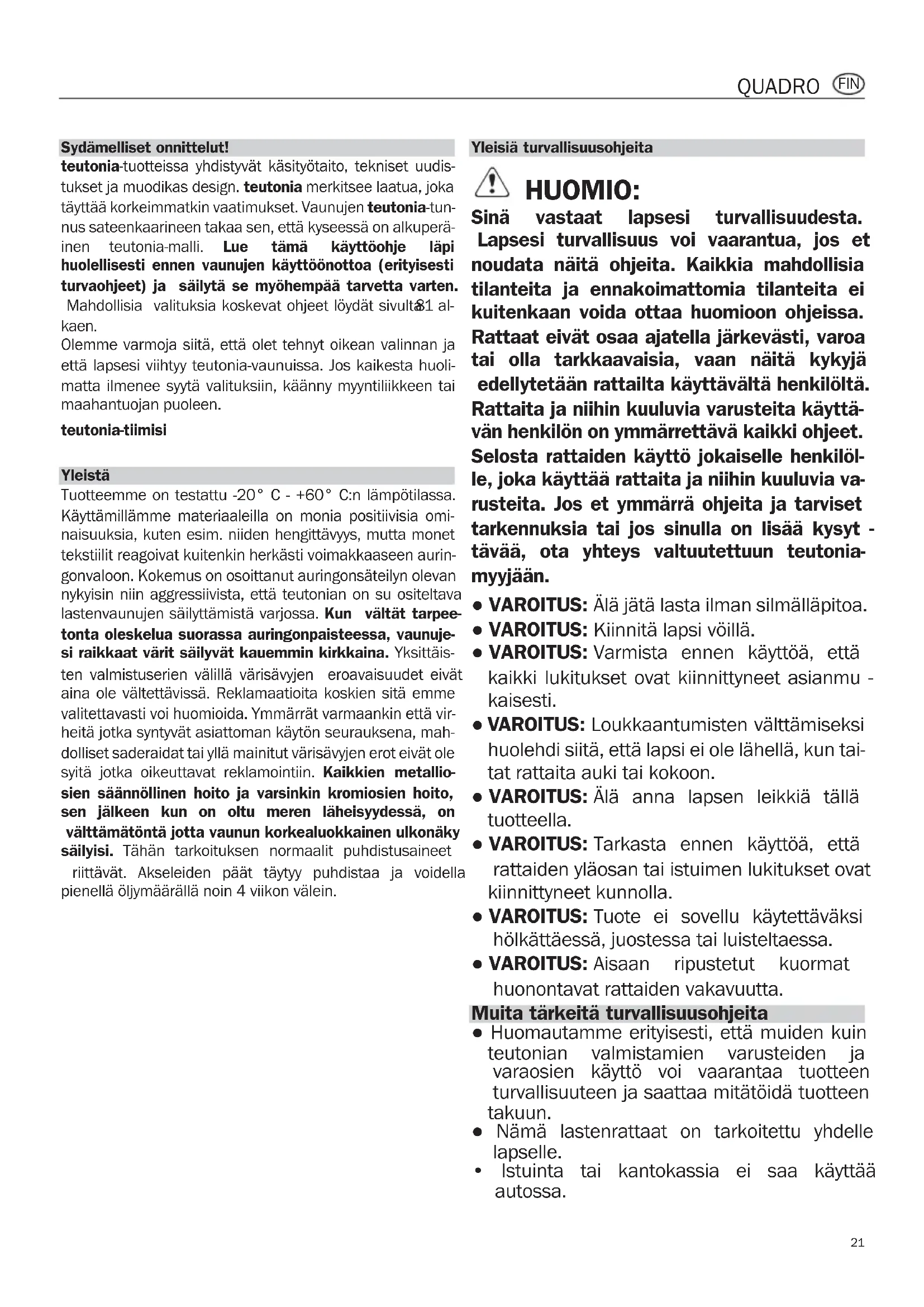 Sydämel teutonia tukset ja täyttää k nus sate inen te huolellis turvaohj Mahdolli kaen. Olemme että laps matta ilm maahant teutonia Yleistä Tuotteem Käyttäm naisuuks tekstiilit gonvaloo nykyisin lastenva tonta ole si raikka ten valm aina ole valitettav heitä jotk dolliset s syitä jotk sien sää sen jälk välttämä säilyisi. riittävät. pienellä Quadro_in_mistral_s_08_in.qxd 12.10.11 13:38 Seite 20QUADRO Yleisiä turvallisuusohjeita HUOMIO: Sinä vastaat lapsesi turvallisuudesta. Lapsesi turvallisuus voi vaarantua, jos et noudata näitä ohjeita. Kaikkia mahdollisia tilanteita ja ennakoimattomia tilanteita ei kuitenkaan voida ottaa huomioon ohjeissa. Rattaat eivät osaa ajatella järkevästi, varoa tai olla tarkkaavaisia, vaan näitä kykyjä edellytetään rattailta käyttävältä henkilöltä. Rattaita ja niihin kuuluvia varusteita käyttä- vän henkilön on ymmärrettävä kaikki ohjeet. Selosta rattaiden käyttö jokaiselle henkilöl- le, joka käyttää rattaita ja niihin kuuluvia va- rusteita. Jos et ymmärrä ohjeita ja tarviset tarkennuksia tai jos sinulla on lisää kysyt - tävää, ota yhteys valtuutettuun teutonia- myyjään. ● VAROITUS: Älä jätä lasta ilman silmälläpitoa. ● VAROITUS: Kiinnitä lapsi vöillä. ● VAROITUS: Varmista ennen käyttöä, että kaikki lukitukset ovat kiinnittyneet asianmu - kaisesti. ● VAROITUS: Loukkaantumisten välttämiseksi huolehdi siitä, että lapsi ei ole lähellä, kun tai- tat rattaita auki tai kokoon. ● VAROITUS: Älä anna lapsen leikkiä tällä tuotteella. ● VAROITUS: Tarkasta ennen käyttöä, että rattaiden yläosan tai istuimen lukitukset ovat kiinnittyneet kunnolla. ● VAROITUS: Tuote ei sovellu käytettäväksi hölkättäessä, juostessa tai luisteltaessa. ● VAROITUS: Aisaan ripustetut kuormat huonontavat rattaiden vakavuutta. Muita tärkeitä turvallisuusohjeita ● Huomautamme erityisesti, että muiden kuin teutonian valmistamien varusteiden ja varaosien käyttö voi vaarantaa tuotteen turvallisuuteen ja saattaa mitätöidä tuotteen takuun. ● Nämä lastenrattaat on tarkoitettu yhdelle lapselle.