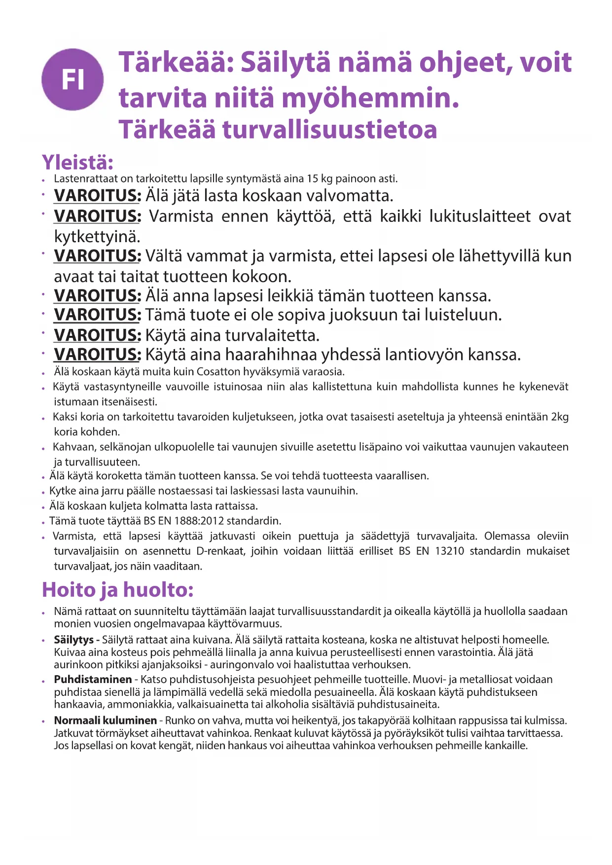 Puhdistaminen - Katso puhdistusohjeista pesuohjeet pehmeille tuotteille. Muovi- ja metalliosat voidaan puhdistaa sienellä ja lämpimällä vedellä sekä miedolla pesuaineella. Älä koskaan käytä puhdistukseen hankaavia, ammoniakkia, valkaisuainetta tai alkoholia sisältäviä puhdistusaineita.