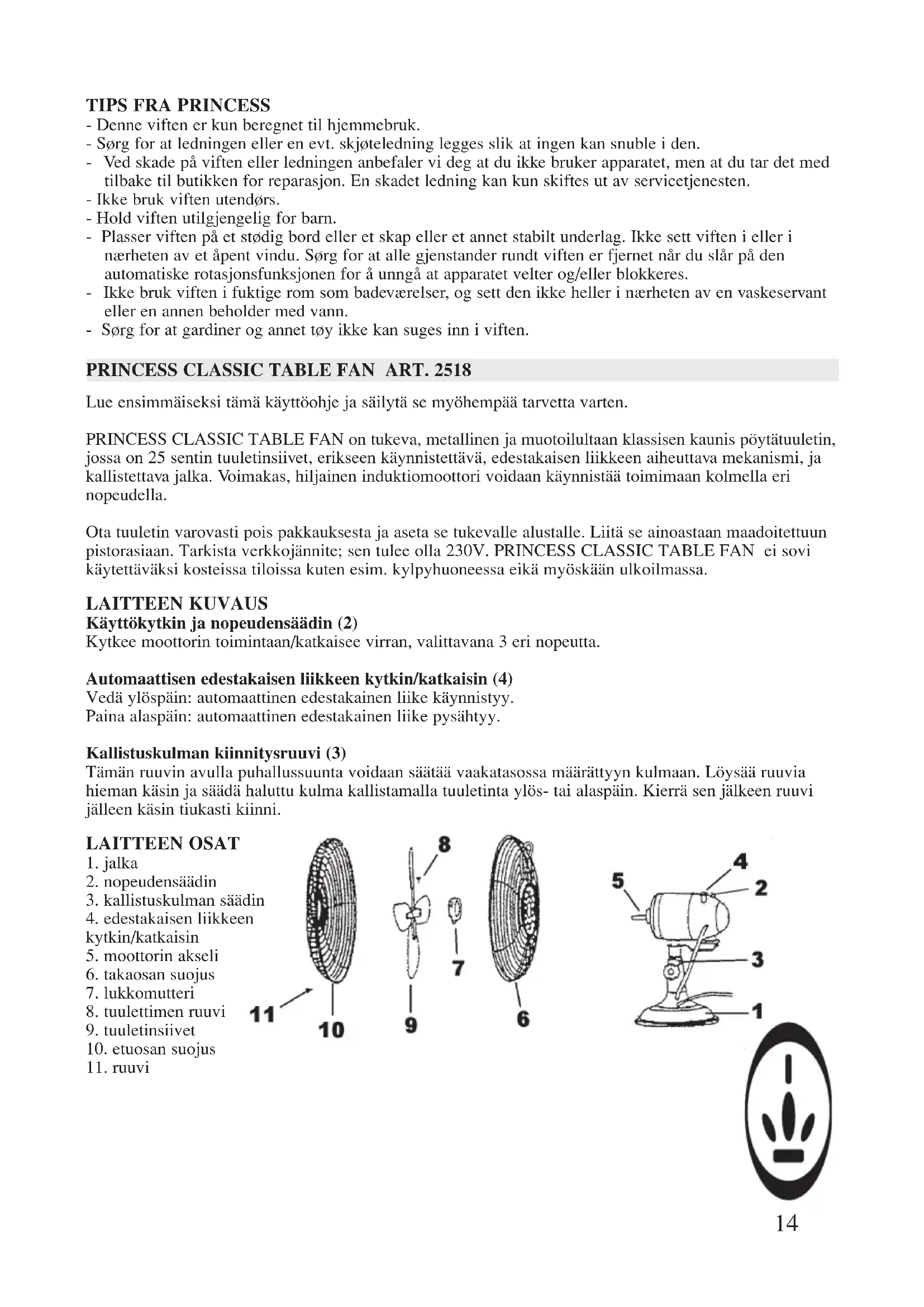 Lue ensimmäiseksi tämä käyttöohje ja säilytä se myöhempää tarvetta varten. PRINCESS CLASSIC TABLE FAN on tukeva, metallinen ja muotoilultaan klassisen kaunis pöytätuuletin, jossa on 25 sentin tuuletinsiivet, erikseen käynnistettävä, edestakaisen liikkeen aiheuttava mekanismi, ja kallistettava jalka. Voimakas, hiljainen induktiomoottori voidaan käynnistää toimimaan kolmella eri nopeudella. Ota tuuletin varovasti pois pakkauksesta ja aseta se tukevalle alustalle. Liitä se ainoastaan maadoitettuun pistorasiaan. Tarkista verkkojännite; sen tulee olla 230V. PRINCESS CLASSIC TABLE FAN ei sovi käytettäväksi kosteissa tiloissa kuten esim. kylpyhuoneessa eikä myöskään ulkoilmassa. LAITTEEN KUVAUS Käyttökytkin ja nopeudensäädin (2) Kytkee moottorin toimintaan/katkaisee virran, valittavana 3 eri nopeutta. Automaattisen edestakaisen liikkeen kytkin/katkaisin (4) Vedä ylöspäin: automaattinen edestakainen liike käynnistyy. Paina alaspäin: automaattinen edestakainen liike pysähtyy. Kallistuskulman kiinnitysruuvi (3) Tämän ruuvin avulla puhallussuunta voidaan säätää vaakatasossa määrättyyn kulmaan. Löysää ruuvia hieman käsin ja säädä haluttu kulma kallistamalla tuuletinta ylös- tai alaspäin. Kierrä sen jälkeen ruuvi jälleen käsin tiukasti kiinni. LAITTEEN OSAT