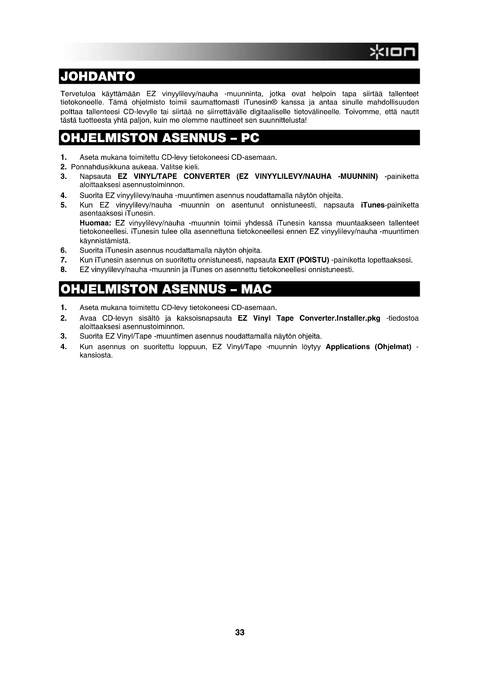 USB-laite ei ole päällä. Jos laitteessasi on virtapainike, varmistu, että USB-laite on päällä. USB-laite ei ole liitettynä tietokoneeseen. Varmistu, että USB-laite on liitettynä toimivaan tietokoneesi USB- porttiin. Jos se on jo liitettynä, yritä liittää laite uudelleen ja käynnistää ohjelmisto uudelleen. En kuule mitään ääntä nauhoittaessani enkä näe äänimittareiden liikkuvan. Viallinen USB-johto tai USB-portti. Kokeile käyttää toista USB-johtoa. Yritä myös yhdistää USB-laite tietokoneesi toiseen USB-porttiin. Äänen lähtö ei ole asetettu oikein. Varmistu, että tietokoneesi äänikortti on valittu toistolaitteeksi. Windows XP: Napsauta Start Menu (Käynnistä-valikko) Control Panel (Ohjauspaneeli) (tai Settings (Asetukset) Control Panel (Ohjauspaneeli) Classic View (Perinteinen näkymä)) Sound and Audio Devices (Äänilaitteet). Napsauta Audio (Ääni) -välilehteä ja valitse Sound playback (Äänen toisto) -kohdan alta tietokoneesi äänikortti oletuslaitteeksi. Windows Vista: Napsauta Start Menu (Käynnistä-valikko) Control Panel (Ohjauspaneeli) (tai Settings (Asetukset) Control Panel (Ohjauspaneeli) Classic View (Perinteinen näkymä)) Hardware and Sound (Laitteisto ja ääni) Sound (Ääni). Napsauta Playback (Toisto) -välilehteä ja valitse tietokoneesi äänikortti oletuslaitteeksi. Windows 7: Napsauta Start Menu (Käynnistä-valikko) Control Panel (Ohjauspaneeli) Sound (Ääni). Napsauta Playback (Toisto) -välilehteä ja valitse tietokoneesi äänikortti oletuslaitteeksi. Mac: Napsauta vasemman yläkulman apple-kuvaketta ja napsauta tämän jälkeen System Preferences (Järjestelmän ominaisuudet) Sound (Ääni). Napsauta Output (Lähtö) -välilehteä. Valitse valikosta Internal Speakers (Sisäiset kaiuttimet), jos käytät tietokoneesi sisäisiä kaiuttimia tai valitse Headphones (Kuulokkeet), jos käytät tietokoneen 1/8"-kuulokeliitäntään liitettyjä kaiuttimia tai kuulokkeita. Tietokoneen kaiuttimet on mykistetty. Säädä tietokoneesi kaiuttimien äänenvoimakkuutta ylös. Musiikkia toistetaan ja näen, että äänimittarit liikkuvat, mutta en kuule ääntä. Tietokoneen kaiuttimia ei ole liitetty. Jos käytät ulkoisia kaiuttimia, varmistu, että ne on liitetty tietokoneesi äänikorttiin. Äänirasian liitos on huono. Jos käytät USB-levysoitinta, äänirasian on oltava tiukasti liitettynä äänivarteen levysoitinta käytettäessä. Vinyylilevy on likainen tai siinä on naarmuja. Jos siirrät vinyylilevyltä, yritä pyyhkiä levyn pinta kevyesti ennen sen soittamista. Muut sovellukset häiritsevät EZ vinyylilevy/nauha/ääni - muunninta. Sulje kaikki sovellukset, käynnistä tietokone uudelleen ja suorita ainoastaan EZ vinyyli/nauha/ääni-muunnin tallennuksen aikana. Äänenlaatu on huono. Levysoittimen neula saattaa olla kulunut. Ainoastaan levysoittimet: Jos levysoittimen neula on yli vuoden vanha tai sitä on käytetty runsaasti, se saattaa olla rikkoutunut tai kulunut. Ota yhteyttä IONin ääniosien osastoon hankkiaksesi uuden levysoittimen neulan. Tallenteen äänenvoimakkuus on suuri ja ääni on epäselvä. Gain (saanti) -taso on liian suuri. Tallenne kuuluu heikosti. Gain (saanti) -taso on liian alhainen. Jos USB-laitteessa on gain (saanti) -ohjain, säädä sitä tarpeen mukaan. Voit myös säätää gain (saanti) -liukusäädintä äänenvoimakkuuden mittarin vieressä (kappaleen voimakkaimman kohdan tulee saavuttaa mittarin oranssi kohta). Useimmissa käyttöjärjestelmissä on säädettävä tallennuksen tulotason säädin: Windows XP: (ei saatavilla) Windows Vista: Napsauta Start Menu (Käynnistä-valikko) Control Panel (Ohjauspaneeli) (tai Settings (Asetukset) Control Panel (Ohjauspaneeli) Classic View (Perinteinen näkymä)) Hardware and Sound (Laitteisto ja ääni) Sound (Ääni). Napsauta Recording (Tallennus) -välilehteä ja valitse "USB Audio Codec (USB-äänen pakkaus)" oletuslaitteeksi. Napsauta Properties (Ominaisuudet). Napsauta uudessa ikkunassa Levels (Tasot) -välilehteä ja säädä Microphone (Mikrofoni) -säädintä tarpeen mukaan. Suosittelemme asettamaan tasoksi 4. Windows 7: Napsauta Start Menu (Käynnistä-valikko) Control Panel (Ohjauspaneeli) Sound (Ääni). Napsauta Recording (Tallennus) -välilehteä ja valitse "USB Audio Codec (USB-äänen pakkaus)" oletuslaitteeksi. Napsauta Properties (Ominaisuudet). Napsauta uudessa ikkunassa Levels (Tasot) -välilehteä ja säädä Microphone (Mikrofoni) -säädintä tarpeen mukaan. Suosittelemme asettamaan tasoksi 4. Mac: Napsauta vasemman yläkulman apple-kuvaketta ja napsauta tämän jälkeen System Preferences (Järjestelmän ominaisuudet) Sound (Ääni). Napsauta Input (Tulo)-välilehteä. Valitse valikosta USB-tallennuslaite ja säädä Input Volume (Tulon äänenvoimakkuus) -säädintä tarpeen mukaan.37
