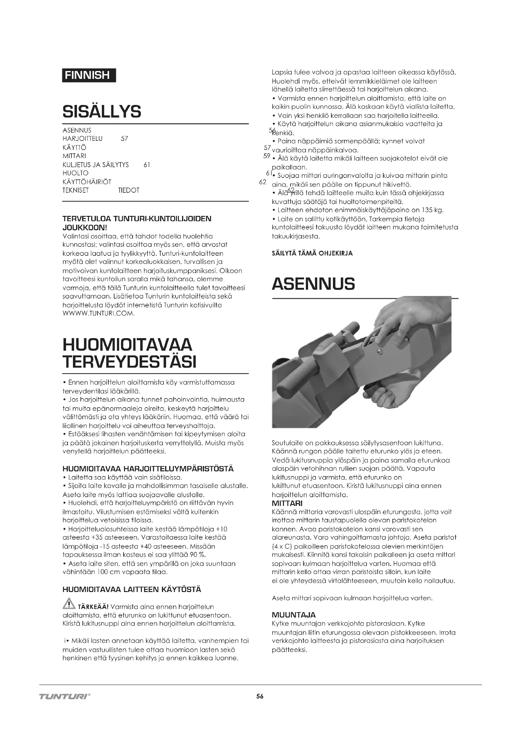 TEKNISET TIEDOT 62 TERVETULOA TUNTURI-KUNTOILIJOIDEN JOUKKOON! Valintasi osoittaa, että tahdot todella huolehtia kunnostasi; valintasi osoittaa myös sen, että arvostat korkeaa laatua ja tyylikkyyttä. Tunturi-kuntolaitteen myötä olet valinnut korkealuokkaisen, turvallisen ja motivoivan kuntolaitteen harjoituskumppaniksesi. Olkoon tavoitteesi kuntoilun saralla mikä tahansa, olemme varmoja, että tällä Tunturin kuntolaitteella tulet tavoitteesi saavuttamaan. Lisätietoa Tunturin kuntolaitteista sekä harjoittelusta löydät internetistä Tunturin kotisivuilta WWWW.TUNTURI.COM. HUOMIOITAVAA TERVEYDESTÄSI