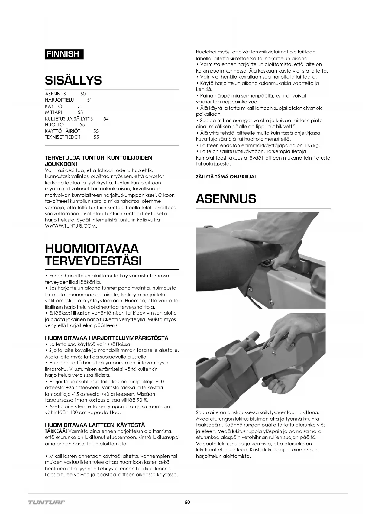 TEKNISET TIEDOT 55 TERVETULOA TUNTURI-KUNTOILIJOIDEN JOUKKOON! Valintasi osoittaa, että tahdot todella huolehtia kunnostasi; valintasi osoittaa myös sen, että arvostat korkeaa laatua ja tyylikkyyttä. Tunturi-kuntolaitteen myötä olet valinnut korkealuokkaisen, turvallisen ja motivoivan kuntolaitteen harjoituskumppaniksesi. Olkoon tavoitteesi kuntoilun saralla mikä tahansa, olemme varmoja, että tällä Tunturin kuntolaitteella tulet tavoitteesi saavuttamaan. Lisätietoa Tunturin kuntolaitteista sekä harjoittelusta löydät internetistä Tunturin kotisivuilta WWWW.TUNTURI.COM. HUOMIOITAVAA TERVEYDESTÄSI