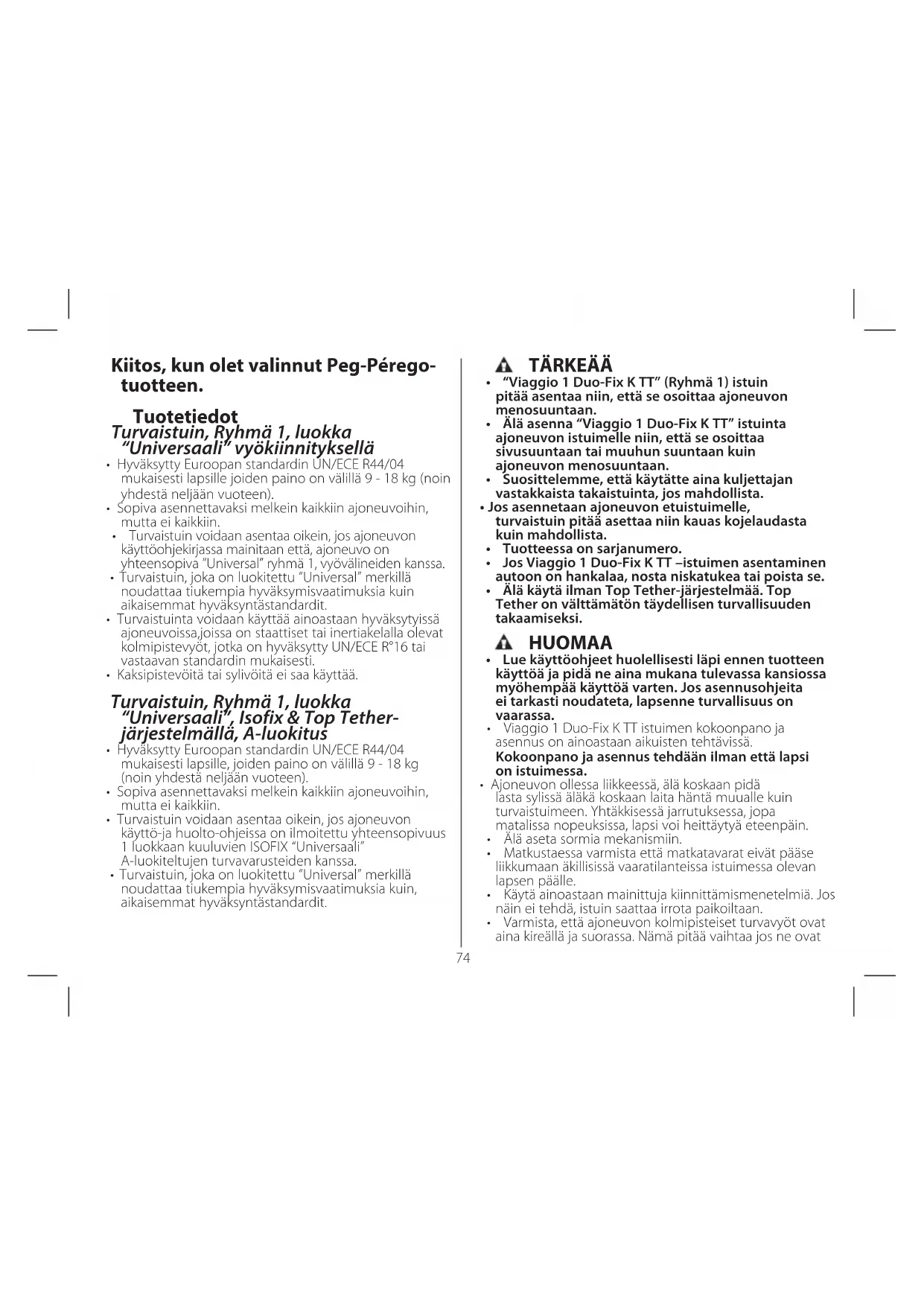 - Juokseva tuotantonumero: hyväksynnän luovutusnumero on turvaistuinkohtainen; kullakin on oma numeronsa. PEG-PÉREGO S.p.A. Peg Pérego S.p.A. on ISO 9001 -sertifioitu yhtiö. Sertifiointi on asiakkaille ja kuluttajille tae siitä, että yritys toimii läpinäkyvästi ja luotettavasti. Peg Pérego voi koska tahansa tehdä tässä julkaisussa kuvattuihin malleihin teknisistä tai kaupallisista syistä muutoksia. Peg Pérego haluaa palvella asiakkaitaan ja vastata parhaansa mukaan kaikkiin heidän tarpeisiinsa. Siksi asiakkaidemme mielipiteet ovat meille erittäin tärkeitä ja arvokkaita. Olisimmekin hyvin kiitollisia, jos haluaisit tuotettamme käytettyäsi täyttää KULUTTAJAN TYYTYVÄISYYSKYSELYN ja kertoa siinä mahdollisista huomautuksistasi ja parannusehdotuksistasi. Kyselyn löydät Internet- sivuiltamme: www.pegperego.com Peg-Pérego-asiakaspalvelu Jos mallin osat sattuvat menemään hukkaan tai ne vaurioituvat, käytä ainoastaan Peg Péregon alkuperäisiä varaosia. Jos tuotteet vaativat korjausta, osia tulee vaihtaa, haluat lisätietoa tuotteista tai tilata alkuperäisiä varaosia ja lisävarusteita, ota yhteyttä Peg Pérego -yhtiön asiakaspalveluun ja jos mahdollista, ilmoita tuotteen sarjanumero. puh. +39 039 60 88 213 fax +39 039 33 09 992 s-posti assistenza@pegperego.it Internet-sivu www.pegperego.com UPOZORNĚNÍ : TOP TETHER Pro správné použití nové autosedačky PegPerego si pečlivě přečtěte tento dokument: Viaggio 1 Duo-Fix K TT Viaggio 1 Duo-Fix K TT je nejnovější autosedačka PegPerego pro děti s hmotností 9-18 kg. Odpovídá ustanovením Evropské směrnice R44/04. Viaggio 1 Duo-Fix K TT využívá upínací zařízení ISOFIX s Top Tether, odpovídající nejnovějším zněním evropských směrnic, které jsou zárukou maximální bezpečnosti a spolehlivosti. Veškerá nedávno vyrobená vozidla jsou ze zákona vybavena příslušenstvím ISOFIX, které se nachází v místě, kde se setkává opěradlo se sedadlem. Rovněž jsou vybavena konektorem TOP TETHER. Ten se běžně nachází na ploše za zadním sedadlem ve vozidlech typu sedan (fotografie A), za zadním sedadlem u vozidel typu hatchback (fotografie B) nebo v zavazadlovém prostoru velkoprostorových osobních vozidel nebo vozidel typu SUV/off-road (fotografie C): CZ_Čeština79 hyväksyntämerkki, numero määrittelee maan, joka on antanut hyväksynnän (1: Saksa, 2: Ranska, 3: Italia, 4: Alankomaat, 11: Iso Britannia ja 24: Irlanti).