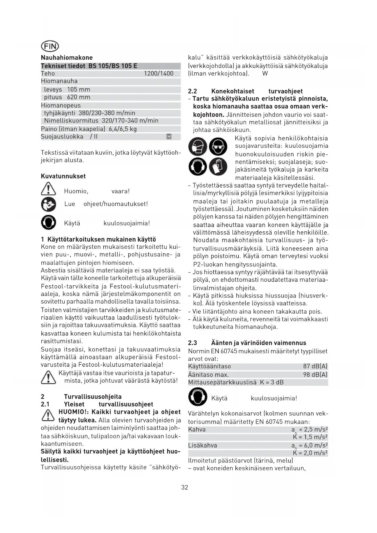 Använd bara Festools originalreservde- lar! Art.nr nedan: www.festool.com/service Håll alltid maskinen och ventilationsöppningarna rena. Maskinen är utrustad med självfrånkopp-lande specialkol. Är dessa slitna bryts strömmen au- tomatiskt och maskinen stannar. När grafi tbeläggningen är utsliten ska slipunder- lägget (3.4) bytas. För att göra det lossar du de tre skruvarna (3.2) och tar loss trycklisten (3.3). 7 Tillbehör, verktyg Artikelnumren till de tillbehör som beskrivs nedan fi nns i din Festool-katalog eller på Internet på “www.festool.com”. Slipunderlägg För stora sliparbeten med hög avverkningseffekt fi nns ett slipunderlägg som tillbehör. Slipband - Konsthartsbundna X-vävsslipband: Slipning av trä, masonit, järn, stålplåt, järnfria metaller och lättmetall. - Kombinationsslipband: Borttagning av färg och betongrester, slipning av gipsytor. 8 Skrotning Kasta inte elverktygen i hushållsavfallet! Ta med maskin, tillbehör och förpackning till återvin- ningsstation när de är uttjänta! Följ gällande nationella föreskrifter. Gäller bara EU-länder: Enligt EU-direktiv 2002/96/EG ska uttjänta elverktyg källsorteras för miljövänlig återvinning. Information om REACh: www.festool.com/reach32 Nauhahiomakone Tekniset tiedot BS 105/BS 105 E Teho 1200/1400 W Hiomanauha leveys 105 mm pituus 620 mm Hiomanopeus tyhjäkäynti 380/230-380 m/min Nimelliskuormitus 320/170-340 m/min Paino (ilman kaapelia) 6,4/6,5 kg Suojausluokka / II Tekstissä viitataan kuviin, jotka löytyvät käyttöoh- jekirjan alusta. Kuvatunnukset Huomio, vaara! Lue ohjeet/huomautukset! Käytä kuulosuojaimia! 1 Käyttötarkoituksen mukainen käyttö Kone on määräysten mukaisesti tarkoitettu kui- vien puu-, muovi-, metalli-, pohjustusaine- ja maalattujen pintojen hiomiseen. Asbestia sisältäviä materiaaleja ei saa työstää. Käytä vain tälle koneelle tarkoitettuja alkuperäisiä Festool-tarvikkeita ja Festool-kulutusmateri- aaleja, koska nämä järjestelmäkomponentit on sovitettu parhaalla mahdollisella tavalla toisiinsa. Toisten valmistajien tarvikkeiden ja kulutusmate- riaalien käyttö vaikuuttaa laadullisesti työtulok- siin ja rajoittaa takuuvaatimuksia. Käyttö saattaa kasvattaa koneen kulumista tai henkilökohtaista rasittumistasi. Suojaa itseäsi, konettasi ja takuuvaatimuksia käyttämällä ainoastaan alkuperäisiä Festool- varusteita ja Festool-kulutusmateriaaleja! Käyttäjä vastaa itse vaurioista ja tapatur- mista, jotka johtuvat väärästä käytöstä! 2 Turvallisuusohjeita