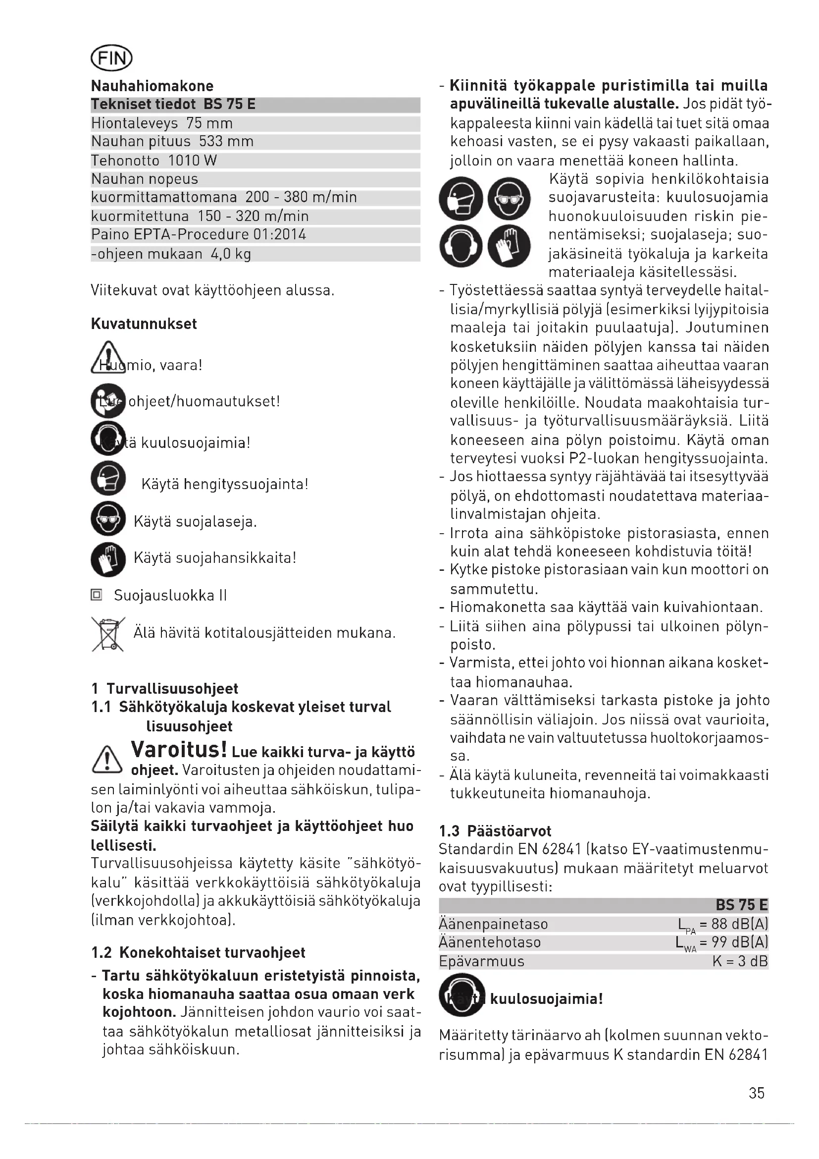 = 6,0 m/s² K = 2,0 m/s² Ilmoitetut päästöarvot (tärinä, melu) - ovat koneiden keskinäiseen vertailuun, - soveltuvat myös käytön yhteydessä syntyvän tärinä- ja melukuormituksen alustavaan arvi- ointiin, - edustavat sähkötyökalun pääasiallisia käyttö- sovelluksia. HUOMIO Melupäästöt saattavat poiketa ilmoi‑ tetuista arvoista sähkötyökalun to‑ dellisessa käytössä sähkötyökalun käyttötavan ja varsinkin työstettävän työkappaleen laadun mukaan. Määritä käyttäjän suojaksi varotoimenpi- teet, jotka perustuvat arvioituun kuormi- tukseen todellisissa käyttöolosuhteissa. (Tässä tulee huomioida käyttöjakson kaikki vaiheet, esimerkiksi ajat, jolloin sähkötyökalu on pois päältä, ja ajat, jolloin se on päällä mutta käy kuitenkin kuormittamatta.) 2 Määräystenmukainen käyttö Yleiskäyttöinen hiomakone puu-, muovi- ja ra- kennusraaka -aineiden hiontaan. Käyttämällä ku- hunkin käyttötarkoitukseen sopivaa hiomanauhaa erilaiset pinnat, särmät, listat ja saumat voidaan sekä karkea- että loppuhioa. Arvokkaat pinnat, kuten viilupinnat, hiotaan harjapintaisella hiomakehyksellä varustetulla hiomakoneella BS 75 E -Set. Niillä ei saa työstää metallia eikä asbestipitoisia materiaaleja. Metallien työstössä saattaa syntyä kipinöitä, mikä lisää palovaaraa. Käsittely-ja käyttömahdollisuuksia voidaan laa- jentaa käyttämällä mainittuja lisävarusteita. Yleisiä tunnettuja työohjeita ja mukaanliitettyjä sähkötyökalujen käyttöön liittyviä »turvallisuus- ohjeita« on noudatettava. Käyttäjän tekemät muutokset koneeseen ja vierai- den ei-alkuperäisten varaosien käyttö koneessa poistavat valmistajan vastuun mahdollisista va- hingoista. Käyttäjä vastaa itse vaurioista ja tapatur- mista, jotka johtuvat väärästä käytöstä! 3 Verkkoonkytkentä Verkkojännitteen ja laitteen käyttöjännitteen pitää olla samat! 230 V, 16 A: n hidas tai vastaava varoke. Kytkentä ilman suojamaadoitusta olevaan pisto- rasiaan on mahdollista mikäli kosketin ja johto ovat suojaeristetyt (luokka II). Käytettäessä jatkokaapellia on kaapelin poikki- pintaalan oltava 3 x 1,5 mm