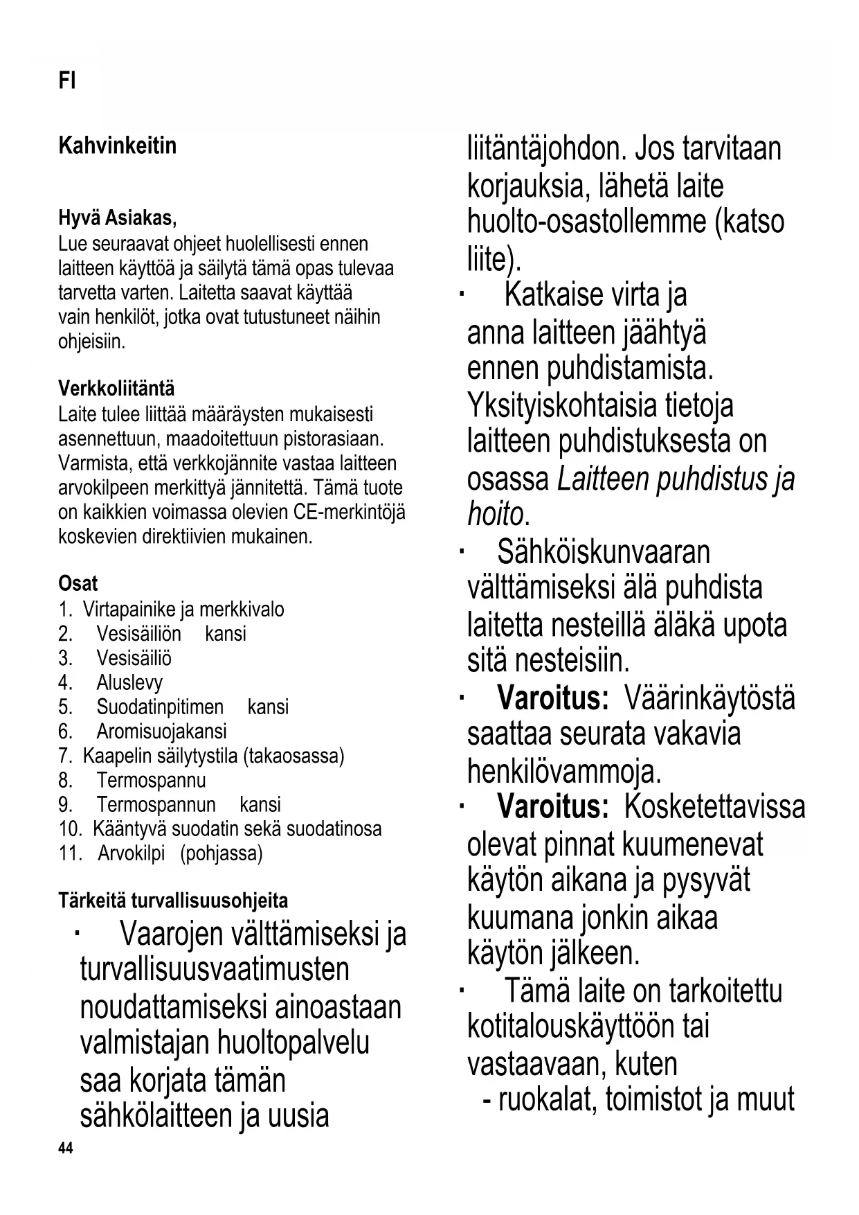 Tärkeitä turvallisuusohjeita ∙ Vaarojen välttämiseksi ja turvallisuusvaatimusten noudattamiseksi ainoastaan valmistajan huoltopalvelu saa korjata tämän sähkölaitteen ja uusia liitäntäjohdon. Jos tarvitaan korjauksia, lähetä laite huolto-osastollemme (katso liite). ∙ Katkaise virta ja anna laitteen jäähtyä ennen puhdistamista. Yksityiskohtaisia tietoja laitteen puhdistuksesta on osassa Laitteen puhdistus ja hoito. ∙ Sähköiskun vaaran välttämiseksi älä puhdista laitetta nesteillä äläkä upota sitä nesteisiin. ∙ Varoitus: Väärinkäytöstä saattaa seurata vakavia henkilövammoja. ∙ Varoitus: Kosketettavissa olevat pinnat kuumenevat käytön aikana ja pysyvät kuumana jonkin aikaa käytön jälkeen. ∙ Tämä laite on tarkoitettu kotitalouskäyttöön tai vastaavaan, kuten - ruokalat, toimistot ja muut FI45 kaupalliset ympäristöt - maatalousyritykset - hotellien, motellien jne. ja vastaavien yritysten asiakkaat - aamiaisen ja majoituksen tarjoavat majatalot. ∙ Tätä laitetta saavat käyttää lapset (vähintään 8-vuotiaat) sekä henkilöt, joilla on fyysisesti, aistillisesti tai henkisesti rajoittunut toimintakyky tai joilla on puuttuvat tai vajavaiset tiedot laitteen toiminnasta, mikäli heitä valvotaan tai ohjataan laitteen käytössä ja he ymmärtävät täysin kaikki käyttöön liittyvät vaarat ja turvatoimenpiteet. ∙ Lasten ei saa antaa leikkiä laitteella. ∙ Lasten ei saa antaa tehdä laitteen puhdistus- tai huoltotoimenpiteitä, elleivät he ole aikuisen valvonnassa sekä vähintään 8 vuotta vanhoja. ∙ Laite ja sen liitäntäjohto täytyy aina pitää alle 8-vuotiaiden ulottumattomissa. ∙ Varoitus: Pidä lapset poissa pakkausmateriaalien luota potentiaalisen vaaratilanteen esim. tukehtumisvaaran vuoksi. ∙ Tarkasta aina ennen laitteen käyttöä huolellisesti laitteen runko, liitäntäjohto ja mahdolliset asennetut lisäosat vaurioiden varalta. Jos laite on esimerkiksi pudonnut kovalle pinnalle tai liitäntäjohdon vetämiseen on käytetty liikaa voimaa, laitetta ei saa enää käyttää: näkymättömätkin vauriot voivat aiheuttaa laitetta käytettäessä vaaratilanteita. ∙ Laite on asetettava käytön ajaksi tasaiselle ja liukumattomalle alustalle, joka on roiskeen- ja tahrankestävä. ∙ Älä anna laitteen tai liitäntäjohdon koskettaa kuumia pintoja tai joutua kosketuksiin lämmönlähteiden kanssa. ∙ Älä koskaan poistu paikalta laitteen ollessa toimintakunnossa. ∙ Estääksesi kuuman veden tai höyryn purkautumisen katkaise keittimestä virta ja anna sen jäähtyä ennen kuin avaat sen tai poistat lisäosia tai -laitteita. ∙ Irrota pistotulppa pistorasiasta aina - jos laitteessa on käyttöhäiriö - käytön jälkeen - ennen laitteen puhdistamista. ∙ Kun irrotat pistotulpan pistorasiasta, älä vedä liitäntäjohdosta vaan tartu aina pistotulppaan. ∙ Älä jätä liitäntäjohtoa roikkumaan äläkä anna sen koskettaa kuumia osia.46 ∙ Jos laite vahingoittuu väärinkäytön seurauksena tai siksi, että annettuja ohjeita ei ole noudatettu, valmistaja ei vastaa aiheutuneista vahingoista. ∙ Varo: Vesisäiliö kuumenee käytön aikana. Ensimmäinen käyttö ∙ Ennen kuin valmistat kahvia ensimmäisen kerran, käytä keitintä kahdesta kolmeen kertaan täydellä vesimäärällä ilman kahvia. Tee samoin jos laite on ollut pitkään käyttämättä ja kalkinpoiston jälkeen. Kahvin valmistus ∙ Avaa sivulle kääntyvä suodattimen pidin ja irrota suodatinpitimen kansi. ∙ Aseta koon 4 paperisuodatin suodatinosaan ja taivuta ensin suodattimen rei’itetyt sivut alas. ∙ Suosittelemme hienoksi jauhetun kahvin käyttöä: ∙ käytä normaalikokoista kuppia kohti noin 6 g (= 2 teelusikallista) kahvijauhetta ∙ käytä pientä kuppia kohti noin 4 g (= 1½ teelusikallista). ∙ Tosiasiallinen määrä saattaa poiketa tästä henkilökohtaisesta mausta johtuen. ∙ Aseta suodatinpitimen kansi paikalleen ja sulje kääntyvä suodatin. ∙ Avaa vesisäiliön kansi ja lisää sinne haluttu määrä raikasta, kylmää vettä huomioimalla minimitäyttömäärä (2 kuppia). ∙ Venttiiliyksikössä olevat kaksi mitta- asteikkoa auttavat määrittämään oikean määrän raikasta vettä: ∙ vasen asteikko normaalikokoisille kupeille (noin 125 ml). ∙ oikea asteikko pienikokoisille kupeille. ∙ Varo: Jotta vältetään kiehuvan veden purkautuminen yli, 8 keskikokoiselle kupille tarkoitettua veden maksimimäärää ei saa ylittää. ∙ Sulje vesisäiliön kansi. Se on tärkeää, sillä Vapotronic-järjestelmä voi toimia vain kansi suljettuna. ∙ Asenna aromisuojakansi termopannun päälle ja sijoita pannu sitten aluslevylle. ∙ Paina virtapainiketta; merkkivalo syttyy ja kuumennus alkaa. Kun vesisäiliö on täytettynä maksimimerkkiin saakka, veden saattaminen kiehuvaksi kestää noin 5 minuuttia. ∙ Kun ihanteellinen kahvin valmistuslämpötila saavutetaan, venttiili aukeaa ja kahvin valmistus alkaa. ∙ Vapotronic-järjestelmä kytkee kuumennusvaiheen automaattisesti pois päältä. ∙ Kahvia alkaa valua suodattimen läpi termospannuun. ∙ Merkkivalo sammuu kokonaan heti kun suodatus päättyy.