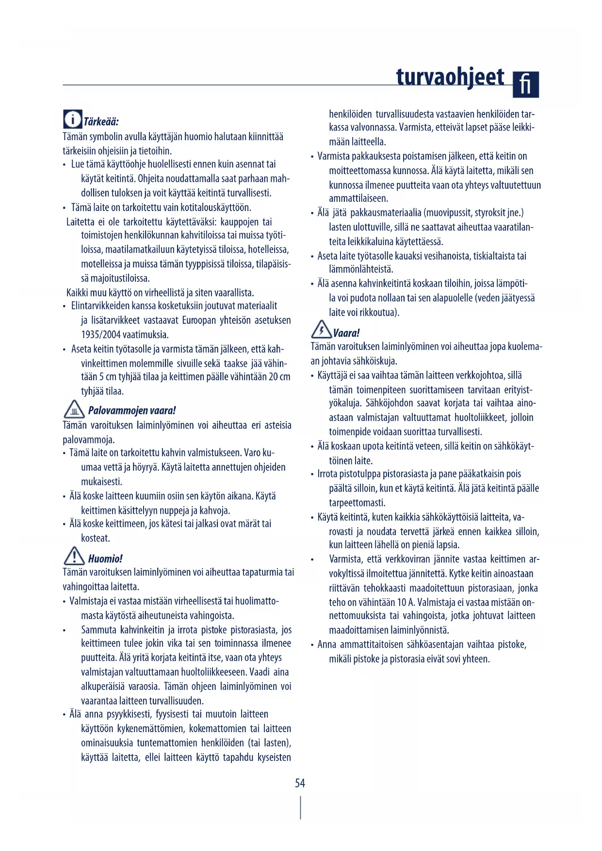 - Tämä laite on tarkoitettu kahvin valmistukseen. Varo ku- umaa vettä ja höyryä. Käytä laitetta annettujen ohjeiden mukaisesti.