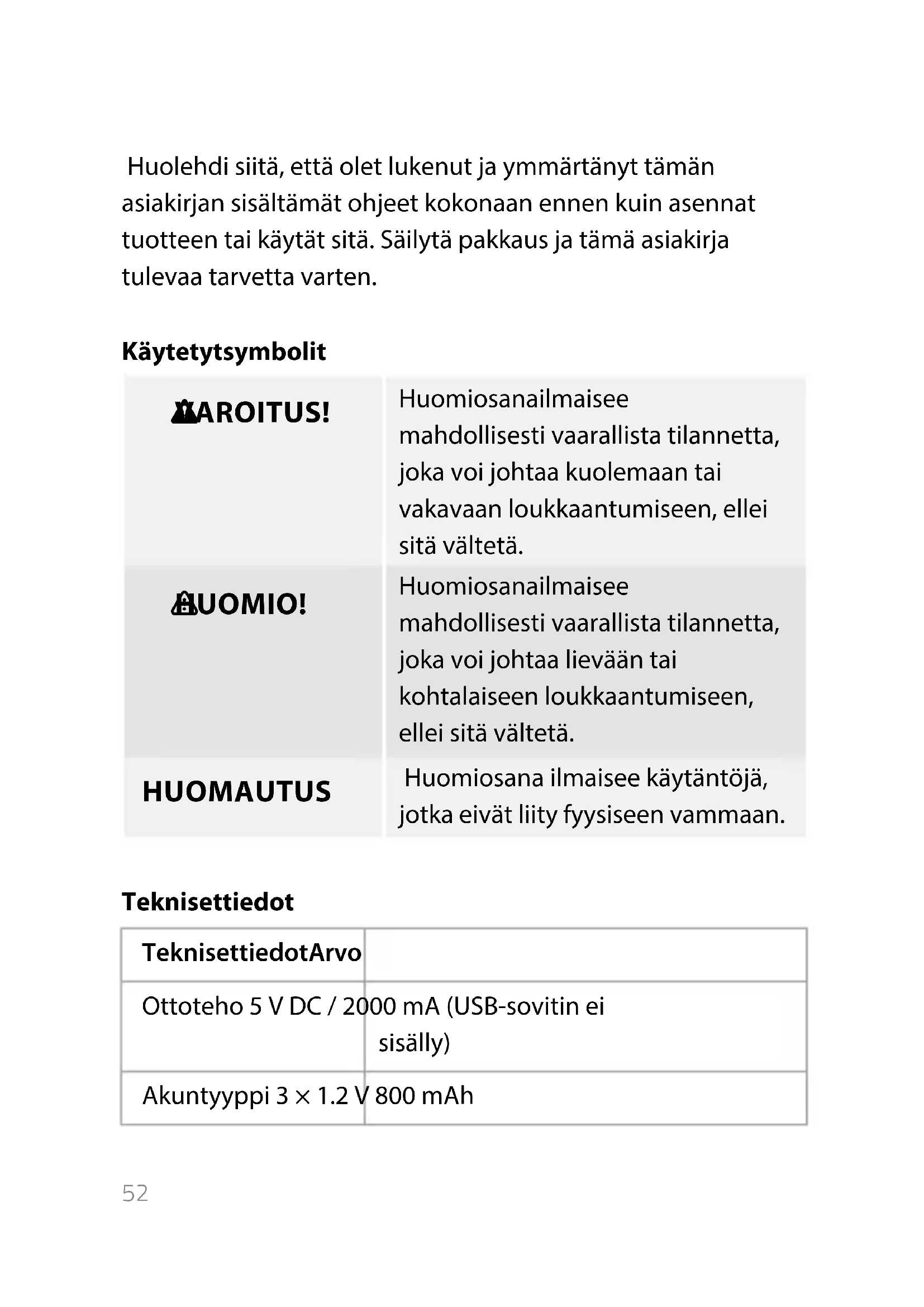 HUOMIO! Huomiosana ilmaisee mahdollisesti vaarallista tilannetta, joka voi johtaa lievään tai kohtalaiseen loukkaantumiseen, ellei sitä vältetä. HUOMAUTUS Huomiosana ilmaisee käytäntöjä, jotka eivät liity fyysiseen vammaan. Tekniset tiedot Tekniset tiedot Arvo Ottoteho 5 V DC / 2000 mA (USB-sovitin ei sisälly) Akun tyyppi 3 × 1.2 V 800 mAh53Alecto | Safety instructions Käyttötarkoitus Tämä tuote on tarkoitettu langattomaksi viestintälaitteeksi, jonka avulla käyttäjät voivat kommunikoida jopa 6 km:n etäisyyksillä avoimissa kenttäolosuhteissa. Tuote on tarkoitettu sekä sisä- että ulkokäyttöön. Tuotteen muutokset voivat vaikuttaa turvallisuuteen, takuuseen ja asianmukaiseen toimintaan. Tätä tuotetta ei ole tarkoitettu ammattikäyttöön. Turvallisuusohjeet Huolehdi siitä, että olet lukenut ja ymmärtänyt tämän asiakirjan sisältämät ohjeet kokonaan ennen kuin asennat tuotteen tai käytät sitä. Säilytä pakkaus ja tämä asiakirja tulevaa tarvetta varten.