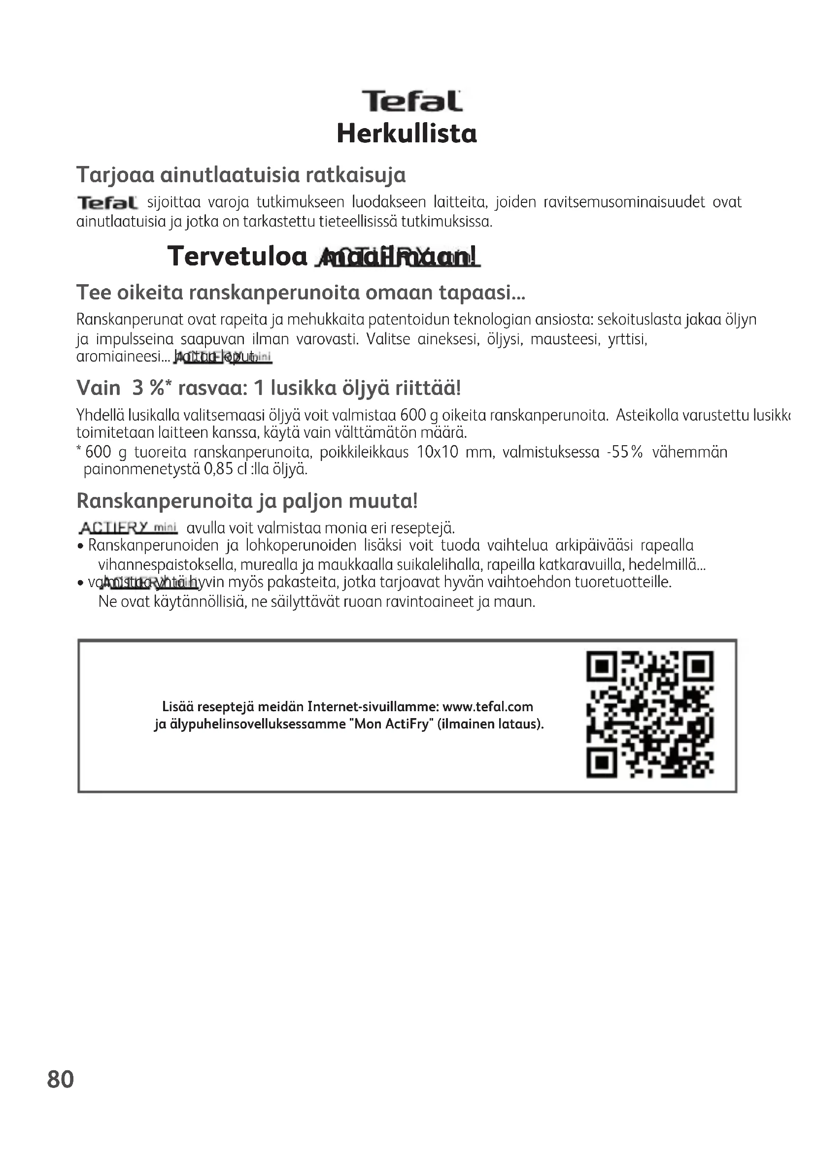 - valmistaa yhtä hyvin myös pakasteita, jotka tarjoavat hyvän vaihtoehdon tuoretuotteille. Ne ovat käytännöllisiä, ne säilyttävät ruoan ravintoaineet ja maun. Lisää reseptejä meidän Internet-sivuillamme: www.tefal.comja älypuhelinsovelluksessamme "Mon ActiFry" (ilmainen lataus).81