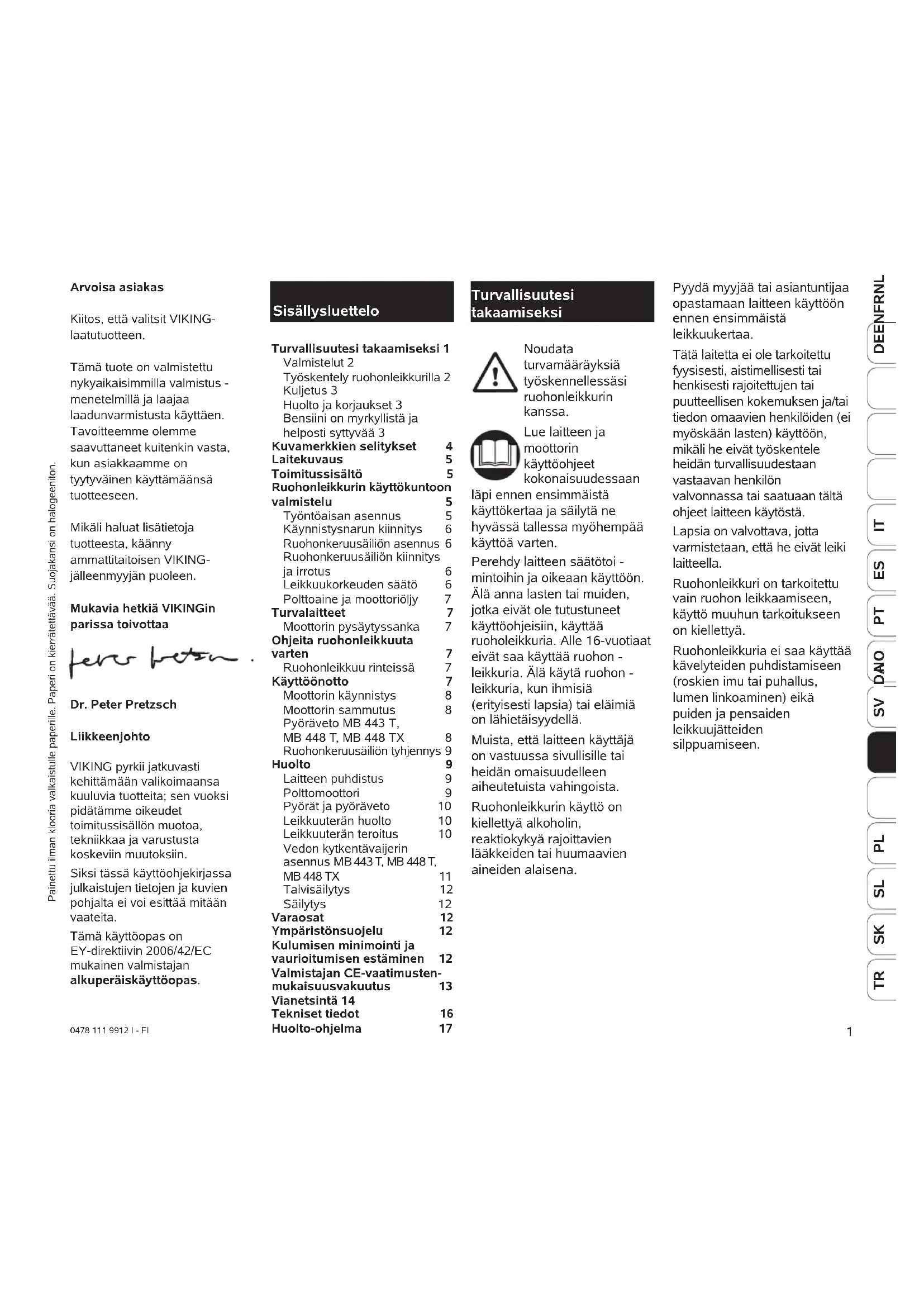 Noudata turvamääräyksiä työskennellessäsi ruohonleikkurin kanssa. Lue laitteen ja moottorin käyttöohjeet kokonaisuudessaan läpi ennen ensimmäistä käyttökertaa ja säilytä ne hyvässä tallessa myöhempää käyttöä varten. Perehdy laitteen säätötoi - mintoihin ja oikeaan käyttöön. Älä anna lasten tai muiden, jotka eivät ole tutustuneet käyttöohjeisiin, käyttää ruoholeikkuria. Alle 16-vuotiaat eivät saa käyttää ruohon - leikkuria. Älä käytä ruohon - leikkuria, kun ihmisiä (erityisesti lapsia) tai eläimiä on lähietäisyydellä. Muista, että laitteen käyttäjä on vastuussa sivullisille tai heidän omaisuudelleen aiheutetuista vahingoista. Ruohonleikkurin käyttö on kiellettyä alkoholin, reaktiokykyä rajoittavien lääkkeiden tai huumaavien aineiden alaisena. Arvoisa asiakas Kiitos, että valitsit VIKING- laatutuotteen. Tämä tuote on valmistettu nykyaikaisimmilla valmistus - menetelmillä ja laajaa laadunvarmistusta käyttäen. Tavoitteemme olemme saavuttaneet kuitenkin vasta, kun asiakkaamme on tyytyväinen käyttämäänsä tuotteeseen. Mikäli haluat lisätietoja tuotteesta, käänny ammattitaitoisen VIKING- jälleenmyyjän puoleen. Mukavia hetkiä VIKINGin parissa toivottaa Dr. Peter Pretzsch Liikkeenjohto VIKING pyrkii jatkuvasti kehittämään valikoimaansa kuuluvia tuotteita; sen vuoksi pidätämme oikeudet toimitussisällön muotoa, tekniikkaa ja varustusta koskeviin muutoksiin. Siksi tässä käyttöohjekirjassa julkaistujen tietojen ja kuvien pohjalta ei voi esittää mitään vaateita. Tämä käyttöopas on EY-direktiivin 2006/42/EC mukainen valmistajan alkuperäiskäyttöopas. Sisällysluettelo Turvallisuutesi takaamiseksi 1 Valmistelut 2 Työskentely ruohonleikkurilla 2 Kuljetus 3 Huolto ja korjaukset 3 Bensiini on myrkyllistä ja helposti syttyvää 3 Kuvamerkkien selitykset 4 Laitekuvaus 5 Toimitussisältö 5 Ruohonleikkurin käyttökuntoon valmistelu 5 Työntöaisan asennus 5 Käynnistysnarun kiinnitys 6 Ruohonkeruusäiliön asennus 6 Ruohonkeruusäiliön kiinnitys ja irrotus 6 Leikkuukorkeuden säätö 6 Polttoaine ja moottoriöljy 7 Turvalaitteet 7 Moottorin pysäytyssanka 7 Ohjeita ruohonleikkuuta varten 7 Ruohonleikkuu rinteissä 7 Käyttöönotto 7 Moottorin käynnistys 8 Moottorin sammutus 8 Pyöräveto MB 443 T, MB 448 T, MB 448 TX 8 Ruohonkeruusäiliön tyhjennys 9 Huolto 9 Laitteen puhdistus 9 Polttomoottori 9 Pyörät ja pyöräveto 10 Leikkuuterän huolto 10 Leikkuuterän teroitus 10 Vedon kytkentävaijerin asennus MB443 T, MB 448 T, MB 448 TX 11 Talvisäilytys 12 Säilytys 12 Varaosat 12 Ympäristönsuojelu 12 Kulumisen minimointi ja vaurioitumisen estäminen 12 Valmistajan CE-vaatimusten- mukaisuusvakuutus 13 Vianetsintä 14 Tekniset tiedot 16 Huolto-ohjelma 17 Turvallisuutesi takaamiseksi Pyydä myyjää tai asiantuntijaa opastamaan laitteen käyttöön ennen ensimmäistä leikkuukertaa. Tätä laitetta ei ole tarkoitettu fyysisesti, aistimellisesti tai henkisesti rajoitettujen tai puutteellisen kokemuksen ja/tai tiedon omaavien henkilöiden (ei myöskään lasten) käyttöön, mikäli he eivät työskentele heidän turvallisuudestaan vastaavan henkilön valvonnassa tai saatuaan tältä ohjeet laitteen käytöstä. Lapsia on valvottava, jotta varmistetaan, että he eivät leiki laitteella. Ruohonleikkuri on tarkoitettu vain ruohon leikkaamiseen, käyttö muuhun tarkoitukseen on kiellettyä. Ruohonleikkuria ei saa käyttää kävelyteiden puhdistamiseen (roskien imu tai puhallus, lumen linkoaminen) eikä puiden ja pensaiden leikkuujätteiden silppuamiseen. Painettu ilman klooria valkaistulle paperille. Paperi on kierrätettävää. Suojakansi on halogeeniton.2 0478 111 9912 I - FI