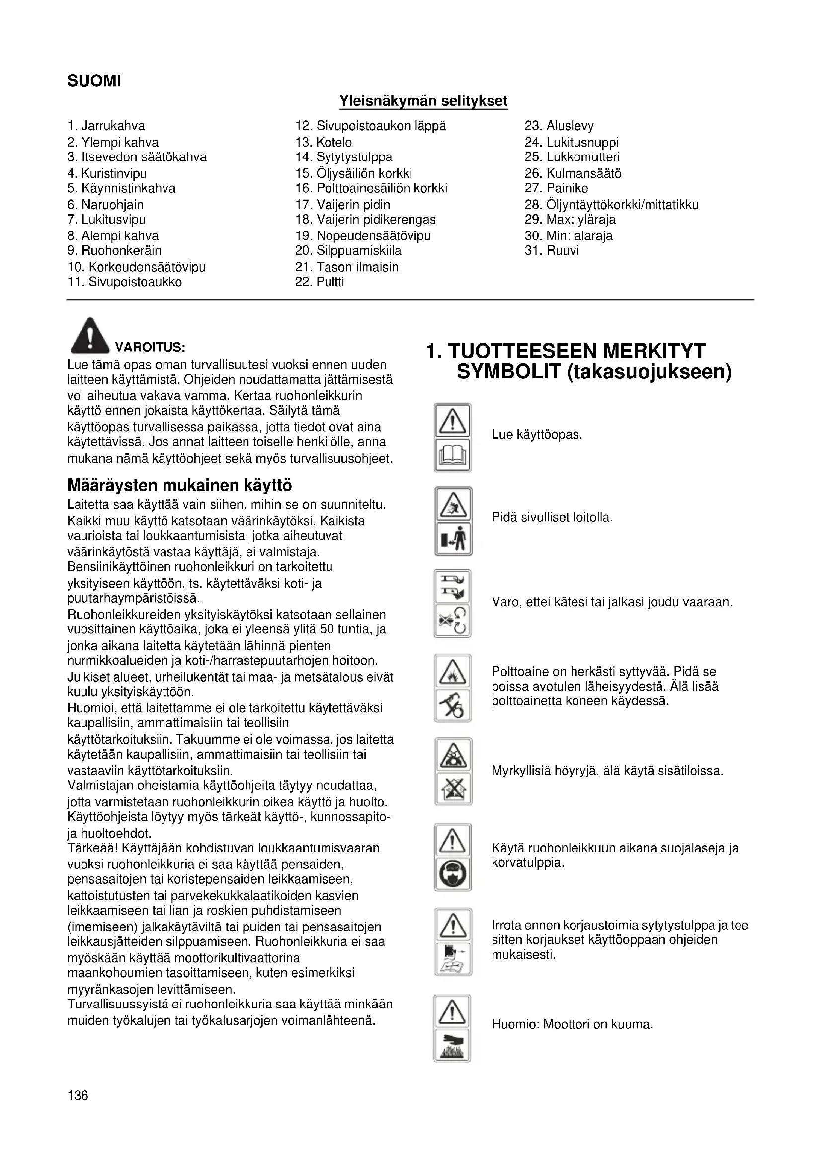 Lue käyttöopas. Pidä sivulliset loitolla. Varo, ettei kätesi tai jalkasi joudu vaaraan. Polttoaine on herkästi syttyvää. Pidä se poissa avotulen läheisyydestä. Älä lisää polttoainetta koneen käydessä. Myrkyllisiä höyryjä, älä käytä sisätiloissa. Käytä ruohonleikkuun aikana suojalaseja ja korvatulppia. Irrota ennen korjaustoimia sytytystulppa ja tee sitten korjaukset käyttöoppaan ohjeiden mukaisesti. Huomio: Moottori on kuuma.137