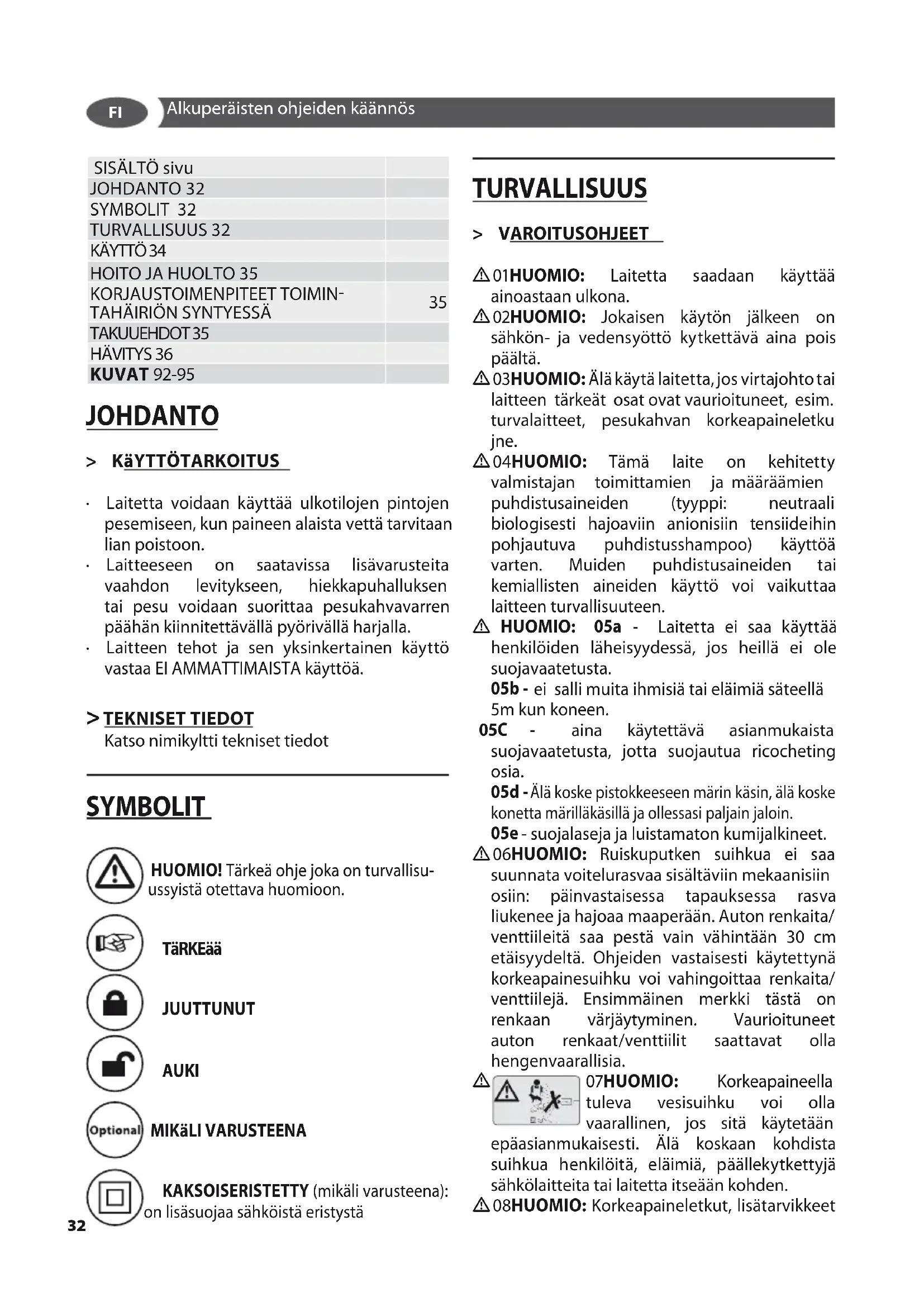 Laitteen tehot ja sen yksinkertainen käyttö vastaa EI AMMATTIMAISTA käyttöä. > TEKNISET TIEDOT Katso nimikyltti tekniset tiedot SYMBOLIT HUOMIO! Tärkeä ohje joka on turvallisu- ussyistä otettava huomioon. TäRKEää JUUTTUNUT AUKI MIKäLI VARUSTEENA KAKSOISERISTETTY (mikäli varusteena): on lisäsuojaa sähköistä eristystä TURVALLISUUS > VAROITUSOHJEET
