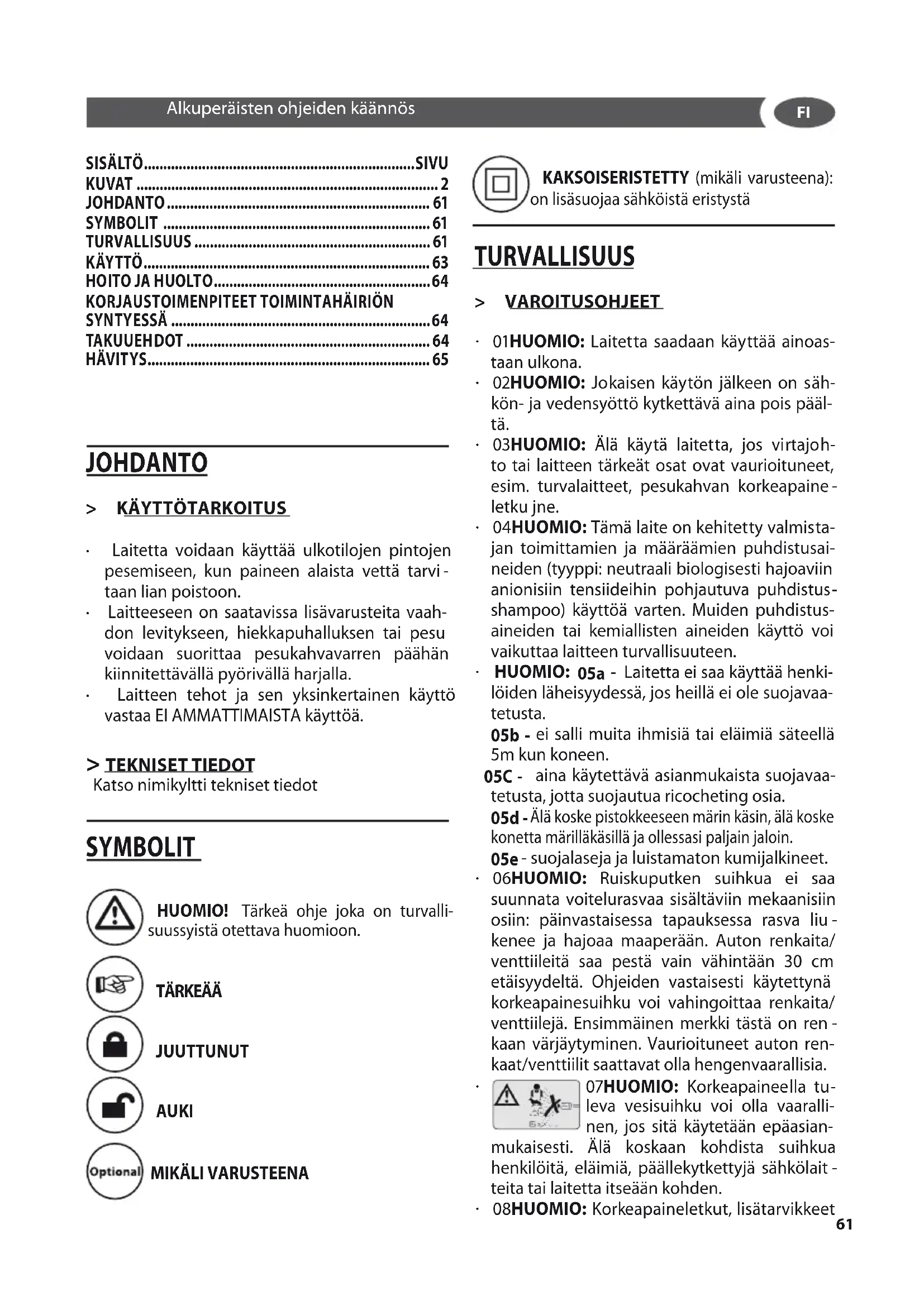 KAKSOISERISTETTY (mikäli varusteena): on lisäsuojaa sähköistä eristystä TURVALLISUUS > VAROITUSOHJEET