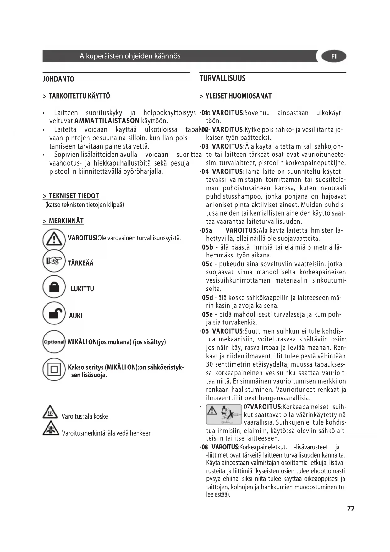 - 03 VAROITUS:Älä käytä laitetta mikäli sähköjoh- to tai laitteen tärkeät osat ovat vaurioituneete- sim. turvalaitteet, pistoolin korkeapaineputkijne.
