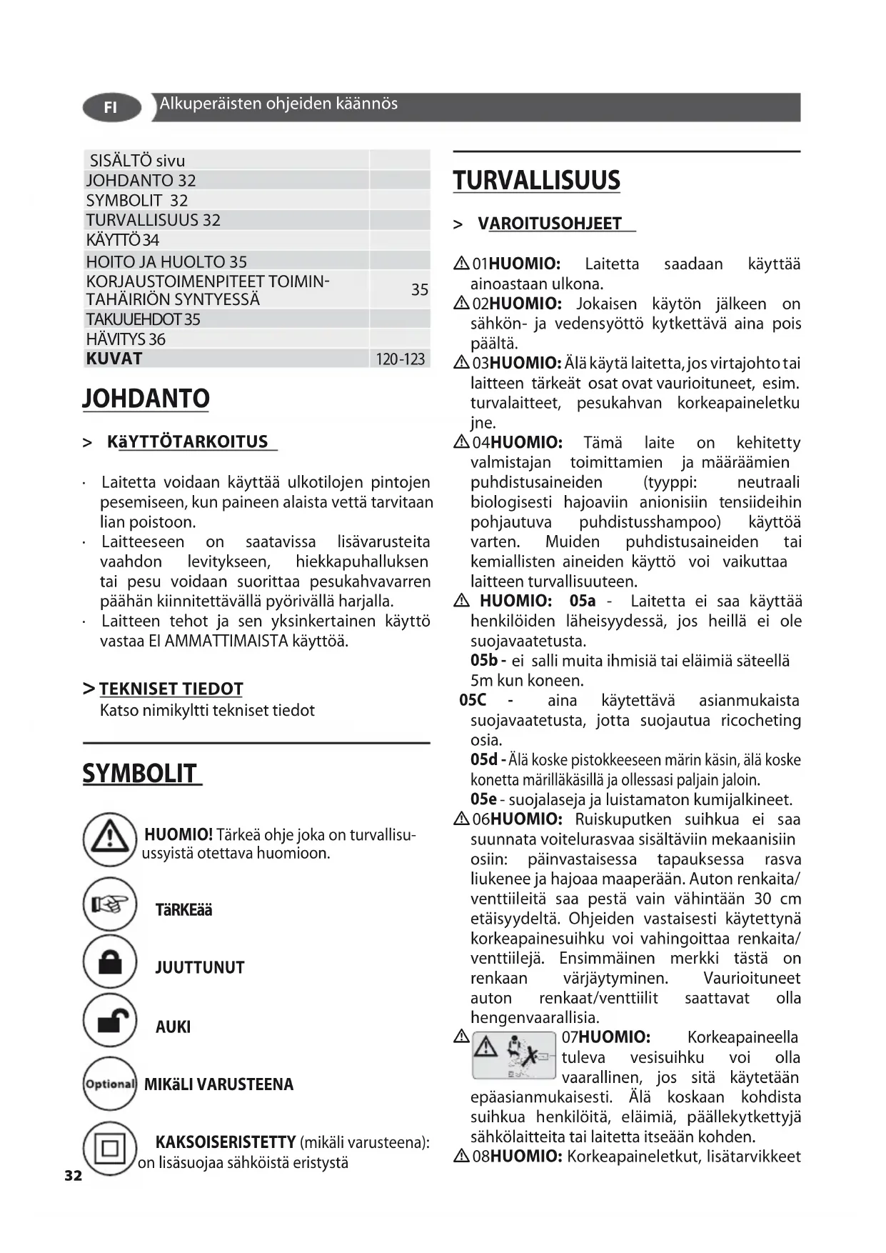 03HUOMIO: Älä käytä laitetta, jos virtajohto tai laitteen tärkeät osat ovat vaurioituneet, esim. turvalaitteet, pesukahvan korkeapaineletku jne.