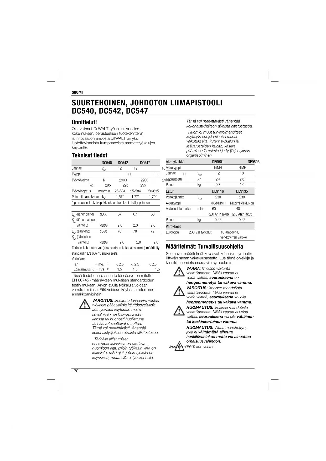 Onnittelut! Olet valinnut DEWALT-työkalun. Vuosien kokemuksen, perusteellisen tuotekehittelyn ja innovaation ansiosta D EWALT on yksi luotettavimmista kumppaneista ammattityökalujen käyttäjille. Tekniset tiedot DC540 DC542 DC547 Jännite V