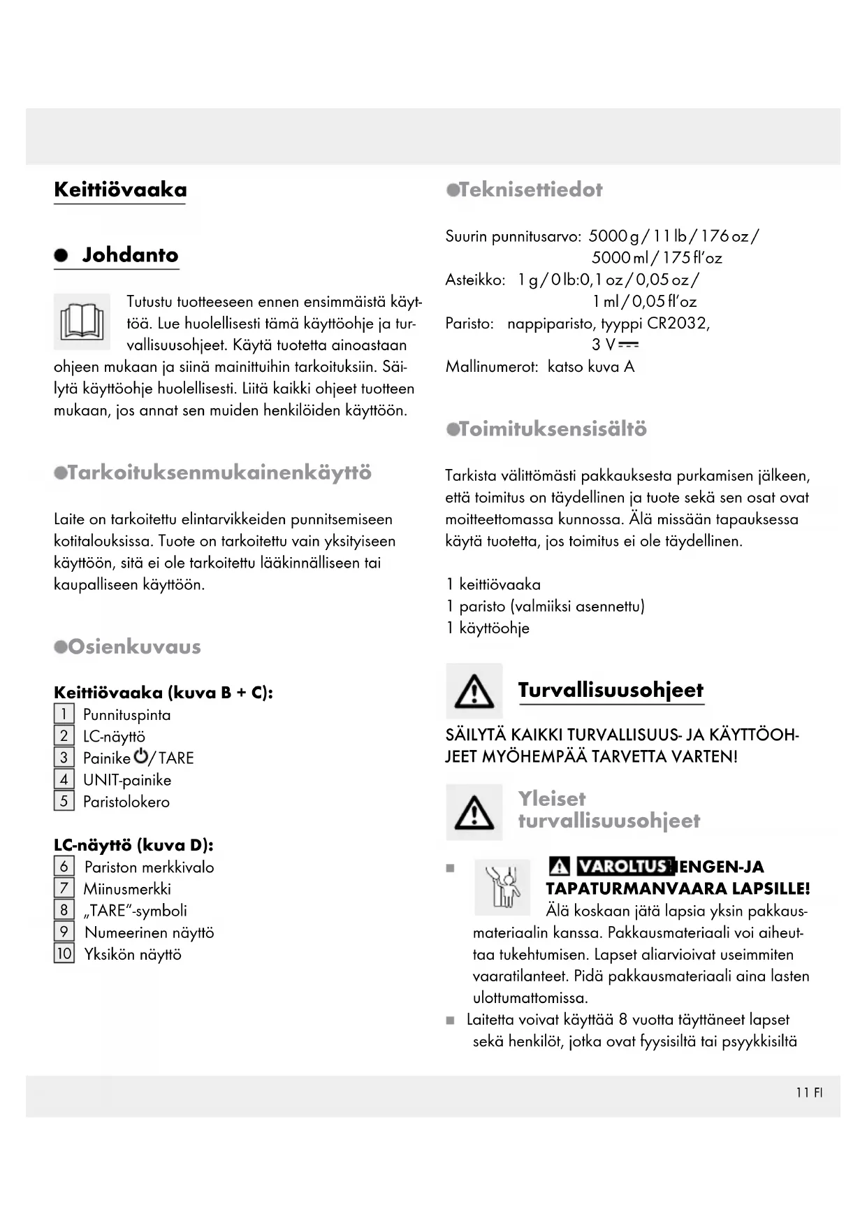 Yksikön näyttö Tekniset tiedot Suurin punnitusarvo: 5000 g / 11 lb / 176 oz / 5000 ml / 175 fl’oz Asteikko: 1 g / 0 lb:0,1 oz / 0,05 oz / 1 ml / 0,05 fl’oz Paristo: nappiparisto, tyyppi CR2032, 3 V Mallinumerot: katso kuva A Toimituksen sisältö Tarkista välittömästi pakkauksesta purkamisen jälkeen, että toimitus on täydellinen ja tuote sekä sen osat ovat moitteettomassa kunnossa. Älä missään tapauksessa käytä tuotetta, jos toimitus ei ole täydellinen. 1 keittiövaaka 1 paristo (valmiiksi asennettu) 1 käyttöohje Turvallisuusohjeet SÄILYTÄ KAIKKI TURVALLISUUS- JA KÄYTTÖOH- JEET MYÖHEMPÄÄ TARVETTA VARTEN! Yleiset turvallisuusohjeet HENGEN-JA TAPATURMANVAARA LAPSILLE! Älä koskaan jätä lapsia yksin pakkaus- materiaalin kanssa. Pakkausmateriaali voi aiheut- taa tukehtumisen. Lapset aliarvioivat useimmiten vaaratilanteet. Pidä pakkausmateriaali aina lasten ulottumattomissa. Laitetta voivat käyttää 8 vuotta täyttäneet lapset sekä henkilöt, jotka ovat fyysisiltä tai psyykkisiltä12 FI kyvyiltään tai aisteiltaan rajoittuneita tai joilla ei ole kokemusta tai tietoa laitteen käytöstä, jos he käyttävät laitetta valvonnan alaisina tai heitä on opastettu laitteen turvallisessa käytössä ja he ovat tietoisia laitteeseen liittyvistä vaaroista. Lapset eivät saa leikkiä laitteella. Lapset eivät saa puhdis- taa tai huoltaa laitetta ilman valvontaa. 5 kg VARO! LOUKKAANTUMIS- VAARA! Älä kuormita vaakaa yli 5 kg:lla. Sen ylittäminen voi vaurioittaa tuotetta. Älä altista tuotetta – äärimmäisille lämpötiloille, – suoralle auringonvalolle, – magneettiselle ympäristölle, – kosteudelle. Muutoin tuote voi vahingoittua. Suojaa laitetta sähköstaattiselta lataukselta/purka- ukselta. Ne saattavat estää sisäisen tiedonsiirron, mikä johtaa virheisiin LC-näytössä. Tarkista tuote ennen käyttöönottoa, ettei se ole vaurioitunut. Älä käytä vaurioitunutta tuotetta. Magneettiset häiriökentät saattavat estää tuotetta toimimasta. Poista tässä tapauksessa paristot tuot- teesta lyhyeksi ajaksi ja aseta ne uudelleen tuot- teeseen. ELINTARVIKKEILLE SOPIVA! Tuote ei vaikuta ruoan maku- ja hajuominai- suuksiin. Paristoja koskevat turvallisuusohjeet Poista paristot laitteesta, jos niitä ei ole käytetty pitkään aikaan. VARO! RÄJÄHDYSVAARA! Älä missään tapauksessa lataa paristoja uudelleen! Laita paristot laitteeseen aina oikein päin! Napaisuus on merkitty paristolokeroon. Puhdista tarvittaessa paristojen ja laitteen kontakti- pinnat, ennen kuin asetat paristot paikoilleen. Poista loppuun käytetyt paristot heti laitteesta. Paristot voivat vuotaa! Säilytä paristot lasten ulottumattomissa. Älä kos- kaan heitä paristoja tuleen äläkä oikosulje tai pura niitä. Jos edellä mainittuja ohjeita ei noudateta, paristot voivat tyhjentyä loppujännitettä tyhjemmiksi. Paris- tot voivat silloin vuotaa. Jos paristot ovat vuota- neet laitteeseen, poista ne heti, jotta vältät laitteen vioittumisen! Vältä kosketusta ihoon, silmiin ja lima- kalvoihin. Jos paristohappoa joutuu iholle, huuhtele kyseinen kohta run- saalla määrällä vettä ja / tai mene lääkäriin! Käyttöönotto Poista eristysliuska paristolokerosta