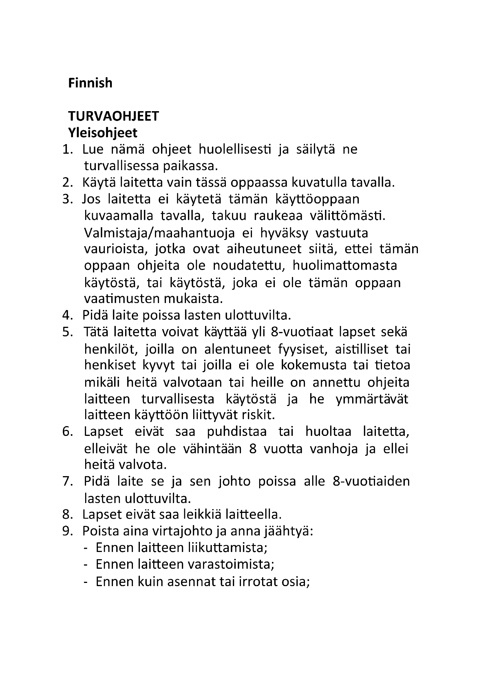 - Jos laitetta ei käytetä tämän käytöoppaan kuvaamalla ravall, takuu raukeaa valittomasti. Valmistaja/maahantuoja ei hyväksy vastuuta vaurioista, jotka ovat aiheituneet siitä, ettei tämän oppaan ohjeita ole noudatetu, huolimattomasta käytösta, tai käytösta, joka ei ole tämän oppaan vaatimusten mukaista.