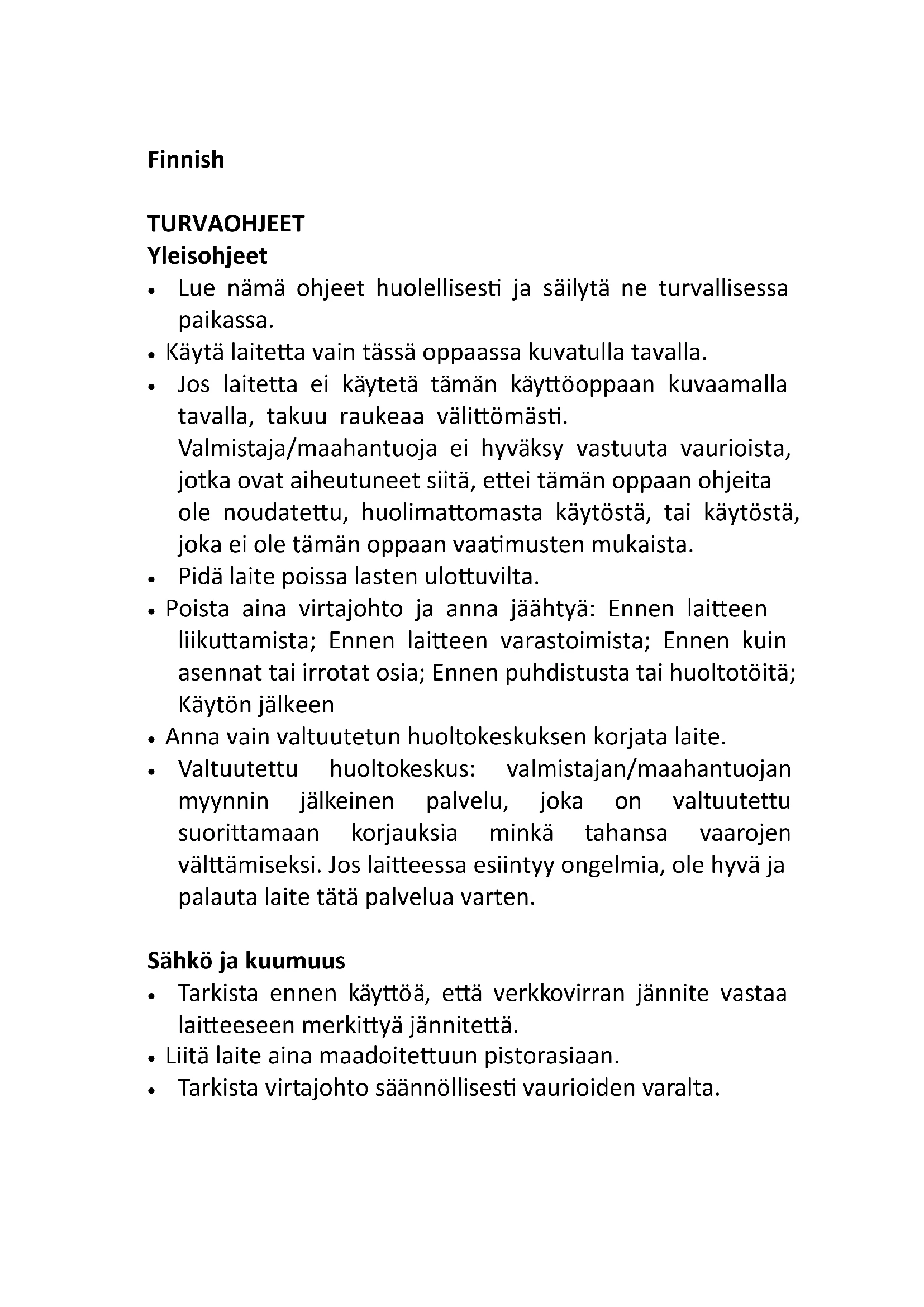 Tätä laitetta voivat käytää yli 8-vuotiaat lapset sekä henkilöt, joilla on alentuneet fyysiset, aistilliset tai henkiset kyvyt tai joilla ei ole kokemusta tai tietoa mikäi heitä valvotaan tai/heille on annetu ohjeita laitteen turvallisesta käytõstä ja he ymmärävat laitteen käyttoön liittyvärt riskit.