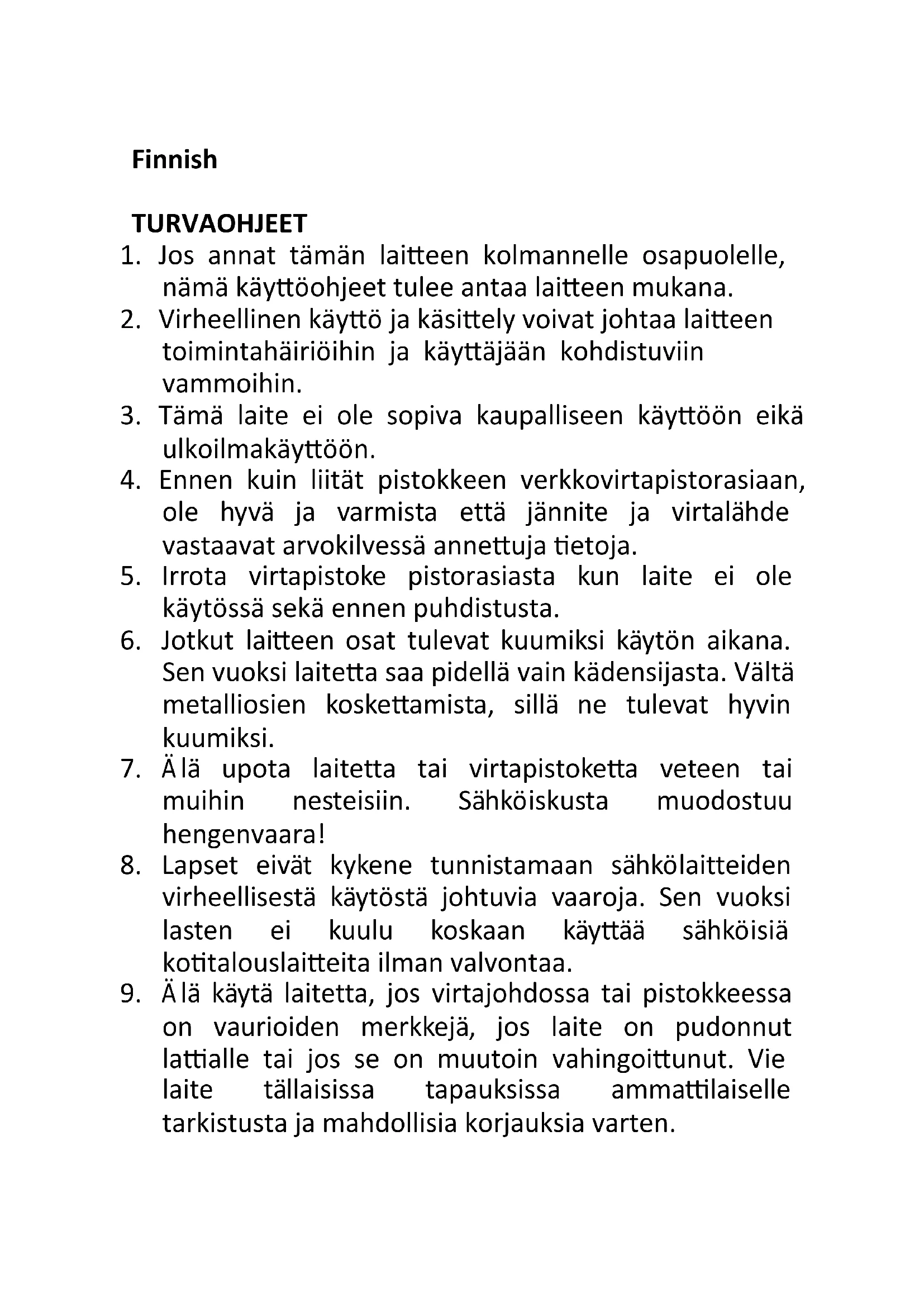- Tätä laitetta voivat käyttää yli 8-vuotiaat lapset sekä henkilöt, joilla on alentuneet fyysiset, aistilliset tai henkiset kyvyt tai joilla ei ole kokemusta tai tietoa mikäli heitä valvotaan tai heille on annettu ohjeita laitteen turvallisesta käytöstä ja he ymmärtävät laitteen käyttöön liittyvät riskit.