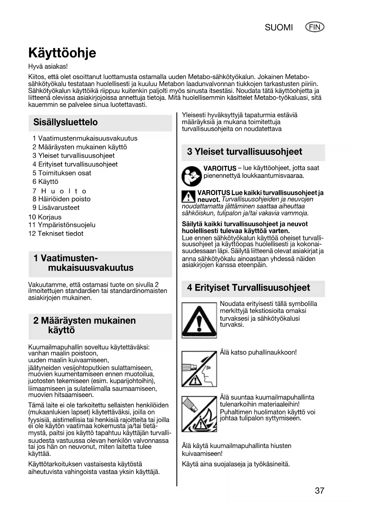 FIN 1 Vaatimustenmukaisuusvakuutus 2 Määräysten mukainen käyttö 3 Yleiset turvallisuusohjeet 4 Erityiset turvallisuusohjeet 5 Toimituksen osat 6 Käyttö 7Huolto 8 Häiriöiden poisto 9 Lisävarusteet 10 Korjaus 11 Ympäristönsuojelu 12 Tekniset tiedot Vakuutamme, että ostamasi tuote on sivulla 2 ilmoitettujen standardien tai standardinomaisten asiakirjojen mukainen. Kuumailmapuhallin soveltuu käytettäväksi: vanhan maalin poistoon, uuden maalin kuivaamiseen, jäätyneiden vesijohtoputkien sulattamiseen, muovien kuumentamiseen ennen muotoilua, juotosten tekemiseen (esim. kuparijohtoihin), liimaamiseen ja sulateliimalla saumaamiseen, muovien hitsaamiseen. Tämä laite ei ole tarkoitettu sellaisten henkilöiden (mukaanlukien lapset) käytettäväksi, joilla on fyysisiä, aistimellisia tai henkisiä rajoitteita tai joilla ei ole käytön vaatimaa kokemusta ja/tai tietä- mystä, paitsi jos käyttö tapahtuu käyttäjän turvalli- suudesta vastuussa olevan henkilön valvonnassa tai jos hän on neuvonut, miten laitetta tulee käyttää. Käyttötarkoituksen vastaisesta käytöstä aiheutuvista vahingoista vastaa yksin käyttäjä. Yleisesti hyväksyttyjä tapaturmia estäviä määräyksiä ja mukana toimitettuja turvallisuusohjeita on noudatettava VAROITUS – lue käyttöohjeet, jotta saat pienennettyä loukkaantumisvaaraa. VAROITUS Lue kaikki turvallisuusohjeet ja neuvot. Turvallisuusohjeiden ja neuvojen noudattamatta jättäminen saattaa aiheuttaa sähköiskun, tulipalon ja/tai vakavia vammoja. Säilytä kaikki turvallisuusohjeet ja neuvot huolellisesti tulevaa käyttöä varten. Lue ennen sähkötyökalun käyttöä oheiset turvalli- suusohjeet ja käyttöopas huolellisesti ja kokonai- suudessaan läpi. Säilytä liitteenä olevat asiakirjat ja anna sähkötyökalu ainoastaan yhdessä näiden asiakirjojen kanssa eteenpäin. Noudata erityisesti tällä symbolilla merkittyjä tekstiosioita omaksi turvaksesi ja sähkötyökalusi turvaksi. Älä katso puhallinaukkoon! Älä suuntaa kuumailmapuhallinta tulenarkoihin materiaaleihin! Puhaltimen huolimaton käyttö voi johtaa tulipalon syttymiseen. Älä käytä kuumailmapuhallinta hiusten kuivaamiseen! Käytä aina suojalaseja ja työkäsineitä. Käyttöohje Hyvä asiakas! Kiitos, että olet osoittanut luottamusta ostamalla uuden Metabo-sähkötyökalun. Jokainen Metabo- sähkötyökalu testataan huolellisesti ja kuuluu Metabon laadunvalvonnan tiukkojen tarkastusten piiriin. Sähkötyökalun käyttöikä riippuu kuitenkin paljolti myös sinusta itsestäsi. Noudata tätä käyttöohjetta ja liitteenä olevissa asiakirjojoissa annettuja tietoja. Mitä huolellisemmin käsittelet Metabo-työkaluasi, sitä kauemmin se palvelee sinua luotettavasti. Sisällysluettelo 1 Vaatimusten- mukaisuusvakuutus 2 Määräysten mukainen käyttö 3 Yleiset turvallisuusohjeet 4 Erityiset Turvallisuusohjeet 17024612_0409 HE 2300 HE 2000 H 1600.book Seite 37 Dienstag, 16. Juni 2009 11:40 1138 SUOMI FIN Noudata puhaltimen käytössä erityistä varovaisuutta palavien materiaalien ja räjähtävien kaasujen läheisyydessä. Älä suuntaa puhallinta pitkäksi aikaa samaan kohtaan! Lämpö saattaa levitä helposti syttyviin materiaaleihin, jotka eivät ole näköetäisyydellä. Käytä kuumailmapuhallinta vain hyvin tuuletetuissa tiloissa. Älä hengitä kuumailmapuhaltimen käytön yhteydessä syntyviä höyryjä! Älä jätä puhallinta käytön aikana vaille huomiota. Anna kuumailmapuhaltimen jäähtyä käytön jälkeen alustalla! Palovammojen vaara: älä koske kuumaan puhallinaukkoon. Huolehdi siitä, että lapset eivät pääse leikkimään koneen kanssa. (Ks. sivu 3) 1 (HE 2300 Control) LCD-lämpötilannäyttö 2 Pitävä alusta 3 Ilmansuodatin 4 (HE 2000, HE 2300 Control) Katkaisin (kaksiosainen) Ilman lämpötila ja määrä voidaan säätää toisistaan riippumatta. (H 1600) Liukukytkin ilman lämpötilan ja määrän säätämiseksi Varmista ennen käyttöönottoa, että laitteen tyyppikilpeen merkitty verkkojännite ja verkkotaajuus vastaavat paikallisen sähköverkon arvoja. Estä ylikuumeneminen: - Älä työskentele jos ilmasuodattimet ovat tukossa. Puhdista ilmasuodatin ajoissa. - Älä tuki poistoilman putkea. Pidä vähintään 4 cm etäisyys työstettävään kappaleeseen äläkä kohdista ilmasuihkua pystysuoraan työstettävään kappaleeseen. Paikalliskäyttö Aseta kuumailmapuhallin tukevalle alustalle (2) paikalliskäyttöä varten. H 1600 Liukukytkimellä (4) laite voidaan kytkeä päälle ja pois päältä sekä valita kolmen puhallin- ja lämpöasteen välillä. HE 2000, HE 2300 Control Kahdella liukukytkimellä (4) ilman määrä ja lämpötila voidaan säätää toisitaan riippumatta. Mustalla liukukytkimellä laite kytketään päälle ja pois päältä sekä valitaan kolmen puhallintehon välillä. Punaisella liukukytkimellä voidaan säätää lämpötila portaattomasti. Elektroniikka valvoo lämpötilaa ja suojaa kuumennuskierukkaa. HE 2300 Control Puhalluslämpö säädetään punaisella liukukytkimellä. Esivalittu lämpötila voidaan lukea nestekidenäytöstä (1). Lämpötilan esivalinnan jälkeen näyttöön ilmestyy kolmen sekunnin kuluttua puhallusilman senhetkinen lämpötila. (Lämpötila näytetään 10 asteen tarkkuudella.)