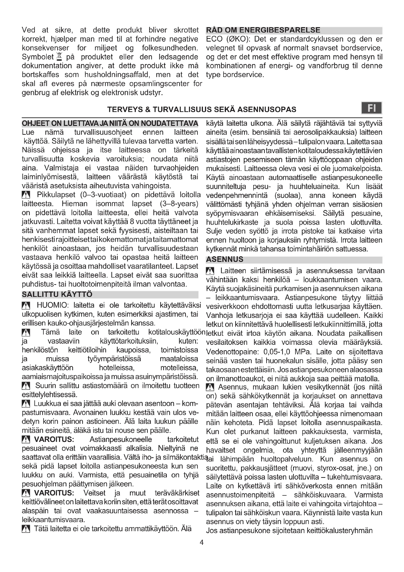 Arvokilpi on astianpesukoneen luukun reunassa (näkyy luukun ollessa auki). Laite on voitava kytkeä irti sähköverkosta irrottamalla pistoke pistorasiasta, jos pistorasia on saavutettavissa, tai pistorasian edelle asennetusta moninapaisesta kytkimestä; lisäksi laite on maadoitettava sähköistä turvallisuutta koskevien kansallisten määräysten mukaisesti. Älä käytä jatkojohtoja, haaroitusrasioita tai adaptereita. Kun asennus on tehty, sähköosat eivät saa olla käyttäjän ulottuvilla. Älä käytä laitetta kun olet märkä tai kun olet paljain jaloin. Älä käytä tätä laitetta, jos virtajohto tai pistoke on vahingoittunut, jos laite ei toimi kunnolla tai jos se on vaurioitunut tai pudonnut. Jos virtajohto on vahingoittunut, on sen tilalle vaihdettava toinen samanlainen; vaaratilanteiden estämiseksi vaihdon saa suorittaa valmistaja, sen huoltohenkilö tai vastaava pätevä henkilö – sähköiskun vaara. Jos asennettu pistoke ei sovi kiinteistön pistorasiaan, on otettava yhteyttä ammattitaitoiseen