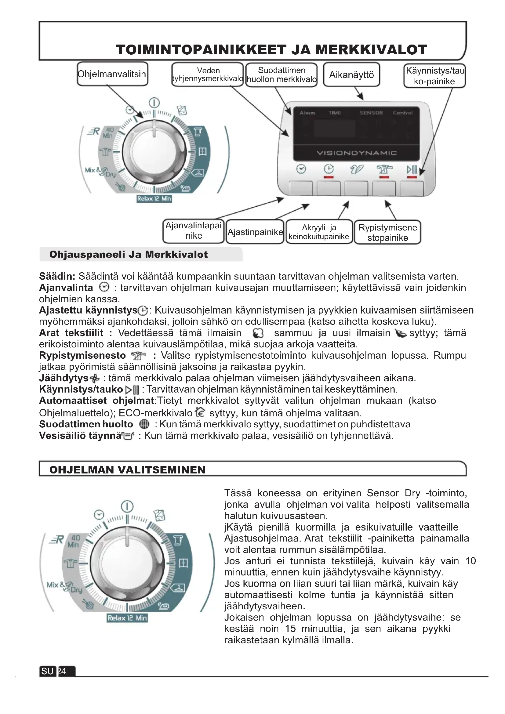 40 Min Mix & Dry Relax 12 MinTässä koneessa on erityinen Sensor Dry -toiminto, jonka avulla ohjelman voi valita helposti valitsemalla halutun kuivuusasteen.