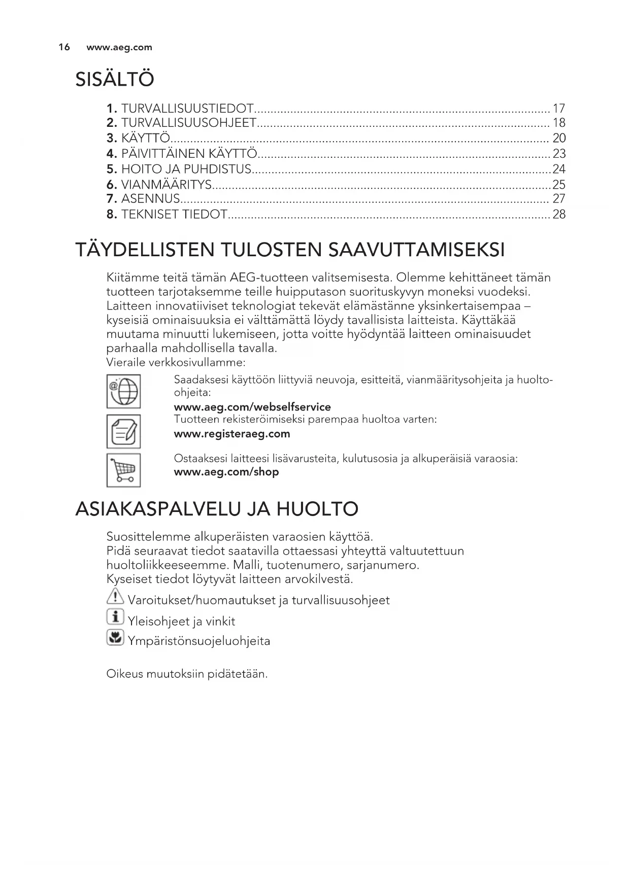 Suosittelemme alkuperäisten varaosien käyttöä. Pidä seuraavat tiedot saatavilla ottaessasi yhteyttä valtuutettuun huoltoliikkeeseemme. Malli, tuotenumero, sarjanumero. Kyseiset tiedot löytyvät laitteen arvokilvestä. Varoitukset/huomautukset ja turvallisuusohjeet Yleisohjeet ja vinkit Ympäristönsuojeluohjeita Oikeus muutoksiin pidätetään. www.aeg.com