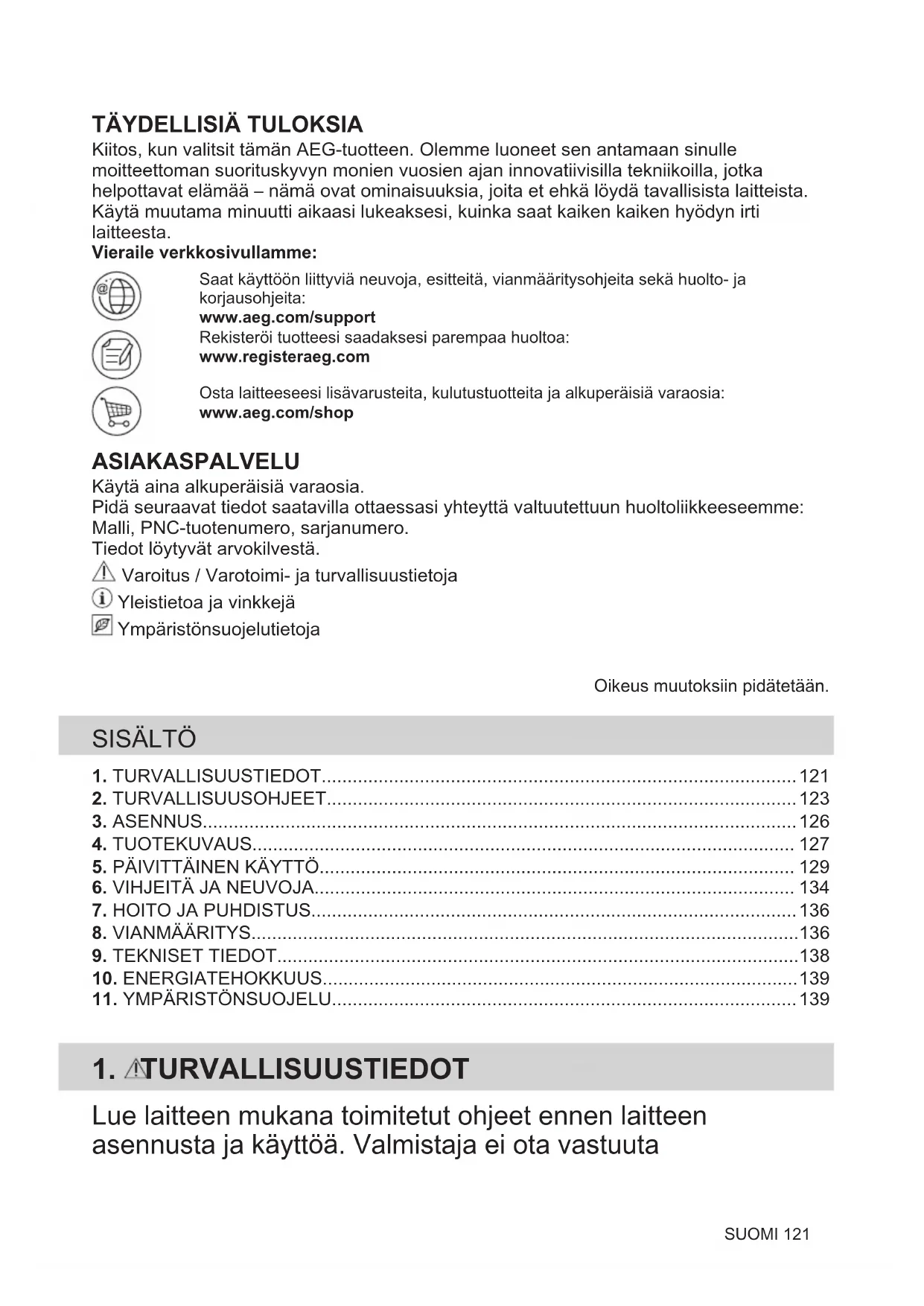 Kiitos, kun valitsit tämän AEG-tuotteen. Olemme luoneet sen antamaan sinulle moitteettoman suorituskyvyn monien vuosien ajan innovatiivisilla tekniikoilla, jotka helpottavat elämää – nämä ovat ominaisuuksia, joita et ehkä löydä tavallisista laitteista. Käytä muutama minuutti aikaasi lukeaksesi, kuinka saat kaiken kaiken hyödyn irti laitteesta. Vieraile verkkosivullamme:Saat käyttöön liittyviä neuvoja, esitteitä, vianmääritysohjeita sekä huolto- jakorjausohjeita:www.aeg.com/supportRekisteröi tuotteesi saadaksesi parempaa huoltoa:www.registeraeg.comOsta laitteeseesi lisävarusteita, kulutustuotteita ja alkuperäisiä varaosia:www.aeg.com/shop ASIAKASPALVELU Käytä aina alkuperäisiä varaosia. Pidä seuraavat tiedot saatavilla ottaessasi yhteyttä valtuutettuun huoltoliikkeeseemme: Malli, PNC-tuotenumero, sarjanumero. Tiedot löytyvät arvokilvestä. Varoitus / Varotoimi- ja turvallisuustietoja Yleistietoa ja vinkkejä Ympäristönsuojelutietoja Oikeus muutoksiin pidätetään. SISÄLTÖ