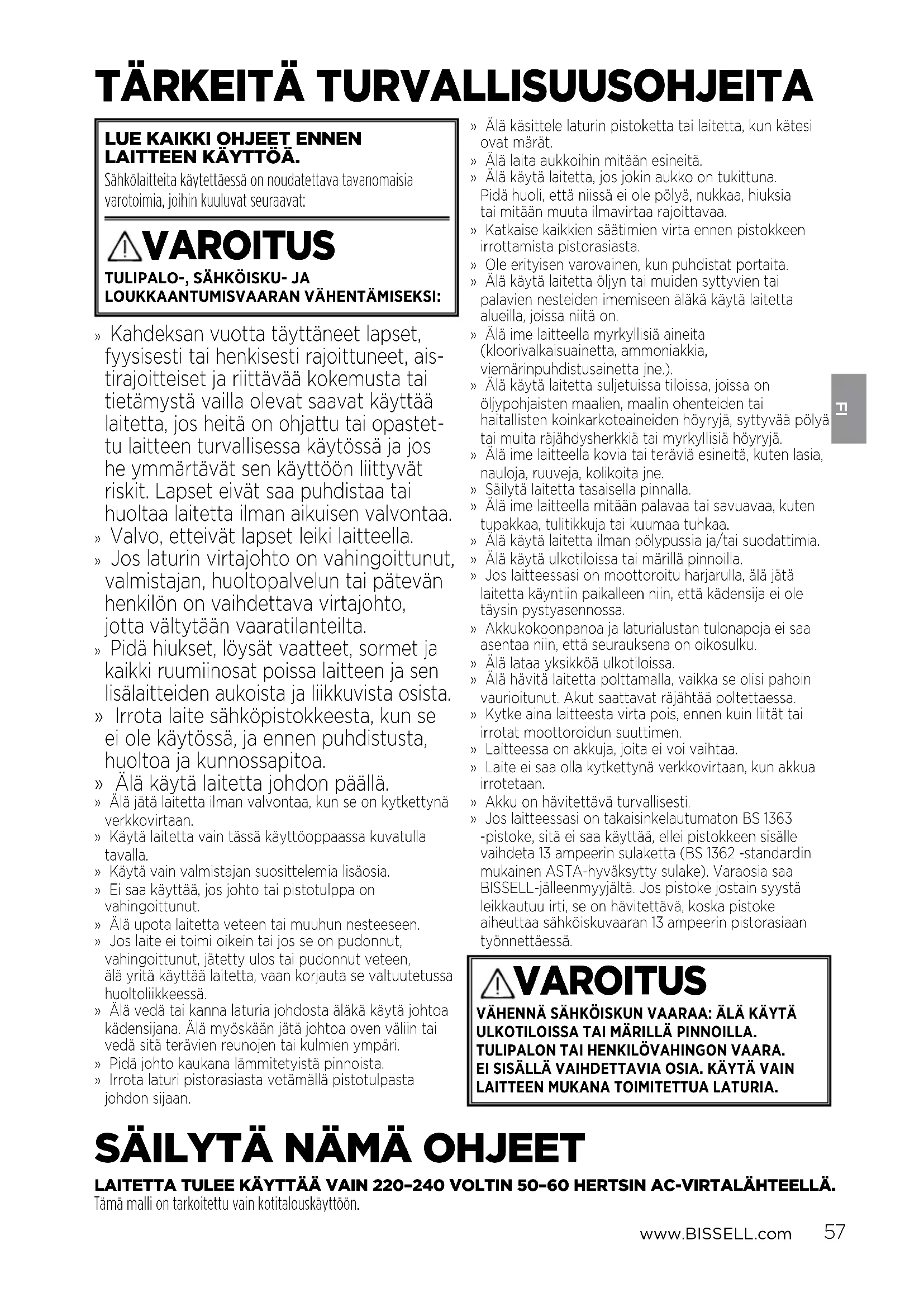 LAITTEEN KÄYTTÖÄ. Sähkölaitteita käytettäessä on noudatettava tavanomaisia varotoimia, joihin kuuluvat seuraavat: VAROITUS TULIPALO-, SÄHKÖISKU- JA LOUKKAANTUMISVAARAN VÄHENTÄMISEKSI:» Kahdeksan vuotta täyttäneet lapset, fyysisesti tai henkisesti rajoittuneet, ais- tirajoitteiset ja riittävää kokemusta tai tietämystä vailla olevat saavat käyttää laitetta, jos heitä on ohjattu tai opastet- tu laitteen turvallisessa käytössä ja jos he ymmärtävät sen käyttöön liittyvät riskit. Lapset eivät saa puhdistaa tai huoltaa laitetta ilman aikuisen valvontaa. » Valvo, etteivät lapset leiki laitteella.» Jos laturin virtajohto on vahingoittunut, valmistajan, huoltopalvelun tai pätevän henkilön on vaihdettava virtajohto, jottavältytään vaaratilanteilta. » Pidä hiukset, löysät vaatteet, sormet ja kaikki ruumiinosat poissa laitteen ja sen lisälaitteiden aukoista ja liikkuvista osista. » Irrota laite sähköpistokkeesta, kun se ei ole käytössä, ja ennen puhdistusta, huoltoa ja kunnossapitoa. » Älä käytä laitetta johdon päällä. » Älä jätä laitetta ilman valvontaa, kun se on kytkettynä verkkovirtaan.» Käytä laitetta vain tässä käyttöoppaassa kuvatulla tavalla.» Käytä vain valmistajan suosittelemia lisäosia.» Ei saa käyttää, jos johto tai pistotulppa on vahingoittunut.» Älä upota laitetta veteen tai muuhun nesteeseen.» Jos laite ei toimi oikein tai jos se on pudonnut, vahingoittunut, jätetty ulos tai pudonnut veteen, äläyritä käyttää laitetta, vaan korjauta se valtuutetussa huoltoliikkeessä.» Älä vedä tai kanna laturia johdosta äläkä käytä johtoa kädensijana. Älä myöskään jätä johtoa oven väliin tai vedä sitä terävien reunojen tai kulmien ympäri.» Pidä johto kaukana lämmitetyistä pinnoista.» Irrota laturi pistorasiasta vetämällä pistotulpasta johdon sijaan.» Älä käsittele laturin pistoketta tai laitetta, kun kätesi ovat märät.» Älä laita aukkoihin mitään esineitä.» Älä käytä laitetta, jos jokin aukko on tukittuna. Pidähuoli, että niissä ei ole pölyä, nukkaa, hiuksia taimitään muuta ilmavirtaa rajoittavaa.» Katkaise kaikkien säätimien virta ennen pistokkeen irrottamista pistorasiasta.» Ole erityisen varovainen, kun puhdistat portaita.» Älä käytä laitetta öljyn tai muiden syttyvien tai palavien nesteiden imemiseen äläkä käytä laitetta alueilla, joissa niitä on.» Älä ime laitteella myrkyllisiä aineita (kloorivalkaisuainetta, ammoniakkia, viemärinpuhdistusainetta jne.).» Älä käytä laitetta suljetuissa tiloissa, joissa on öljypohjaisten maalien, maalin ohenteiden tai haitallisten koinkarkoteaineiden höyryjä, syttyvää pölyä tai muita räjähdysherkkiä tai myrkyllisiä höyryjä.» Älä ime laitteella kovia tai teräviä esineitä, kuten lasia, nauloja, ruuveja, kolikoita jne.» Säilytä laitetta tasaisella pinnalla.» Älä ime laitteella mitään palavaa tai savuavaa, kuten tupakkaa, tulitikkuja tai kuumaa tuhkaa.» Älä käytä laitetta ilman pölypussia ja/tai suodattimia.» Älä käytä ulkotiloissa tai märillä pinnoilla.» Jos laitteessasi on moottoroitu harjarulla, älä jätä laitetta käyntiin paikalleen niin, että kädensija ei ole täysin pystyasennossa.» Akkukokoonpanoa ja laturialustan tulonapoja ei saa asentaa niin, että seurauksena on oikosulku.» Älä lataa yksikköä ulkotiloissa.» Älä hävitä laitetta polttamalla, vaikka se olisi pahoin vaurioitunut. Akut saattavat räjähtää poltettaessa.» Kytke aina laitteesta virta pois, ennen kuin liität tai irrotat moottoroidun suuttimen.» Laitteessa on akkuja, joita ei voi vaihtaa.» Laite ei saa olla kytkettynä verkkovirtaan, kun akkua irrotetaan.» Akku on hävitettävä turvallisesti.» Jos laitteessasi on takaisinkelautumaton BS 1363 -pistoke, sitä ei saa käyttää, ellei pistokkeen sisälle vaihdeta 13 ampeerin sulaketta (BS 1362 -standardin mukainen ASTA-hyväksytty sulake). Varaosia saa BISSELL-jälleenmyyjältä. Jos pistoke jostain syystä leikkautuu irti, se on hävitettävä, koska pistoke aiheuttaa sähköiskuvaaran 13ampeerin pistorasiaan työnnettäessä.