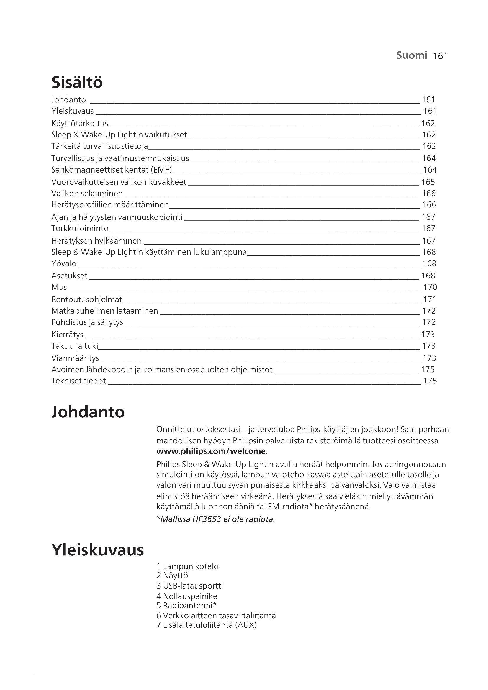 Suomi Sisältö Johdanto ________________________________________________________________________________ 161 Yleiskuvaus _______________________________________________________________________________ 161 Käyttötarkoitus ___________________________________________________________________________ 162 Sleep & Wake-Up Lightin vaikutukset ________________________________________________________ 162 Tärkeitä turvallisuustietoja__________________________________________________________________ 162 Turvallisuus ja vaatimustenmukaisuus________________________________________________________ 164 Sähkömagneettiset kentät (EMF) ____________________________________________________________ 164 Vuorovaikutteisen valikon kuvakkeet ________________________________________________________ 165 Valikon selaaminen________________________________________________________________________ 166 Herätysprofiilien määrittäminen_____________________________________________________________ 166 Ajan ja hälytysten varmuuskopiointi _________________________________________________________ 167 Torkkutoiminto ___________________________________________________________________________ 167 Herätyksen hylkääminen ___________________________________________________________________ 167 Sleep & Wake-Up Lightin käyttäminen lukulamppuna__________________________________________ 168 Yövalo ___________________________________________________________________________________ 168 Asetukset ________________________________________________________________________________ 168 Mus. _____________________________________________________________________________________ 170 Rentoutusohjelmat ________________________________________________________________________ 171 Matkapuhelimen lataaminen _______________________________________________________________ 172 Puhdistus ja säilytys________________________________________________________________________ 172 Kierrätys _________________________________________________________________________________ 173 Takuu ja tuki______________________________________________________________________________ 173 Vianmääritys______________________________________________________________________________ 173 Avoimen lähdekoodin ja kolmansien osapuolten ohjelmistot ___________________________________ 175 Tekniset tiedot ____________________________________________________________________________ 175 Johdanto Onnittelut ostoksestasi – ja tervetuloa Philips-käyttäjien joukkoon! Saat parhaan mahdollisen hyödyn Philipsin palveluista rekisteröimällä tuotteesi osoitteessa www.philips.com/welcome. Philips Sleep & Wake-Up Lightin avulla heräät helpommin. Jos auringonnousun simulointi on käytössä, lampun valoteho kasvaa asteittain asetetulle tasolle ja valon väri muuttuu syvän punaisesta kirkkaaksi päivänvaloksi. Valo valmistaa elimistöä heräämiseen virkeänä. Herätyksestä saa vieläkin miellyttävämmän käyttämällä luonnon ääniä tai FM-radiota* herätysäänenä. *Mallissa HF3653 ei ole radiota. Yleiskuvaus 1 Lampun kotelo 2 Näyttö 3 USB-latausportti 4 Nollauspainike 5 Radioantenni* 6 Verkkolaitteen tasavirtaliitäntä 7 Lisälaitetuloliitäntä (AUX)162 Suomi 8 Kaiutin 9 Torkku-/yövalopainike 10 Verkkolaite 11 Pieni liitin *Mallissa HF3653 ei ole radiota. Käyttötarkoitus Philips Sleep & Wake-Up Light on tarkoitettu auttamaan sinua heräämään entistä luonnollisemmin ja virkeämmin sekä saamaan sinut rentoutumaan ennen nukkumaanmenoa. Sitä ei ole tarkoitettu yleisvalaistukseen. Sleep & Wake-Up Lightin vaikutukset Unen viimeisten 30 minuutin ajan Philips Sleep & Wake-Up Light -herätysvalo valmistaa elimistöä heräämistä varten. Varhain aamulla silmämme ovat herkemmät valolle kuin hereillä ollessamme. Aamun tunteina simuloidun auringonnousun suhteellisen hämärä valo valmistaa elimistöä heräämään virkeänä. Sleep & Wake-Up Lightia käyttävät heräävät helpommin, ovat aamuisin paremmalla tuulella ja tuntevat olonsa energisemmäksi. Koska ihmisten valoherkkyys on erilainen, voit säätää Sleep & Wake-Up Lightin valotehon tasolle, joka sopii juuri sinun valoherkkyydellesi. Jotta voit kokea Sleep & Wake-Up Lightin vaikutukset täysin, aseta laite noin 40–50cm:n etäisyydelle päästäsi yöpöydän tasaiselle pinnalle. Lisätietoja Sleep & Wake-Up Lightista on osoitteessa www.philips.com. Tärkeitä turvallisuustietoja Lue nämä tärkeät tiedot huolellisesti ennen laitteen ensimmäistä käyttökertaa ja säilytä ne vastaisen varalle. Vaara