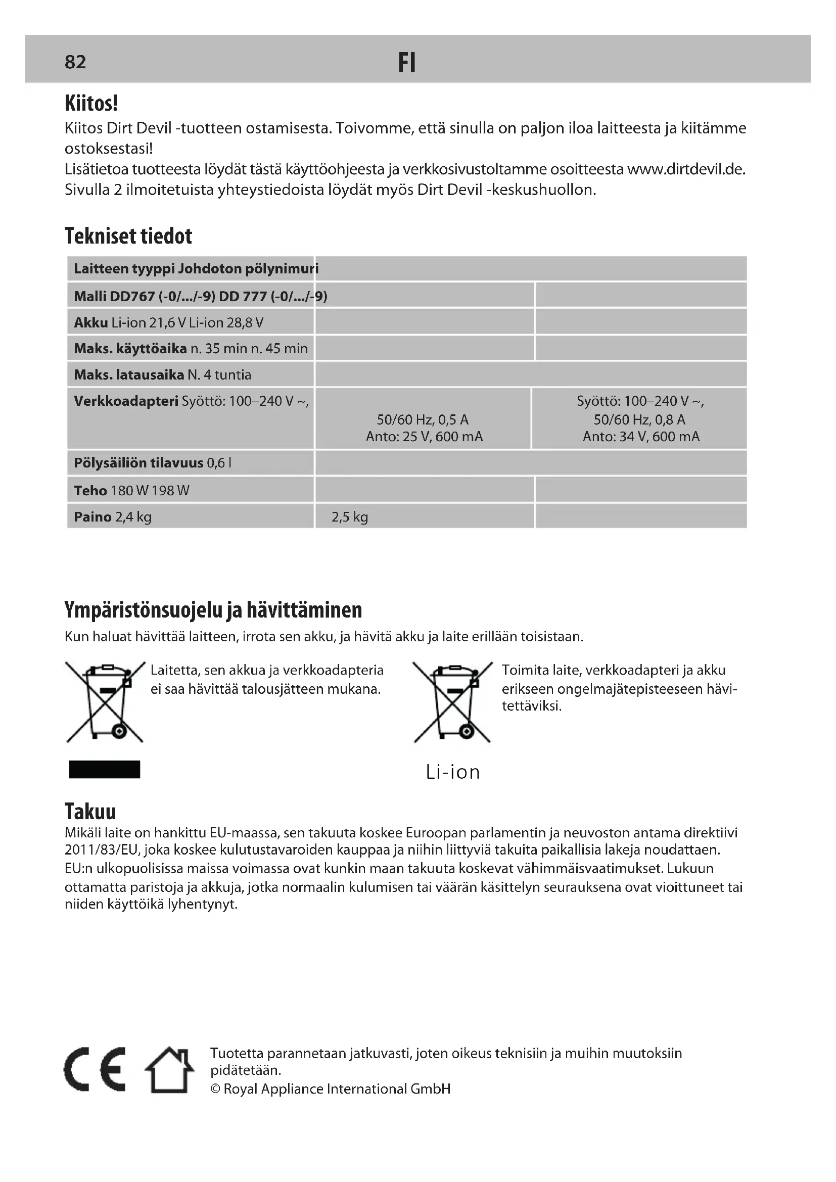 81Tuotetta parannetaan jatkuvasti, joten oikeus teknisiin ja muihin muutoksiin pidätetään.© Royal Appliance International GmbH Kiitos! Kiitos Dirt Devil -tuotteen ostamisesta. Toivomme, että sinulla on paljon iloa laitteesta ja kiitämme ostoksestasi! Lisätietoa tuotteesta löydät tästä käyttöohjeesta ja verkkosivustoltamme osoitteesta www.dirtdevil.de. Sivulla 2 ilmoitetuista yhteystiedoista löydät myös Dirt Devil -keskushuollon. Tekniset tiedot Laitteen tyyppi Johdoton pölynimuriMalli DD767 (-0/.../-9) DD 777 (-0/.../-9)Akku Li-ion 21,6 V Li-ion 28,8 VMaks. käyttöaika n. 35 min n. 45 minMaks. latausaika N. 4 tuntiaVerkkoadapteri Syöttö: 100–240 V ~, 50/60 Hz, 0,5 A Anto: 25 V, 600 mASyöttö: 100–240 V ~, 50/60 Hz, 0,8 A Anto: 34 V, 600 mAPölysäiliön tilavuus 0,6 lTeho 180 W 198 WPaino 2,4 kg 2,5 kg Ympäristönsuojelu ja hävittäminen Kun haluat hävittää laitteen, irrota sen akku, ja hävitä akku ja laite erillään toisistaan.Laitetta, sen akkua ja verkkoadapteria ei saa hävittää talousjätteen mukana.Toimita laite, verkkoadapteri ja akku erikseen ongelmajätepisteeseen hävi-tettäviksi. Takuu Mikäli laite on hankittu EU-maassa, sen takuuta koskee Euroopan parlamentin ja neuvoston antama direktiivi 2011/83/EU, joka koskee kulutustavaroiden kauppaa ja niihin liittyviä takuita paikallisia lakeja noudattaen. EU:n ulkopuolisissa maissa voimassa ovat kunkin maan takuuta koskevat vähimmäisvaatimukset. Lukuun ottamatta paristoja ja akkuja, jotka normaalin kulumisen tai väärän käsittelyn seurauksena ovat vioittuneet tai niiden käyttöikä lyhentynyt. Li-ion
