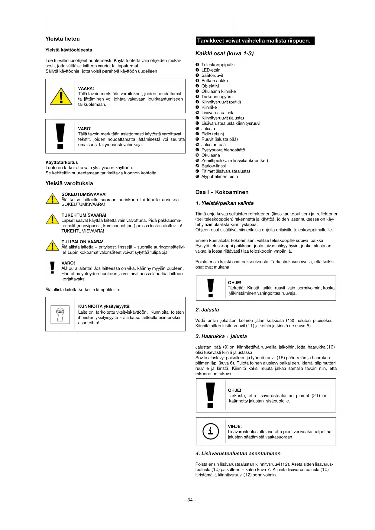 Tämä ohje kuvaa sellaisten refraktorien (linssikaukoputkien) ja reflektorien (peiliteleskooppien) rakennetta ja käyttöä, joiden asennuksessa on käy- tetty azimutaalista kiinnitystapaa. Ohjeen osat sisältävät siis erilaisia ohjeita erilaisille teleskooppimalleille. Ennen kuin aloitat kokoamisen, valitse teleskoopille sopiva paikka. Pystytä teleskooppi paikkaan, josta taivas näkyy hyvin, jonka alusta on vakaa ja jossa riittävästi tilaa teleskoopin ympärillä. Poista ensin kaikki osat pakkauksesta. Tarkasta kuvan avulla, että kaikki osat ovat mukana. OHJE! Tärkeää: Kiristä kaikki ruuvit vain sormivoimin, koska ylikiristäminen vahingoittaa ruuveja.