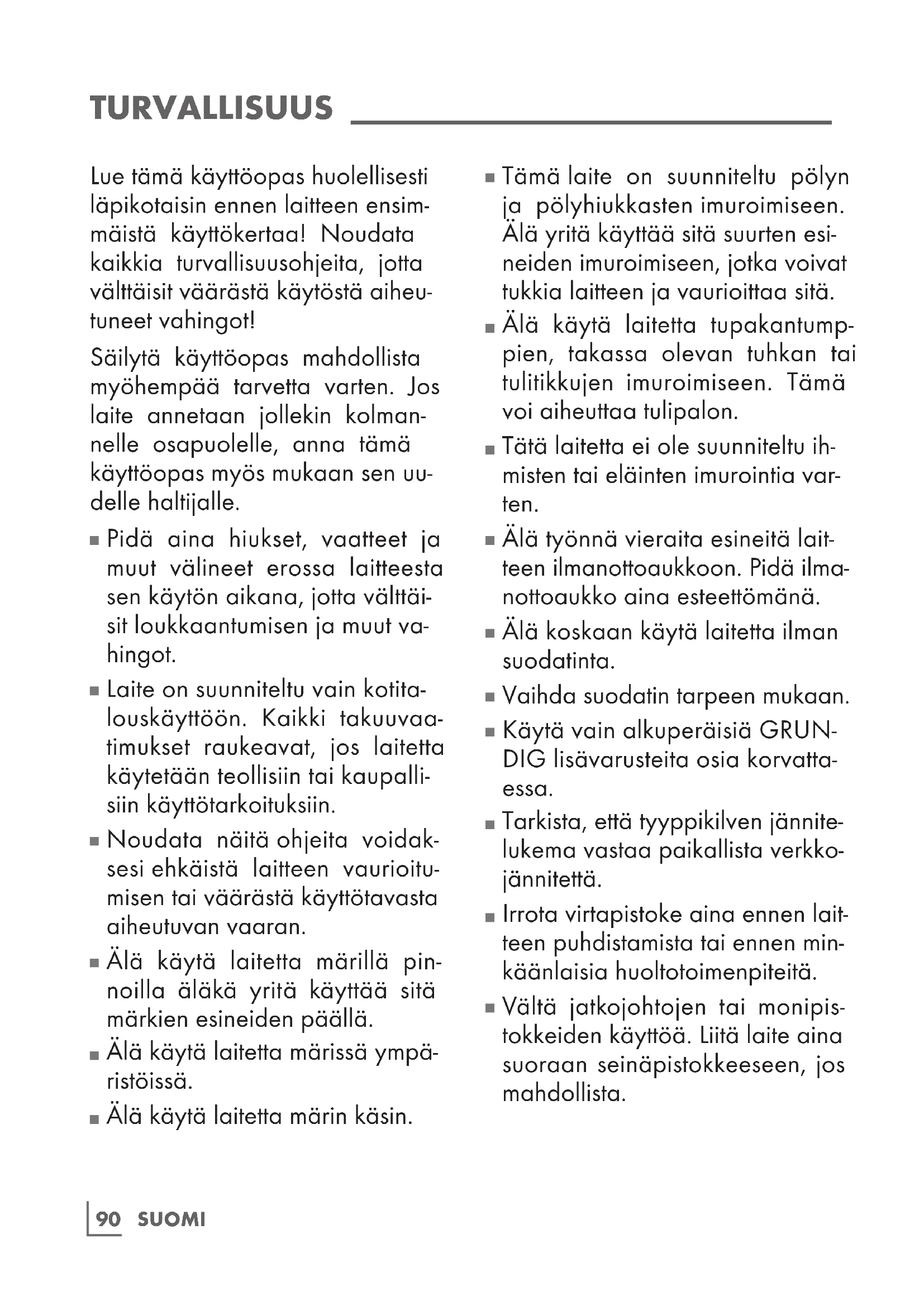 GRUNDIG-kotitalouslaitteemme ovat kaikkien soveltuvien turval- lisuusstandardien mukaisia. Jos laite tai sen virtajohto vaurioituu, sen korjaaminen tai vaihtaminen on jätettävä jälleenmyyjälle, huoltokeskukselle tai vastaavalle pätevälle ja valtuutetulle huolto- teknikolle vaarojen välttämiseksi. Väärin tehty tai valtuuttamaton korjaus voi aiheuttaa käyttäjälle vaaran.