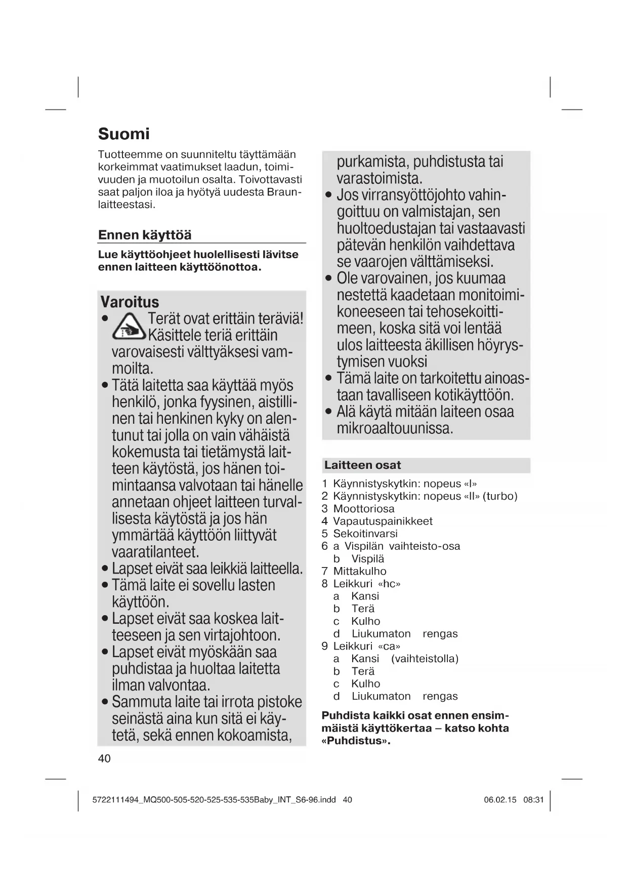 ruoan poistamista. Käännä terää hieman ja vedä se irti. Valmistusohje-esimerkki: Vaniljalla ja hunajalla maustetut kuivatut luumut (pannukakkujen täytteeksi tai levitteeksi) Laita 40 g paksua hunajaa ja 40 g kuivat- tuja luumuja leikkurin «hc» kulhoon. Hienonna 4 sekuntia nopeudella «II». Lisää joukkoon 10 ml (vaniljalla maustet- tua) vettä ja jatka hienontamista vielä 1 sekunti. Puhdistus (katso B) Puhdista moottoriosa (3) ja vispilän vaih- teisto-osa (6a) ainoastaan pyyhkimällä kostealla liinalla. Puhdista leikkurin «ca» kansi (9a) ainoas- taan juoksevassa vedessä. Älä pese sitä astianpesukoneessa. Kaikki muut osat voi pestä astianpesu- koneessa. Voit poistaa liukumattoman renkaan leikkurin kulhoista erittäin perusteellista puhdistusta varten. Lisäosat saattavat värjääntyä käsitelles- säsi runsaasti pigmenttiä sisältäviä ruoka-aineita (esim. porkkanoita). Pyyhi nämä osat ruokaöljyllä ennen varsinaista pesua. Lisäosat (ostettavissa erikseen, ei saatavana kaikissa maissa) MQ 10: Vispilä kerman ja munanval- kuaisten vatkaukseen ja jälkiruokien sekoitukseen. MQ 20: 350 ml:n leikkuri esim. yrttien, sipulin, valkosipulin, chilin ja pähkinöiden hienon- tamiseen. MQ 40: 1250 ml:n leikkuri hienon- tamiseen ja sekoittamiseen sekä jään murskaamiseen. MQ 70: Kompakti keittiölaitteen lisäosa hienontamiseen, sekoittamiseen, viipalointiin ja silppuamiseen. Vaivaustoiminto ei käytettä- vissä Multiquick 5 -laitteessa. Tiedot voivat muuttua ilman ennakkoilmoitusta. Kun laite on tullut elinkaarensa päähän, älä hävitä sitä kotitalousjätteiden mukana. Hävitä tuote viemällä se Braun- huoltoliikkeeseen tai asianmukaiseen keräyspisteeseen. 5722111494_MQ500-505-520-525-535-535Baby_INT_S6-96.indd 425722111494_MQ500-505-520-525-535-535Baby_INT_S6-96.indd 42 06.02.15 08:3106.02.15 08:3143 Nasze produkty spełniają najwyższe standardy jakości, funkcjonalności oraz wzornictwa. Mamy nadzieję, że korzysta- nie z tego urządzenia firmy Braun będzie przyjemnością. Przed użyciem Przed użyciem urządzenia uważnie przeczytaj wszystkie instrukcje. Uwaga