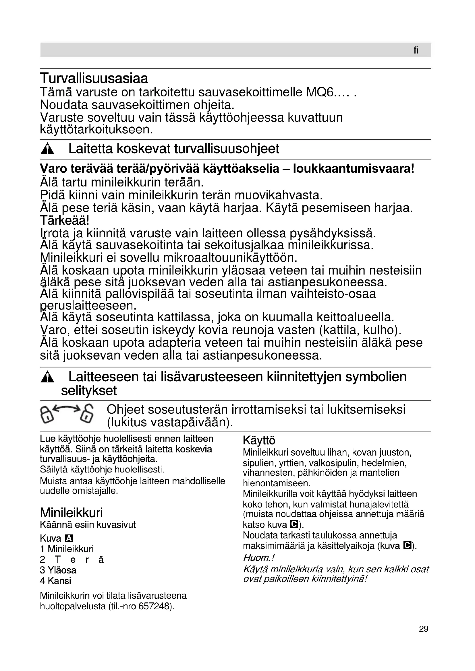Rätten till ändringar förbehålles.29 Turvallisuusasiaa Tämä varuste on tarkoitettu sauvasekoittimelle MQ6.… . Noudata sauvasekoittimen ohjeita. Varuste soveltuu vain tässä käyttöohjeessa kuvattuun käyttötarkoitukseen. , Laitetta koskevat turvallisuusohjeet Varo terävää terää/pyörivää käyttöakselia – loukkaantumisvaara! Älä tartu minileikkurin terään. Pidä kiinni vain minileikkurin terän muovikahvasta. Älä pese teriä käsin, vaan käytä harjaa. Käytä pesemiseen harjaa. Tärkeää! Irrota ja kiinnitä varuste vain laitteen ollessa pysähdyksissä. Älä käytä sauvasekoitinta tai sekoitusjalkaa minileikkurissa. Minileikkuri ei sovellu mikroaaltouunikäyttöön. Älä koskaan upota minileikkurin yläosaa veteen tai muihin nesteisiin äläkä pese sitä juoksevan veden alla tai astianpesukoneessa. Älä kiinnitä pallovispilää tai soseutinta ilman vaihteisto-osaa peruslaitteeseen. Älä käytä soseutinta kattilassa, joka on kuumalla keittoalueella. Varo, ettei soseutin iskeydy kovia reunoja vasten (kattila, kulho). Älä koskaan upota adapteria veteen tai muihin nesteisiin äläkä pese sitä juoksevan veden alla tai astianpesukoneessa. , Laitteeseen tai lisävarusteeseen kiinnitettyjen symbolien selitykset Ohjeet soseutusterän irrottamiseksi tai lukitsemiseksi (lukitus vastapäivään). Lue käyttöohje huolellisesti ennen laitteen käyttöä. Siinä on tärkeitä laitetta koskevia turvallisuus- ja käyttöohjeita.Säilytä käyttöohje huolellisesti.Muista antaa käyttöohje laitteen mahdolliselle uudelle omistajalle. Minileikkuri Käännä esiin kuvasivutKuva 1 Minileikkuri2Terä3 Yläosa4 KansiMinileikkurin voi tilata lisävarusteena huoltopalvelusta (til.-nro 657248). Käyttö Minileikkuri soveltuu lihan, kovan juuston, sipulien, yrttien, valkosipulin, hedelmien, vihannesten, pähkinöiden ja mantelien hienontamiseen. Minileikkurilla voit käyttää hyödyksi laitteen koko tehon, kun valmistat hunajalevitettä (muista noudattaa ohjeissa annettuja määriä katso kuva ).Noudata tarkasti taulukossa annettuja maksimimääriä ja käsittelyaikoja (kuva ). Huom.!Käytä minileikkuria vain, kun sen kaikki osat ovat paikoilleen kiinnitettyinä! fi30 Varoitus! Poista lihasta ennen hienontamista rustot, luut ja jänteet. Minileikkuri ei sovellu erittäin kovien ainesten (kahvinpapujen, retikan, muskottipähkinöiden) tai jäisten ainesten (marjojen/hedelmien tms.) hienontamiseen. Kuva Aseta minileikkuri sileälle ja puhtaalle työtasolle ja paina kiinni pintaan. Kiinnitä terä. Täytä elintarvikkeet leikkuriin. Huom.! Minileikkurin terän tulee olla suorassa, jotta yläosa menee oikein paikoilleen (kuva=